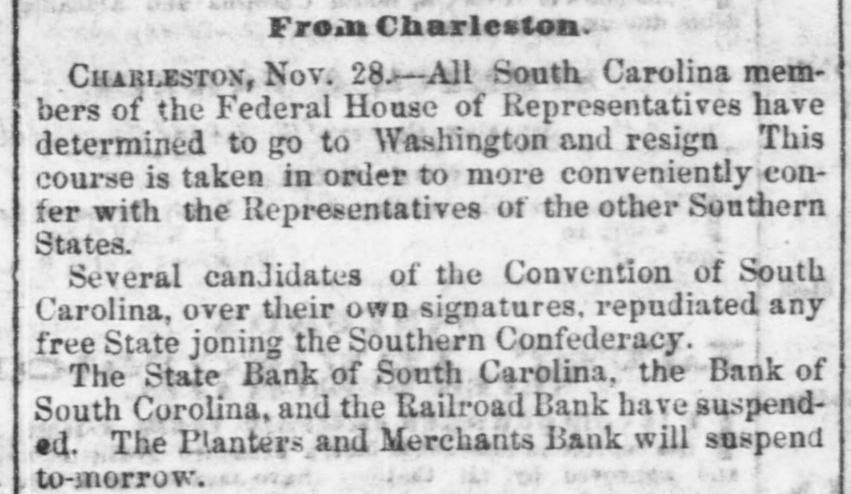 From Charleston CHARLESTON, Nov. 28.-All South Carolina members of the Federal House of Representatives have determined to go to Washington and resign This course is taken in order to more conveniently confer with the Representatives of the other Southern States. Several candidates of the Convention of South Carolina, over their own signatures, repudiated any free State joning the Southern Confederacy. The State Bank of South Carolina, the Bank of South Corolina, and the Railroad Bank have suspended. The Planters and Merchants Bank will suspend to-morrow.