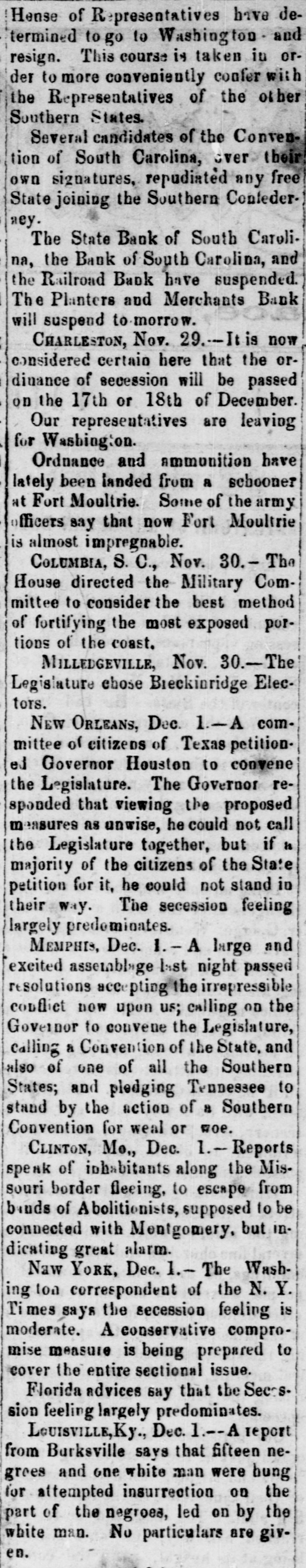Hense of Representatives have determined to go to Washington and resign. This course is taken in order to more conveniently confer with the Representatives of the other Southern States. Several candidates of the Convention of South Carolina, over their own signatures, repudiated any free State joining the Southern Confederney. The State Bank of South Carolina, the Bank of South Carolina, and the Railroad Bank have suspended. The Planters and Merchants Bank will suspend to-morrow. CHARLESTON, Nov. 29.-It is now considered certain here that the ordinance of secession will be passed on the 17th or 18th of December. Our representatives are leaving for Washington. Ordnance and ammunition have lately been landed from a schooner at Fort Moultrie. Some of the army officers say that now Fort Moultrie is almost impregnable. COLUMBIA, S. C., Nov. 30. - The House directed the Military Committee to consider the best method of fortifying the most exposed portions of the coast. MILLEDGEVILLE, Nov. 30.-The Legislature chose Breckinridge Electors. New ORLEANS, Dec. 1.-A committee of citizens of Texas petitioned Governor Houston to convene the Legislature. The Governor responded that viewing the proposed measures as unwise, he could not call the Legislature together, but if is majority of the citizens of the State petition for it, he could not stand in their way. The secession feeling largely predominates. MEMPHIS, Dec. 1. A large and excited assetabløge last night passed resolutions accepting the irrepressible conflict now upon us; calling on the Governor to convene the Legislature, calling a Convention of the State, and also of one of all the Southern States; and pledging Tennessee to stand by the action of a Southern Convention for weal or woe. CLINTON, Mo,, Dec. 1.-- Reports speak of inhabitants along the Missouri border fleeing, to escape from binds of Abolitionists, supposed to be connected with Montgomery, but indicating great alarm. Naw YORK, Dec. 1.- The Washing ton correspondent of the N. Y. Times says the secession feeling is moderate. A conservative compromise measure is being prepared to cover the entire sectional issue. Florida advices say that the Secrssion feeling largely predominates. Louisville,Ky., Dec. 1.--A report from Burksville says that fifteen negrees and one white man were bung for attempted insurrection on the part of the negroes, led on by the white man. No particulars are given.