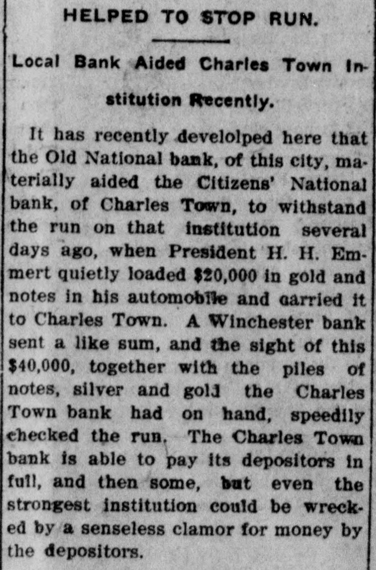 BANK IN SERIOUS TROUBLE S RUN ON THE CITIZENS NATIONAL AT CHARLES TOWN. Internal Dissensions May Result in the Institution Shortly Closing Its Doors. 1 A message to The Herald Wednesday from Charles Town says: The well known Citizens Bank of that place, one of the most prominent financial institutions in Jefferson county, is in serious trouble as a result of Internal dissensions, and that a heavy run, started Tuesday morning and continued today, may result in the ruin of the bank. It has developed during the past day or two that there has been a struggle for control of the institution going on for some time past between President Lewis D. Getzendanner and his sup: porters on the one side and several of the directors on the other. It. is said that President Getzendanner owes the bank about $35,000 of borrowed funds, and that there was a threat made to the effect that if he did not resign the presidency the directors would force the bank into voluntary liquidation. In order to meet this Situation President Getzendanner secur ed enough proxies of stockholders to force the retirement of five members of the board of directors at the recent annual meeting, and apparently hela control of the situation. However, on Saturday night a secret meeting of the directors was held, at which time the threat to force the bank into liquidation was renewed. Following this, President Getzendanner executed a deed of trust for $30,000 on three farms, located near Kearneysville, but refused to make a deed for his property in Charles Town. In the meantime Cashier Turner resigned, and Gerrard D. Moore was elected to the position. Intelligence of the fight between the directors and the president leaked out, and the depositors became alarmed and started a run on the bank. All day Tuesday the run was continued, many deposit1 ors going to the bank and demanding their money. Considerable cash was 1 on hand. and this enabled the bank to meet all demands. Today the run was continued. but there is a strong feel1 ing prevailing that unless the run is ( speedily checked the bank will be M compelled to close its doors. Getzendanner Resigns. Late Wednesday afternoon, a mesage to The Herald stated that a i compromise among the warring faci tions had been reached. and that Mr. Getzendanner had resigned the presa dency of the bank. Mr. B. D. Gibson TO being elected in his place. It was also stated that the bank would I weather the crisis, and would con1 tinue to do business.