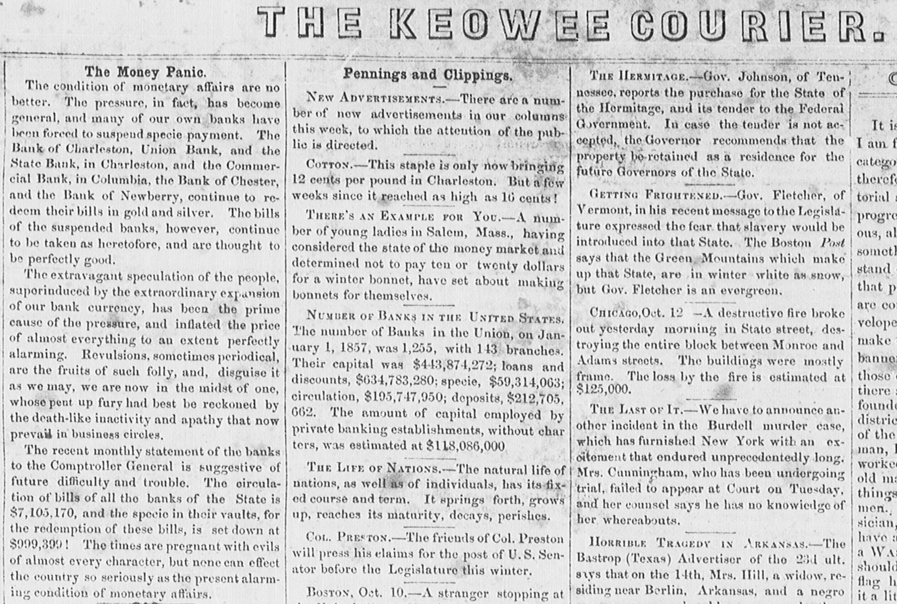 THE KEOWEE COURIER. The Money Panic. THE HERMITAGE.-Gov. Johnson, of TenPennings and Clippings. The condition of monetary affairs are no nessee, reports the purchase for the State of NEW ADVERTISEMENTS-There are a numbetter. The pressure, in fact, has become the Hermitage, and its tender to the Federal ber of new advertisements in our columns general, and many of our own banks have Government. In case the tender is not acIt is this week, to which the attention of the pubbeen forced to suspend specie payment. The cepted, the Governor recommends that the I am f lic is directed. Bank of Charleston, Union Bank, and the property be retained as a residence for the catego State Bank, in Charleston, and the CommerCorron.-This staple is only now bringing future Governors of the State. theref 12 cents por pound in Charleston. But a few cial Bank, in Columbia, the Bank of Chester, GETTING FRIGHTENED.-Gov. Fletcher, of torial = and the Bank of Newberry, continue to reweeks since it reached as high as 16 cents! Vermont, in his recent message to the Legisladeem their bills in gold and silver. The bills THERE'S AN EXAMPLE FOR You.-A numprogre ture expressed the fear that slavery would be of the suspended banks, however, continue ous, al ber of young ladies in Salem, Mass., having introduced into that State. The Boston Post to be taken as heretofore, and are thought to considered the state of the money market and somet] says that the Green Mountains which make be perfectly good. determined not to pay ten or twenty dollars stand up that State, are in winter white as snow, The extravagant speculation of the people, for a winter bonnet, have set about making that p but Gov. Fletcher is an evergreen. bonnets for themselves. suporinduced by the extraordinary expansion are co of our bank currency, has been the prime CHICAGO, Oct. 12 -A destructive fire broke NUMBER OF BANKS IN THE UNITED STATES. velope cause of the pressure, and inflated the price out yesterday morning in State street, desThe number of Banks in the Union, on Janmake of almost everything to an extent perfectly troying the entire block between Monroe and uary 1, 1857, was 1,255, with 143 branches. banner alarming. Revulsions, sometimes periodical, Adams streets. The buildings were mostly Their capital was $443,874,272; loans and are the fruits of such folly, and, disguise it those frame. The loss by the fire is estimated at discounts, $634,783,280; specie, $59,314,063; as we may, we are now in the midst of one, $125,000. there = circulation, $195,747,950; deposits, $212,705, founde whose pent up fury had best be reckoned by THE LAST OF Ir.-We have to announce an662. The amount of capital employed by distric the death-like inactivity and apathy that now other incident in the Burdell murder case, private banking establishments, without char of the prevail in business circles. which has furnished New York with an exters, was estimated at $118,086,000 man, I The recent monthly statement of the banks oitement that endured unprecedentedly long. worke to the Comptroller General is suggestive of THE LIFE OF NATIONS.-The natural life of Mrs. Canningham, who has been undergoing old ma future difficulty and trouble. The circulanations, as well as of individuals, has its fixtrial, failed to appear at Court on Tuesday, things tion of bills of all the banks of the State is ed course and term. It springs forth, grows and her counsel says he has no knowiedge of men., $7,105,170, and the specie in their vaults, for up, reaches its maturity, decays, perishes. her whereabouts. sician, the redemption of these bills, is set down at have a Con. PRESTON.-The friends of Col. Preston HORRIBLE TRAGEDY IN ARKANSAS.-The $999,3991 The times are pregnant with evils a WA will press his claims for the post of U.S. SenBastrop (Texas) Advertiser of the 23d ult. of almost every character, but none can effect should ator before the Legislature this winter. says that on the 14th, Mrs. IIill, a widow, rethe country SO seriously as the present alarmflag h siding near Berlin, Arkansas, and a negro ing condition of monetary affairs. it a lit BOSTON, Oct. 10.-A stranger stopping at