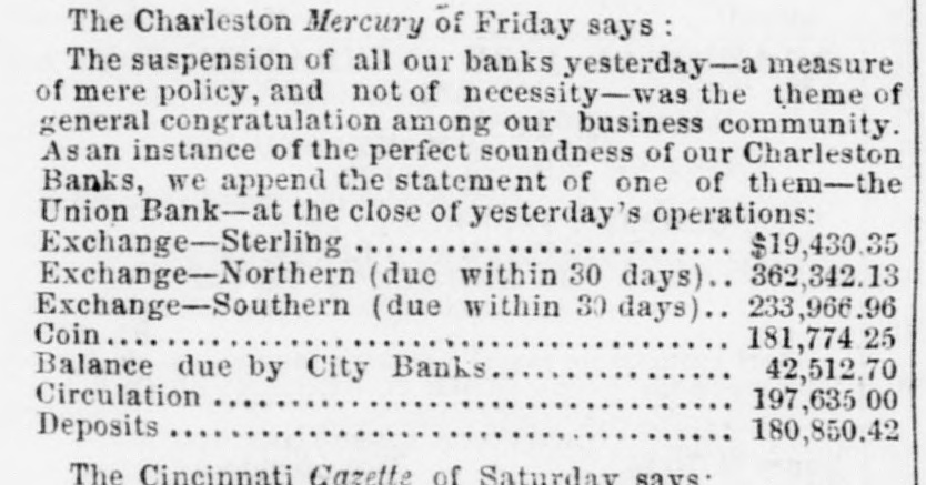: The Charleston Mercury of Friday says The suspension of all our banks yesterday- a measure of mere policy, and not of necessity-was the theme of general congratulation among our business community. Asan instance of the perfect soundness of our Charleston Banks, we append the statement of one of them--the Union Bank-at the close of yesterday's operations: Exchange-Sterling $19,430.35 362,342.13 Exchange-Northern (due within 30 days) 233,966.96 Exchange-Southern (due within 30 days) Coin 181,774.25 Balance due by City Banks 42,512.70 Circulation 197,635 00 Deposits 180,850.42 The Cincinnati Cazette of Saturday savs