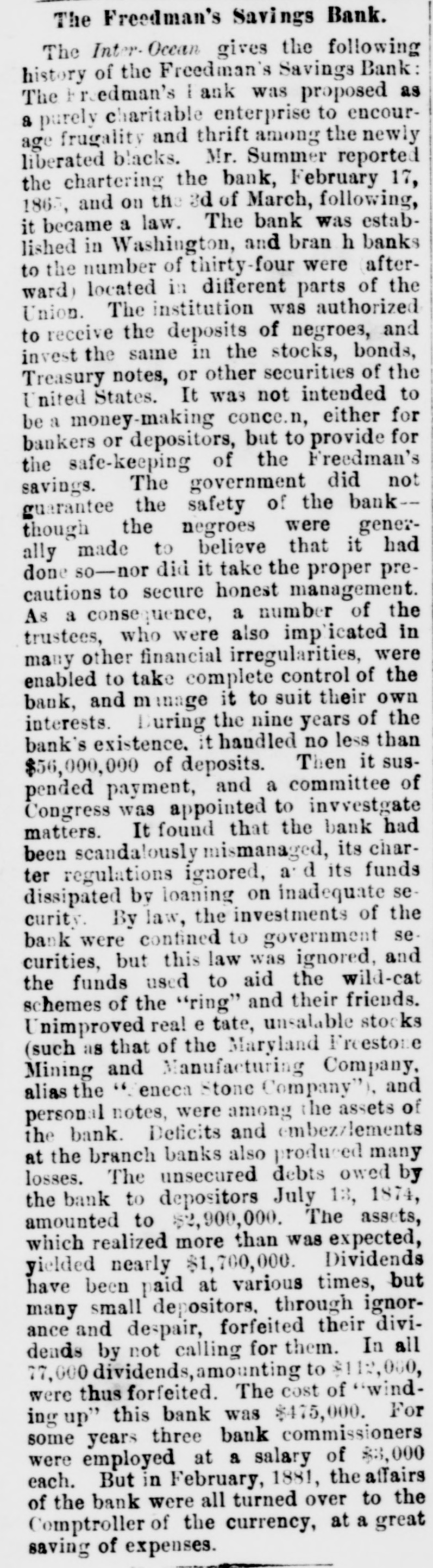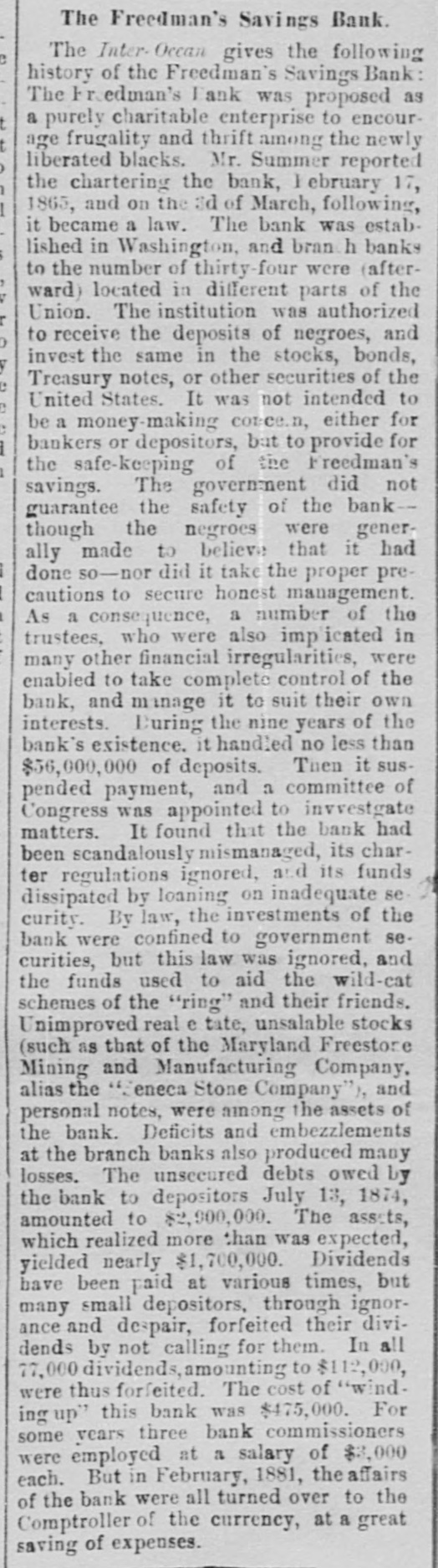 The Freedman's Savings Bank. The Inter- Occan gives the following history of the Freedman's Savings Bank: The tedman's Bank was proposed as a purely charitable enterprise to encourage frugality and thrift among the newly liberated blacks. Mr. Summer reported the chartering the bank, I ebruary 17, 1865, and on the 3d of March, following, it became a law. The bank was established in Washington, and bran h banks to the number of thirty-four were (afterward) located in different parts of the Union. The institution was authorized to receive the deposits of negroes, and invest the same in the stocks, bonds, Treasury notes, or other securities of the United States. It was not intended to be a money-making corce.n, either for bankers or depositors, but to provide for the safe-keeping of the Freedman's savings. The government did not guarantee the safety of the bank-though the negroes were generally made to believe that it had done so-nor did it take the proper precautions to secure honest management. As a consequence, a number of the trustees, who were also implicated in many other financial irregularities, were enabled to take complete control of the bank, and manage it to suit their own interests. During the nine years of the bank's existence. it handled no less than $56,000,000 of deposits. Then it suspended payment, and a committee of Congress was appointed to invvestgate matters. It found that the bank had been scandalously mismanaged, its charter regulations ignored, and its funds dissipated by loaning on inadequate security. By law, the investments of the bank were confined to government securities, but this law was ignored, and the funds used to aid the wild-cat schemes of the "ring" and their friends. Unimproved real e tate, unsalable stocks (such as that of the Maryland Freestore Mining and Manufacturing Company, alias the "Zeneca Stone Company"), and personal notes, were among the assets of the bank. Deficits and embezzlements at the branch banks also produced many losses. The unsecured debts owed by the bank to depositors July 13, 1874, amounted to $2,900,000. The assets, which realized more than was expected, yielded nearly $1,700,000. Dividends have been paid at various times, but many small depositors, through ignorance and despair, forfeited their dividends by not calling for them. In all 77,000 dividends, amounting to $112,000, were thus forfeited. The cost of "windup" this bank was $475,000. For some years three bank commissioners were employed at a salary of $3,000 each. But in February, 1881, the affairs of the bank were all turned over to the Comptroller of the currency, at a great saving of expenses.