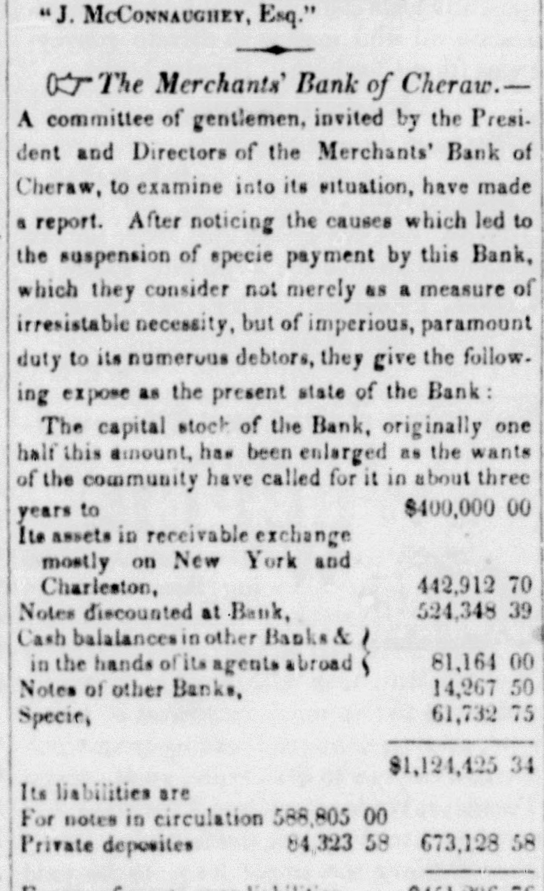 Merchants' Bank of So. Ca. AT CHERAW, MAY 19, 1837. At a special meeting of the Board of Direct. ors this day, the following resolutions were unanimously adopted : Whereas the Banks in New York, Boston, Philadelphia, Baltimore, Norfolk, Charleston and Mobile, besides many others out of this State, and the other Banks within this State, have suspended specie paymentsAnd whereas it would be injurious to the in. terest of this Bank to continue to pay specie for its Bills, while the other Banks refuse to do so. It is therefore. Resolved, That this Bank suspend payment in specie, until the further action of this Board. Resolved further, That this Bank will not increase its' issues above what they now are, du. ring the period for which specie payments are suspended. J. WRIGHT, President. if 28 May 24
