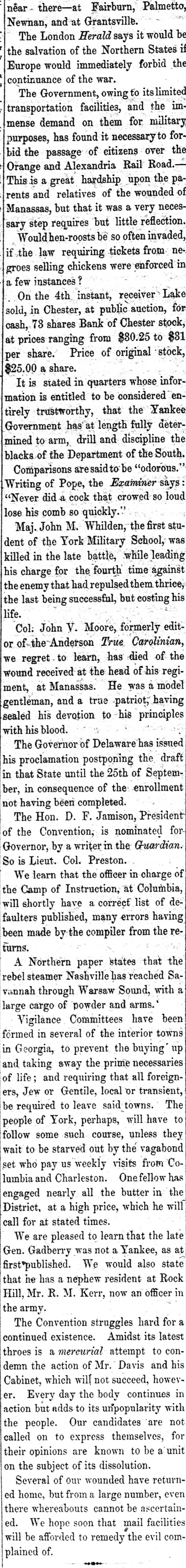 near there-at Fairburn, Palmetto, and at London Herald says it be Newnan, The Grantsville. would States the salvation of the Northern if Europe would immediately forbid the continuance of the war. The Government, owing to its slimited transportation facilities, and the immense demand on them for military purposes, has found it necessary to forbid the passage of citizens over the Orange and Alexandria Rail Road.This is a great hardship upon the parents and relatives of the wounded of Manassas, but that it was a very necessary step requires but little reflection. Wouldhen-roosts be so often invaded, if the law requiring tickets from negroes selling chickens were enforced in a few instances On the 4th instant, receiver Lake sold, in Chester, at public auction, for cash, 73 shares Bank of Chester stock, at prices ranging from $30.25 to $31 per share. Price of original stock, $25.00 a share. It is stated in quarters whose information is entitled to be considered entirely trustworthy, that the Yankee Government has at length fully determined to arm, drill and discipline the blacks of the Department of the South. Comparisons aresaidto be "odorous. Writing of Pope, the Examiner says "Never did a cock that crowed so loud lose his comb so quickly." Maj. John M. Whilden, the first student of the York Military School, was killed in the late battle, while leading his charge for the fourth time against the enemy that had repulsed them thrice the last being successful, but costing his life. Col. John V. Moore, formerly editor of the Anderson True Carolinian, we regret to learn, has died of the wound received at the head of his regiment, at Manassas. He was a model gentleman, and a true patriot, having sealed his devotion to his principles with his blood. The Governor of Delaware has issued his proclamation postponing the draft in that State until the 25th of September, in consequence of the enrollment not having been completed. The Hon. D. F. Jamison, President for of the Convention, is nominated Governor, by a writer in the Guardian. So is Lieut. Col. Preston. We learn that the officer in charge of the Camp of Instruction, at Columbia, will shortly have a correct list of defaulters published, many errors having been made by the compiler from the returns. A Northern paper states that the rebel steamer Nashville has reached Savannah through Warsaw Sound, with a large cargo of powder and arms. Vigilance Committees have been formed in several of the interior towns in Georgia, to prevent the buying up and taking away the prime necessaries of life; and requiring that all foreignJew or Gentile, local or be to leave said towns. ers, required transient, The people of York, perhaps, will have to follow some such course, unless they wait to be starved out by the vagabond set who pay us weekly visits from Columbia and Charleston. One fellow has engaged nearly all the butter in the District, at a high price, which he will call for at stated times. We are pleased to learn that the late Gen. Gadberry was not a Yankee, as at first*published. We would also state that he has a nephew resident at Rock Hill, Mr. R. M. Kerr, now an officer in the army. The Convention struggles hard for a continued existence. Amidst its latest throes is a mercurial attempt to condemn the action of Mr. Davis and his Cabinet, which will not succeed, however. Every day the body continues in action but adds to its unpopularity with the people. Our candidates are not called on to express themselves, for their opinions are known to be a unit on the subject of its dissolution. Several of our wounded have returned home, but from a large number, even there whereabouts cannot be ascertained. We hope soon that mail facilities will be afforded to remedy the evil com plained of.