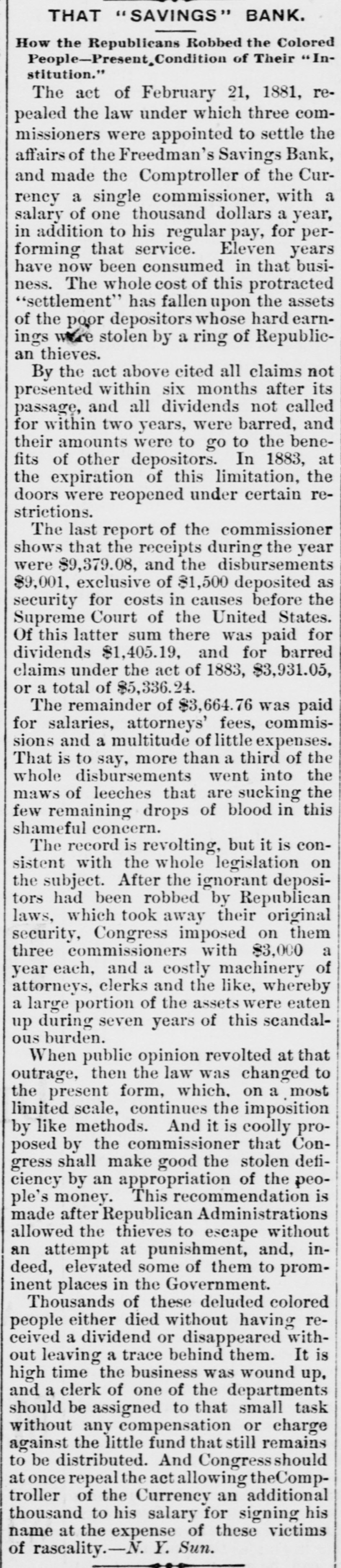 THAT "SAVINGS" BANK. How the Republicans Robbed the Colored People-Present, Condition of Their "Institution." The act of February 21, 1881, repealed the law under which three commissioners were appointed to settle the affairs of the Freedman's Savings Bank, and made the Comptroller of the Currency a single commissioner, with a salary of one thousand dollars a year, in addition to his regular pay, for performing that service. Eleven years have now been consumed in that business. The whole cost of this protracted "settlement" has fallen upon the assets of the poor depositors whose hard earnings we stolen by a ring of Republican thieves. By the act above cited all claims not presented within six months after its passage, and all dividends not called for within two years, were barred, and their amounts were to go to the benefits of other depositors. In 1883, at the expiration of this limitation, the doors were reopened under certain restrictions. The last report of the commissioner shows that the receipts during the year were $9,379.08, and the disbursements $9,001, exclusive of $1,500 deposited as security for costs in causes before the Supreme Court of the United States. Of this latter sum there was paid for dividends $1,405.19, and for barred claims under the act of 1883, $3,931.05, or a total of $5,336.24. The remainder of $3,664.76 was paid for salaries, attorneys' fees, commissions and a multitude of little expenses. That is to say, more than a third of the whole disbursements went into the maws of leeches that are sucking the few remaining drops of blood in this shameful concern. The record is revolting, but it is consistent with the whole legislation on the subject. After the ignorant depositors had been robbed by Republican laws, which took away their original security, Congress imposed on them three commissioners with $3,000 a year each, and a costly machinery of attorneys, clerks and the like, whereby a large portion of the assets were eaten up during seven years of this scandalous burden. When public opinion revolted at that outrage, then the law was changed to the present form, which. on a most limited scale, continues the imposition by like methods. And it is coolly proposed by the commissioner that Congress shall make good the stolen deficiency by an appropriation of the people's money. This recommendation is made after Republican Administrations allowed the thieves to escape without an attempt at punishment, and, indeed, elevated some of them to prominent places in the Government. Thousands of these deluded colored people either died without having received a dividend or disappeared without leaving a trace behind them. It is high time the business was wound up, and a clerk of one of the departments should be assigned to that small task without any compensation or charge against the little fund that still remains to be distributed. And Congress should at once repeal the act allowing theComptroller of the Currency an additional thousand to his salary for signing his name at the expense of these victims of rascality.-N. Y. Sun.