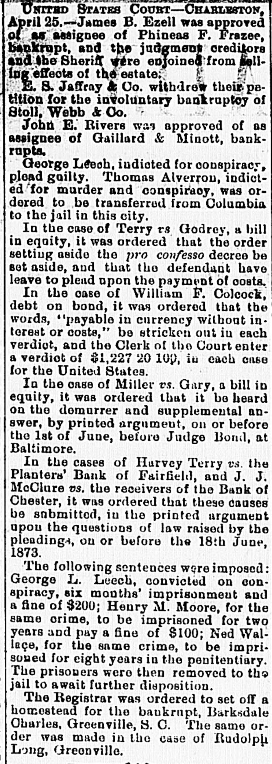 UNITED STATES COURT-CHARLESTON, April 25.-James B. Ezell was approved of as assignee of Phineas F. Frazee, bankrupt, and the judgment creditors and the Sheriff were enjoine&from Helling effects of the estate: E. S. Jaffray & Co. withdrew their petition for the involuntary bankruptoy of Stoll, Webb & Co. John E. Rivers was approved of as assignee of Gaillard & Minott, bankrupts. George Leech, indicted for conspiracy, plead gailty. Thomas Alverron, indicted for murder and conspiracy, was ordered to be transferred from Columbia to the jail in this city. In the case of Terry rs Godrey, a bill in equity, it was ordered that the order setting aside the pro confesso decree be set aside, and that the defendant have leave to plead upon the payment of costs. In the case of William F. Colcock, debt on bond, it was ordered that the words, "payable in currency without intereat or costs," be stricken out in each verdiot, and the Clerk of the Court enter a verdiot of $1,227 20 100, in each case for the United States. In the case of Miller vs. Gary, a bill in equity, it was ordered that it be heard on the domurrer and supplemental answer, by printed argument, on or before the 1st of June, before Judge Bond, at Baltimore. In the cases of Hurvey Terry vs. the Planters' Bank of Fairfield, and J. J. McClure vs. the receivers of the Bank of Chester, it was ordered that these causes be submitted, in the printed argument upon the questions of law raised by the pleadings, on or before the 18th June, 1873. The following sentences were imposed: George L. Leech, convicted on conspiracy, six months' imprisonment and a fine of $200; Henry M. Moore, for the same orime, to be imprisoned for two years and pay a fine of $100; Ned Wallaçe, for the same crime, to be imprisomed for eight years in the penitentiary. The prisoners were then removed to the jail to await further disposition. The Registrar was ordered to set off a homestead for the baukrupt, Barksdale Obarles, Greenville, S.C. The same order was made in the case of Rudolph Long, Greenville.