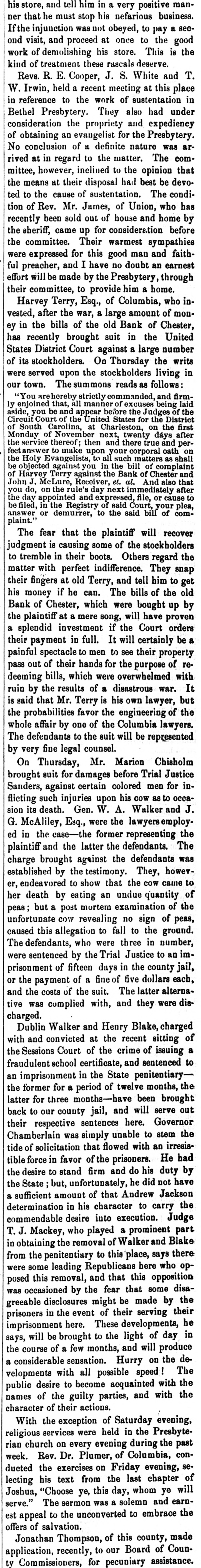 his store, and tell him in a very positive man- ner that he must stop his nefarious business. If the injunction was not obeyed, to pay a sec- ond visit, and proceed at once to the good work of demolishing his store. This is the kind of treatment these rascals deserve. Revs. R. E. Cooper, J. S. White and T. W. Irwin, held a recent meeting at this place in reference to the work of sustentation in Bethel Presbytery. They also had under consideration the propriety and expediency of obtaining an evangelist for the Presbytery. No conclusion of a definite nature was ar- rived at in regard to the matter. The com- mittee, however, inclined to the opinion that the means at their disposal had best be devo- ted to the cause of sustentation. The condi- tion of Rev. Mr. James, of Union, who has recently been sold out of house and home by the sheriff, came up for consideration before the committee. Their warmest sympathies were expressed for this good man and faith- ful preacher, and I have no doubt an earnest effort will be made by the Presbytery, through their committee, to provide him a home. Harvey Terry, Esq., of Columbia, who in- vested, after the war, a large amount of mon- ey in the bills of the old Bank of Chester, has recently brought suit in the United States District Court against a large number of its stockholders. On Thursday the writs were served upon the stockholders living in our town. The summons reads as follows: "You are hereby strictly commanded, and firm- ly enjoined that, all manner of excuses being laid aside, you be and appear before the Judges of the Circuit Court of the United States for the District of South Carolina, at Charleston, on the first Monday of November next, twenty days after the service thereof; then and there true and per- fect answer to make upon your corporal oath on the Holy Evangelists, to all such matters as shall be objected against you in the bill of complaint of Harvey Terry against the Bank of Chester and John J. McLure, Receiver, et. al. And also that you do, on the rule's day next immediately after the day appointed and expressed, file, or cause to be filed, in the Registry of said Court, your plea, answer or demurrer, to the said bill of com- plaint." The fear that the plaintiff will recover judgment is causing some of the stockholders to tremble in their boots. Others regard the matter with perfect indifference. They snap their fingers at old Terry, and tell him to get his money if he can. The bills of the old Bank of Chester, which were bought up by the plaintiff at a mere song, will have proven a splendid investment if the Court orders their payment in full. It will certainly be a painful spectacle to men to see their property pass out of their hands for the purpose of re- deeming bills, which were overwhelmed with ruin by the results of a disastrous war. It is said that Mr. Terry is his own lawyer, but the probabilities favor the engineering of the whole affair by one of the Columbia lawyers. The defendants to the suit will be represented by very fine legal counsel. On Thursday, Mr. Marion Chisholm brought suit for damages before Trial Justice Sanders, against certain colored men for in- flicting such injuries upon his cow as to occa- sion its death. Gen. W. A. Walker and J. G. McAliley, Esq., were the lawyers employ- ed in the case the former representing the plaintiff and the latter the defendants. The charge brought against the defendants was established by the testimony. They, howev- er, endeavored to show that the cow came to her death by eating an undue quantity of peas; but a post mortem examination of the unfortunate cow revealing no sign of peas, caused this allegation to fall to the ground. The defendants, who were three in number, were sentenced by the Trial Justice to an im- prisonment of fifteen days in the county jail, or the payment of a fine of five dollars each, and the costs of the suit. The latter alterna- tive was complied with, and they were dis- charged. Dublin Walker and Henry Blake, charged with and convicted at the recent sitting of the Sessions Court of the crime of issuing a fraudulent school certificate, and sentenced to an imprisonment in the State penitentiary- the former for a period of twelve months, the latter for three months have been brought back to our county jail, and will serve out their respective sentences here. Governor Chamberlain was simply unable to stem the tide of solicitation that flowed with an irresis- tible force in favor of the prisoners. He had the desire to stand firm and do his duty by the State; but, unfortunately, he did not have a sufficient amount of that Andrew Jackson determination in his character to carry the commendable desire into execution. Judge T. J. Mackey, who played a prominent part in obtaining the removal of Walker and Blake from the penitentiary to this place, says there were some leading Republicans here who op- posed this removal, and that this opposition was occasioned by the fear that some disa- greeable disclosures might be made by the prisoners in the event of their serving their imprisonment here. These developments, he says, will be brought to the light of day in the course of a few months, and will produce a considerable sensation. Hurry on the de- velopments with all possible speed! The public desire to become acquainted with the names of the guilty parties, and with the character of their actions. With the exception of Saturday evening, religious services were held in the Presbyte- rian church on every evening during the past week. Rev. Dr. Plumer, of Columbia, con- ducted the exercises on Friday evening, se- lecting his text from the last chapter of Joshua, "Choose ye, this day, whom ye will serve." The sermon was a solemn and earn- est appeal to the unconverted to embrace the offers of salvation. Jonathan Thompson, of this county, made application, recently, to our Board of Coun- ty Commissioners, for pecuniary assistance.