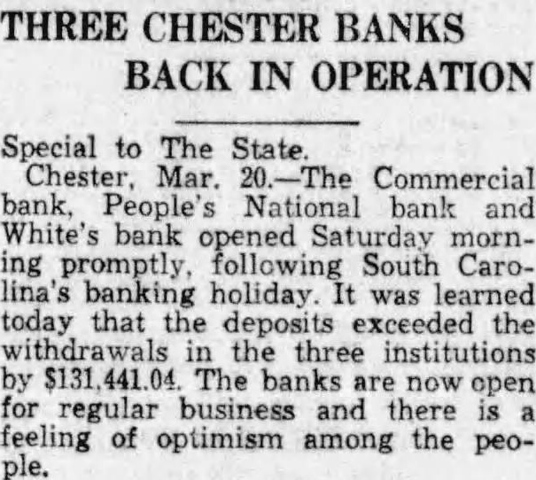 THREE CHESTER BANKS BACK IN OPERATION Special to The State. Chester, Mar. Commercial bank, People's National bank and White's bank opened morning promptly, following South Carobanking holiday was learned today that the deposits exceeded the the three institutions by The banks now open regular business and there feeling of optimism among the people.