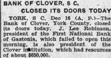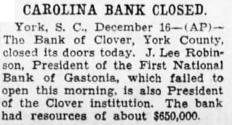 CAROLINA BANK CLOSED. York, S. C., December The Bank of Clover, York County, closed its doors today. J. Lee Robinson, President of the First National Bank of Gastonia, which failed to open this morning, is also President the Clover The bank resources of about $650,000.