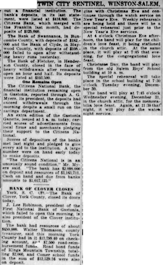 out a financial institution The bank's in its last ment, were listed at $416,800 The Citizens Bank which merged with the Franklin last month, had de posits of The Bank of Swannanoa, in Bun combe with deposits of $182.000 and the Bank of in Haywood County, with deposits of $105 000 failed open after withstanding heavy runs The Bank of Fletcher, Henderson closed in the face of heavy withdrawais after remaining open an hour and half. Its deposits were listed $103,500 One Remains Open The Citizens National Bank, the institution remaining open in reported through the deposits had exceed withdrawals through the despite small run on the savings An extra edition of the Gastonia ried scores of from local firms and merchants their support to the Citizens Na Scores of depositors of the banks met last night and pledged to every aid large number were on hand early today make "The Citizens National is an in sound Mr. on and due from banks to BANK OF CLOVER CLOSES York Bank of Clover, York County, closed its doors today Lee Robinson. president of the First National Bank of Gastonia, which failed open this morning. president of the Clover institution. The bank had resources of about $650,000. Walter Thomason, county treasurer, said York County had in on checkbursement funds. Road bond funds of Kings $2,000 Mountain Township, totalling and Comer funds in the sum of $12,529.16 were also gins with Christmas Eve and con tinues through the watch service on New Year'e Eve Weekly rehearsals are being held and there will be special rehearsal just prior to the New Year's services At o'clock Christmas Eve after. noon. the band will play for the dren's love feast. it being stationed in the church attic. the same place. will play 7:45 that ning. for the congregational love Christmas Day. the band will play from the old Salem Boys School building at 10 The special rehearsal will take place in the building at 7:30 o'clock Tuesday evening. December 30. The band will play at 7:45 o'clock the church attic, for the memorabilia love feast. Again, night, will play for the watch night