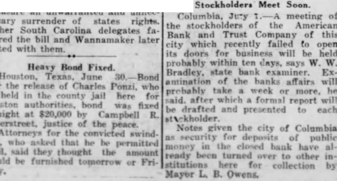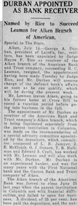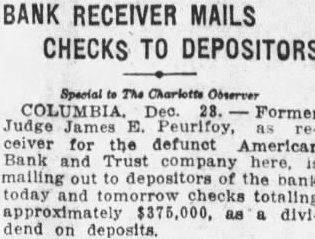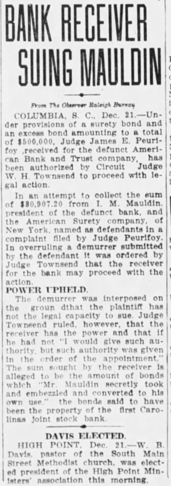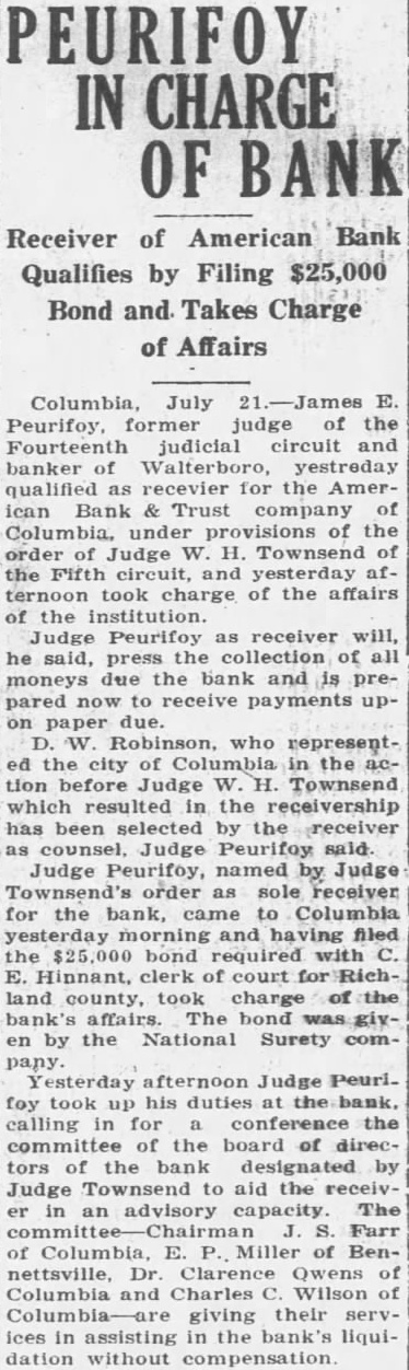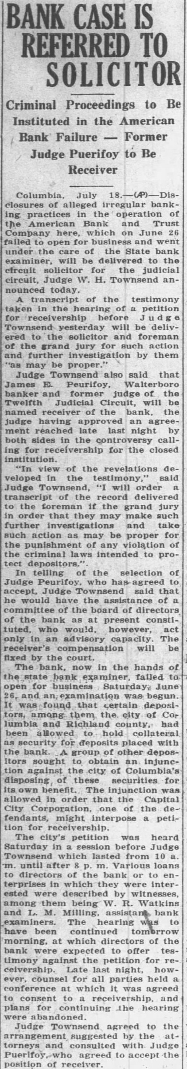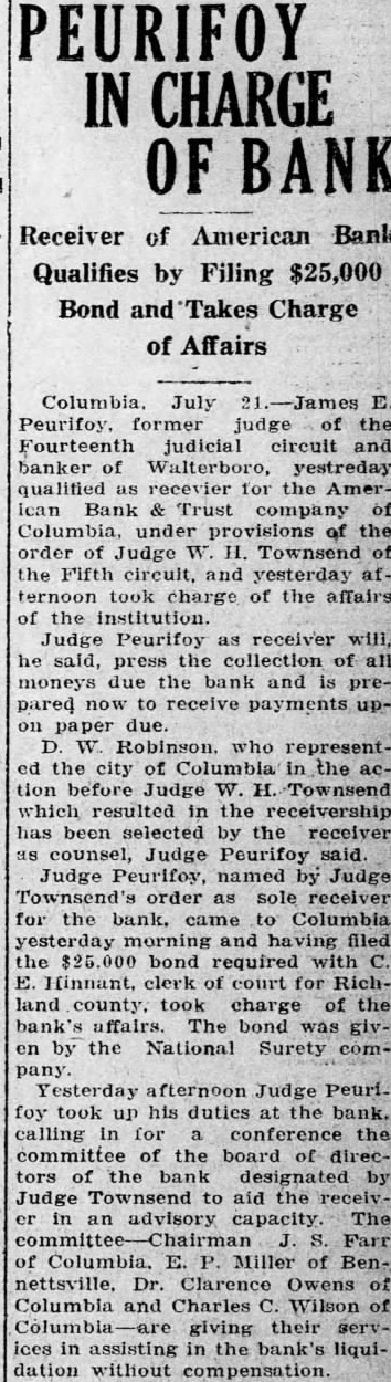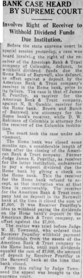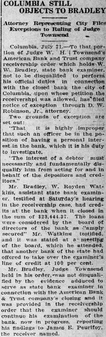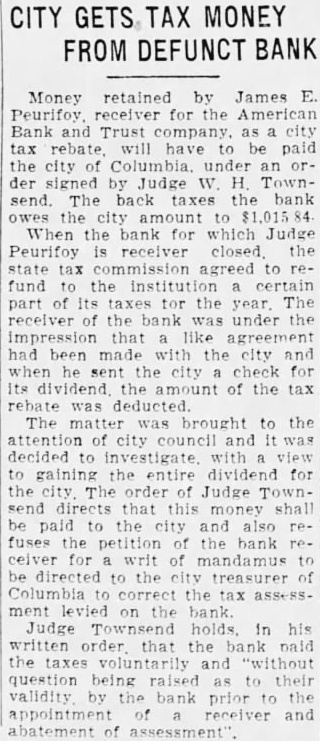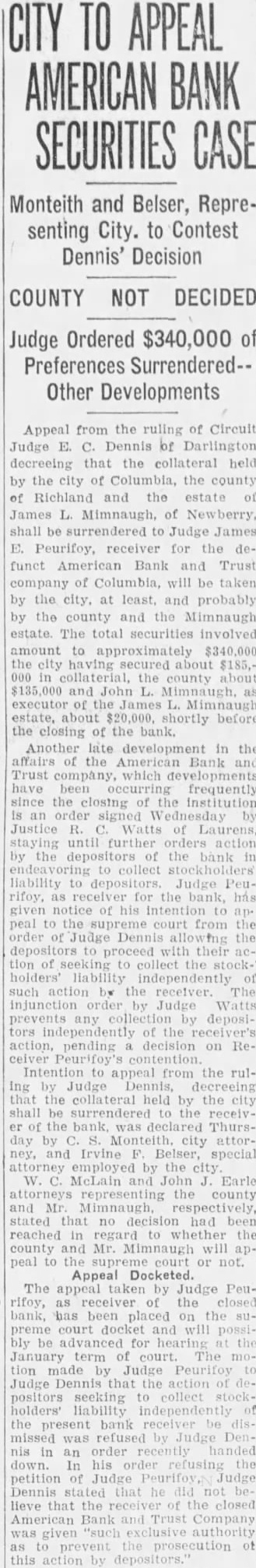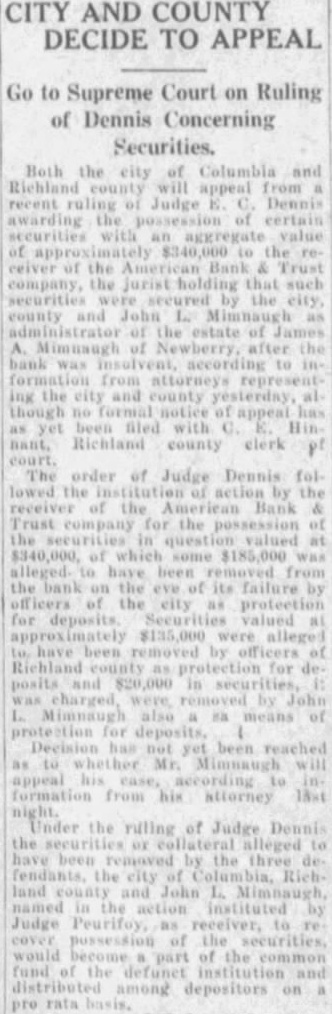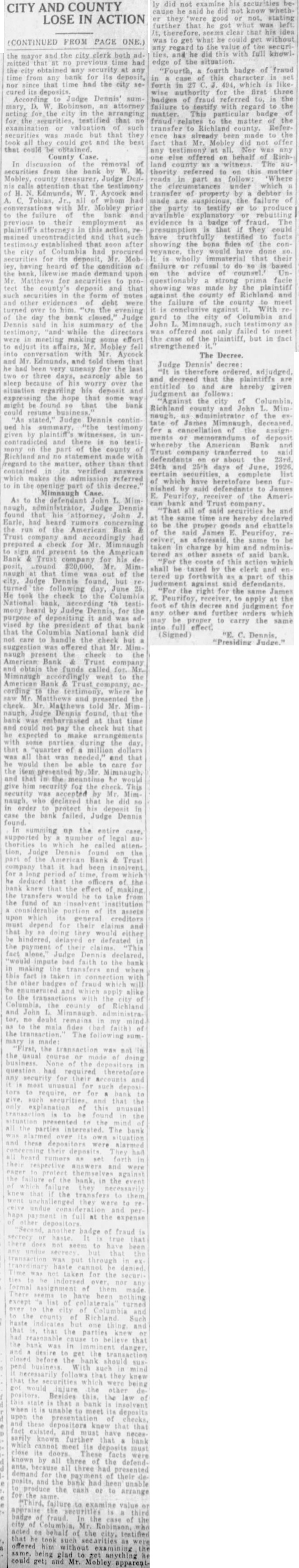 (CONTINUED FROM PAGE ONE.) the mayor and the city clerk both admitted no previous time had the city any at any time from bank for its deposit, nor since that time had the city seits deposits. According Judge Dennis' summary, D. Robinson, an attorney neting for the city in the arranging for the testified that no securities but that they took all could get and the best that could be obtained. County Case. In the removal from the bank by M. Mobley Judge attention that the testimony Edmunds, W. Aycock Tobias, of whom had with Mr. Mobley to the failure bank previous employment as plaintiff's attorney: in this mained uncontradicted and that such established that soon after the city Columbia had for its deposit, Mr. ley, heard of the condition of the bank, made demand upon Mr. for securities tect the deposit and that such the form of notes and other of debt were turned over to "Un the evening the day the bank closed, Judge Dennis of the 'and' some effort to its affairs, Mr. Mobley fell into with Mr Aycock and Mr. Edmunds, and told them that he had been very uneasy for the last two three days, scarcely able to the situation regarding his deposit and expressing the hope that some way might be found so that the bank could resume "An stated. Judge Dennis continued his summary given plaintiff's and no mony the part the county Richland and no made with regard the matter, other than that contained its verified answers which makes the referred in the opening part this decree. Mimnaugh Case. As to the defendant John L. Mim naugh, Judge Dennis found that his attorney, John Earle, had heard rumors the run of the American Bank Trust and had for Mr. Mimnaugh and present the American Bank & Trust company for his de$20,000. Mr. naugh that time was out of the city, Judge Dennis found, but following day, June 25 He took the check Columbia mony heard by Judge Dennis, for the of depositing it and was vised by the president of that that the bank did not care to handle the check but Mr. Mimnaugh present the check to the Bank Trust and obtain the funds called for. Mimnaugh accordingly went the American Bank & Trust company, cording to saw Mr. and check. Mr. Matthews told Mr Mim naugh, Dennis found that time and could not pay the check but expected make with some during the day, that quarter was all and that he would be able to care for the by Mr. Mimnaugh, and the he give him security for the check This security was accepted by Mr naugh who declared that he did so in protect his case the bank failed. Judge Dennis found. In summing up the entire case, supported number of thorities he called attention, Judge Dennis part Bank & company that had he that the officers of the the effect making take the institution its must defeated the payment the the be the Richland and John Mimnaugh the The the transaction not the had required and that unusual parties The were alarmed the the transfers the expense badge of fraud the been Such taste and that the had that the get before the they knew being injure other Besides when the meet its insolvent deposits presentation and knew that that and have sarily known further that which meet deposits facts ants, all the defend. all presented the payment of their and the heen unable for cash or to arrange "Third. the examine value or appraise badge the case of the city Mr. Robinson, acted that behalf the city, testified took same. offered being him without as glad anything he could get; and Mr. Mobley apparent- ly did not examine his securities because he said he not know whether they 'were good or not, stating further that was left therefore, clear his idea was to get what he could get without any regard to the securities, and he did this with full knowledge of the situation. "Fourth, a fourth badge of fraud this forth in which like for the first badges of fraud to, the failure to testify with regard to the matter. This particular badge fraud relates the matter the to county. Reference has already made the fact that Mr. Mobley did not offer any testimony nt Nor was any else offered on behalf of Richland county as witness The authority to on matter in part as follow: Where the under which of property by debtor made are suspicious, the failure of the party to testify or to produce available explanatory rebutting evidence is badge of fraud. The that they could have truthfully to facts showing the bona fides of the con veyance. would have done is wholly immaterial that their failure or refusal to do based on the advice of strong prima facie showing was made the plaintiff against the county of Richland and the failure of the county to meet is against With re gard to the city of Columbia and John such was not only to meet the case of the plaintiff, but in fact strengthened