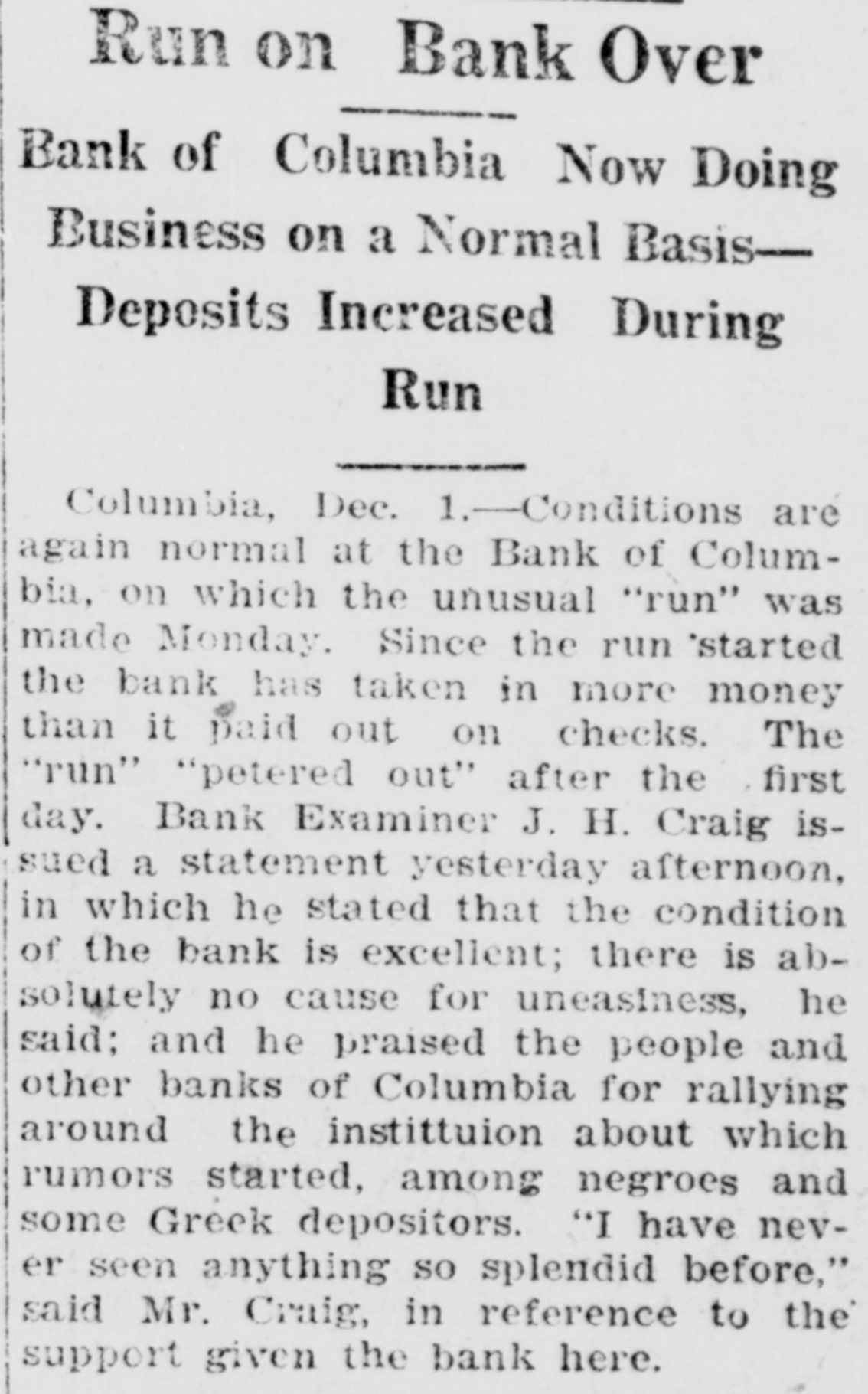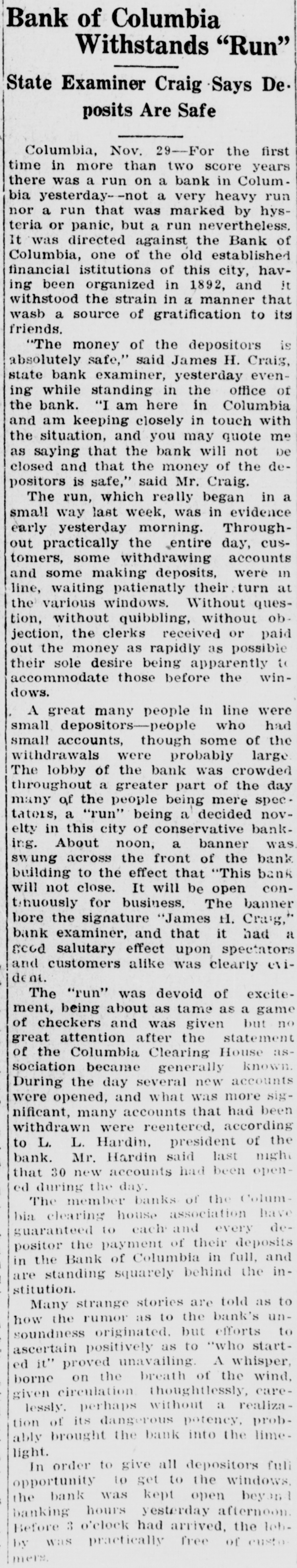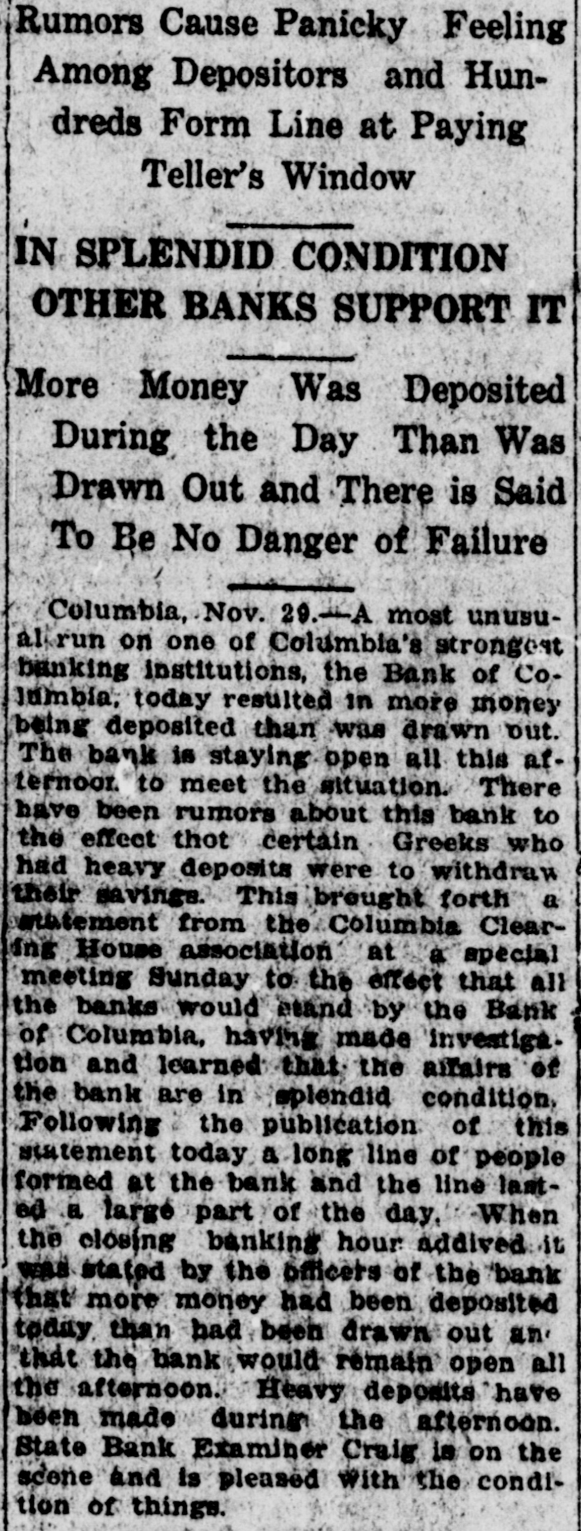 Rumors Cause Panicky Feeling Among Depositors and Hundreds Form Line at Paying Teller's Window IN SPLENDID CONDITION OTHER BANKS SUPPORT IT More Money Was Deposited During the Day Than Was Drawn Out and There is Said To Be No Danger of Failure Columbia, Nov. 29.-A most unusual run on one of Columbia's strongest banking institutions, the Bank of Columbia, today resulted in more money being deposited than was drawn out. The bank is staying open all this atternoor. to meet the situation. There have been rumors about this bank to the effect thot certain Greeks who had heavy deposits were to withdraw their savings. This brought forth a statement from the Columbia Clearing House association at a special meeting Sunday to the effect that all the banks would stand by the Bank of Columbia, having made investiga. tion and learned that the alfairs of the bank are in splendid condition. Following the publication of this statement today a long line of people formed at the bank and the line lasted a large part of the day. When the closing banking hour addived it was stated by the officers of the bank that more money had been deposited today than had been drawn out an. that the bank would remain open all the afternoon. Heavy deposits have been made during the afternoon. State Bank Examiner Craig is on the scene and is pleased With the condition of things.