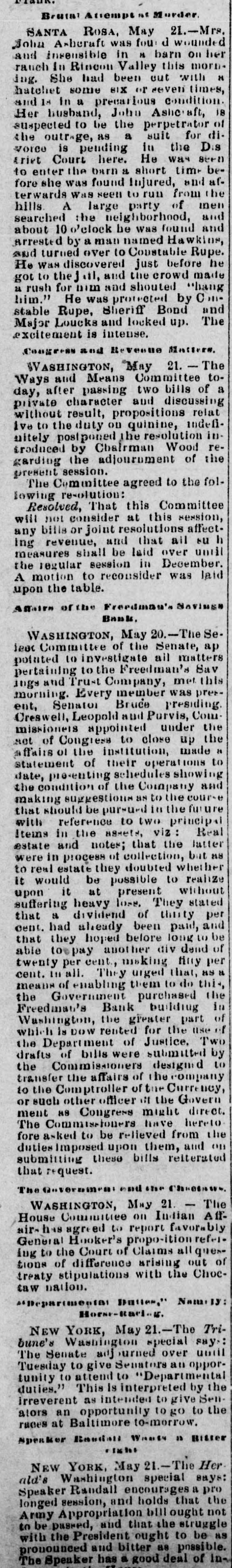 w Mural Bruins Attempt ROSA, May 21.-Mrs. SANTA Ashcraft was fou d wounded her Solua invensible in H barn 011 morn* and In Rincon Valley this with H ranch She had been out times, ing. some BIX or seven condition. hatchet in a precarious 18 and 18 husband, John Ashe'aft suspected Her to be the perpetrator for di of outrage, as a suit the D.s the is pending in sern voice Court here. He was triet the burn a short time be- alto enter she was found Injured, and the fore terwards was seen to run from men A large party of and searched hills the neighborhood, and 10 o'clock be was found arrested about by a man named Hawkins, Rupe. turned over to Constable he and discovered just before made He was the al, and the crowd "hang got to for mm and shouted Com24 rush He was protected by and stable him." Rupe, Sheriff Bond The Major Loucks and locked up. excitement is intense. Converme and Revenue WASHINGTON, "May 21. - The toand Means Committee of Ways after passing two discussing bills a day, character and relat private without result, propositions indefito the duty OD quinine, in. ive postponed the resolution retroduced nitely by Chairman Wood of the garding the adjournment present The Committee session. agreed to the following Resolved, re-olution: That this Committee not consider at this session, will bills or joint resolutions affect- h any revenue, and that ail until su ing shall be laid over measures regular session in December. laid A the motion to reconsider was upon the table. Agair" or the Freedmas's NAVINER Bank, WASHINGTON, May 20.-TheSeof the Senate, ap to investigate all jeec potated Committee Freedman's matters Sav pertaining to the ingsand Trust Company, meathis morning. Every member was presSenator Bruce presiding. ent, Creswell, Leopoli and Purvis, Com- the missioners appointed under the of Congress to close up a act affairs of the institution, made statement of their operations to pre-enting schedules showing and the date, condition of the Company making suggestions as to the course future that should be pur-und in the with reference to two principal Items in the assets, viz : Real estate and noter; that the latter as were in process of collection, but to real estate they doubted whether would be possible to realize it it ut present without upon suffering heavy lose. They stated that a dividend of thirty per cent. had already been paid, and be that they hoped before long 10 of able toepay another div dend twenty per cent., making filly per cent. 111 all. They urged that, as means of enabling them to do this, the Government purchased the in Freedman's Bank building Washington, the greater part of which is DOW rented for the use Two of the Department of Justice. drafts of bills were submitted by to Commissioners designd the transfer the affairs of the company to the Comptroller of the Currency, such other officer it the Govern or ment HS Congress might direct. The Commissioners have hereto fore asked to be relieved from the duties Imposed upon them, and on submitting these bills reiterated that request. The Quvernmen and one WASHINGTON, May 21. - The House Committee on Indian Affair-has agreed to report favorably General Hooker's propo-ition refesing to the Court of Claims questions of difference arising out of treaty stipulations with the Choctaw nation. speparimental Dattee." Namily Horni Racia. NEW YORK, May 21.-The Tribune's Washington special say:: The Senate ailj burned over unil Tuesday to give Senators all opportunity to attend Departmental the duties." This is interpreted by irreverent as intended to give Sellators an opportunity to go to the races at Baltimore to-morrow. speaker Bauchess Wanty " Bitter risks NEW YORK, May 21.-The Her ald's Washington special says: Speaker Randall encourages a pro and Appropriation bill longed Army session, holds ought that struggle not the to be passed, and that the with the President ought to be as pronounced and bitter as possible. The Speaker has a good deal of In-
