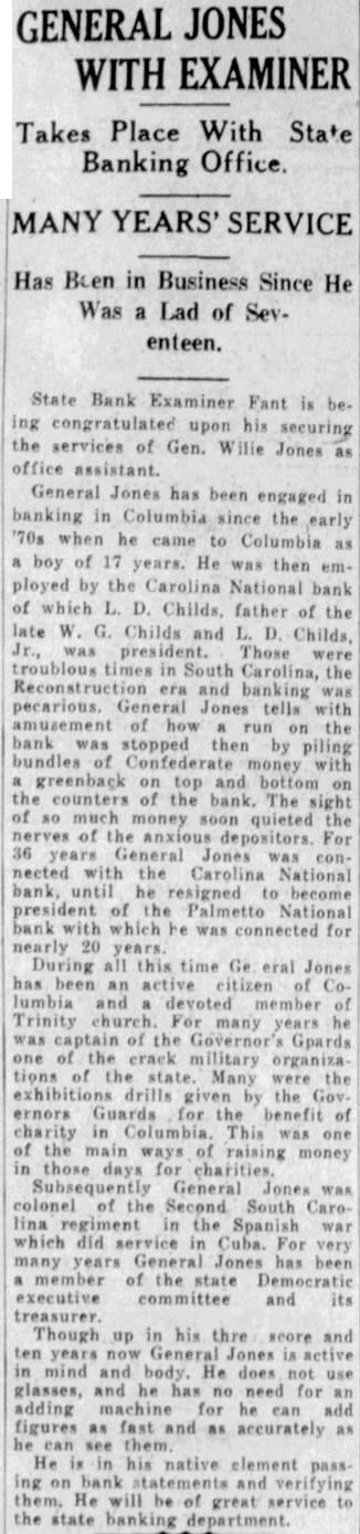 GENERAL JONES WITH EXAMINER Takes Place With State Banking Office. MANY YEARS' SERVICE Has Been in Business Since He Was Lad of Seventeen. State Bank Examiner Fant be. ing upon his securing the services of Gen. Jones as assistant. General Jones has been engaged in banking in Columbia since the early 70s when he came to Columbia as boy of 17 years. He was then employed by the Carolina National bank of which D. Childs, father of the late Childs and L. D. Childs, was Those in South Carolina, the and banking was pecarious. Jones tells with amusement run on the bank was stopped then by piling bundles of Confederate money with greenback on top and bottom counters the bank. The sight of 80 money quieted the of the depositors. For years Jones connected with the Carolina National bank, until he resigned to become president of the Palmetto National bank which he was connected for nearly During all this time Ge eral Jones an active citizen of Columbia and Trinity For many he was captain the Gpards of the crack military organiza tions of the Many were the exhibitions drills given by the Gov. ernors Guards for the benefit of charity in Columbia. This one of the ways of money those days charities. General colonel the Second South lina the Spanish war which did service in Cuba. For very many years General Jones has member the state Democratic executive committee and its Though up in his thre score and ten years now in and body. He does not glasses, and he has no need for adding machine for he add figures as fast and as accurately see He in his native element on bank and verifying them. He will be of great service the state banking