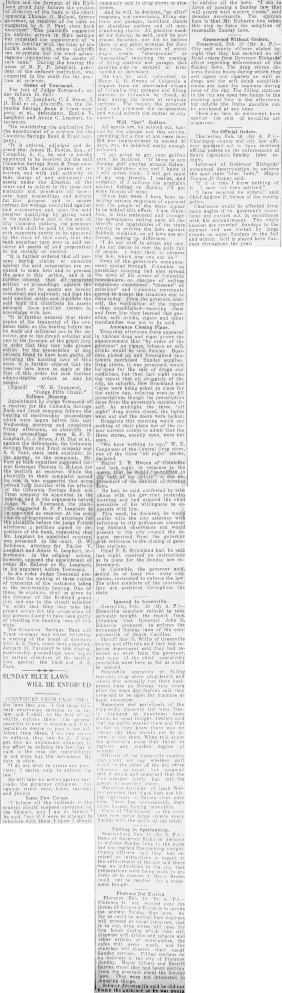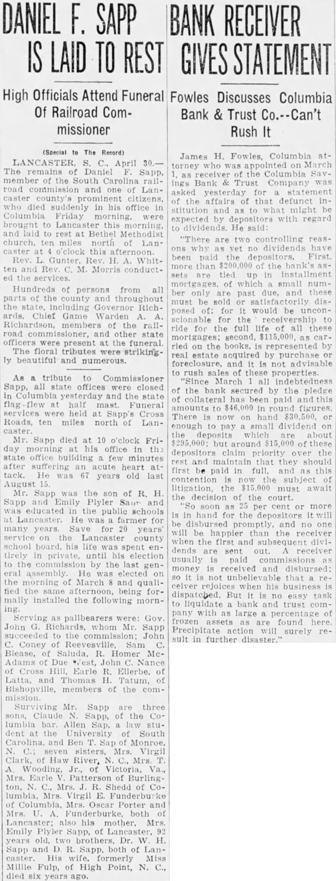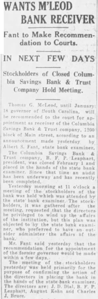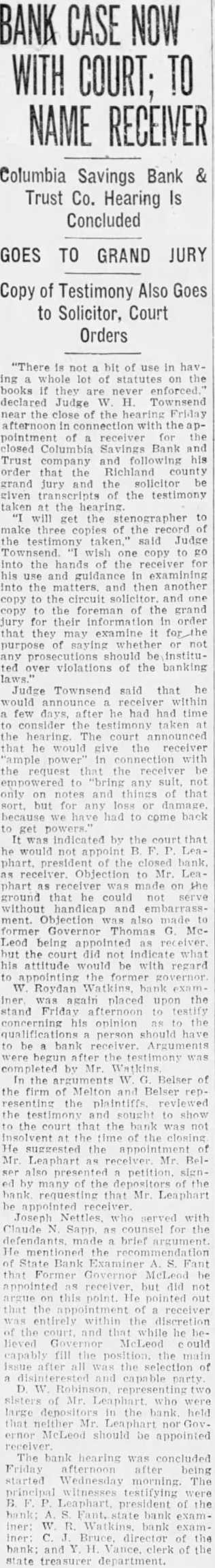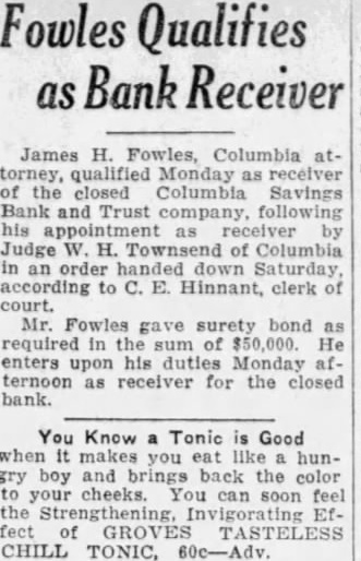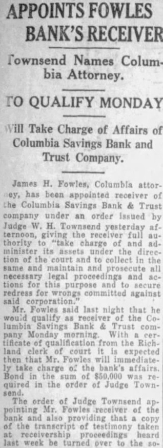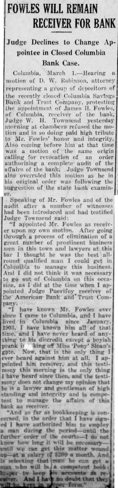 Hearing motion of D. W. Robin attorney group of depositors of the recently closed Columbia Savings Bank & Trust company, the of James H. Fowles Columbia, ceived of the bank, Judge W H. Townsend at chambers refused the motion and in doing paid high tribute to Mr Fowles' honor and integrity. Also coming him that time same calling for an ing complete audit of the affairs the bank Judge Townsend also this motion as he in his original was the sug. gestion of the state bank examiner the testimony Judge on the two and was ed with by Mr Rob. inson asking that or an advisory chosen from positors of the defunct institution be Judge said that he did this sary as Mr. he was fully capable liquidating the fairs of the On Own Motion. Speaking of Mr. and of the after number of witnesses had been introduced and had testified, Judge Townsend appointed Mr. as receiv. upon my own After going elimination great of prominent business in this town and lawyers this bar thought he was the best round qualified could get in manage this business And did not think was necessary to out this easion. did the time when appointed Judge Puerifoy the American Bank & Trust company have known Mr. Fowles ever since and have in since January, 1903. have known him all that and have heard of anything to his discredit except boy. ish prank in taking off Miss 'Pony' Sloan's gate. Now. that is the thing ever heard against him appointed him this testimony this morning the only thing have heard then and the does not change my opinion that he and gentleman of high standing and in tegrity and competent to manage the affairs of this bank as receiver "And so far as is conin the order have signed authorized him to employ man during the the further order the court-1 do not know how long it will be necessary until we can get matter wound up-at salary $200 month. And in selecting that man he can get man who will be competent bookkeeper to keep his accounts ceiver And have no that they will kept in proper form. Integrity Unquestioned. "But even on this hearing this there no witness who has come and made any charge against Mr. Fowles' integrity. That both and able. And was satisfied as to his competency. And, therefore, the motion to revoke his appointment is refused. "Now, as to the audit, the state bank in his suggested that an audit would be necessary. How much of an audit don't know. The receiver will that when he looks further into the affairs of the bank. But that he will require some aid in auditing the af fairs of the bank think is evident from the before me on the application for the of receiver. "There no evidence that has been here before me to suggest any defalcation the part of any of the officers of the bank. But what were the under which the securities held by the bank were acquired were questioned on that And think matters should be thoroughly For that reason think that an audit should be had. and might well be had right now at beginning better than period. that the both grounds on which Asks for Co-Receiver. At this Mr. Robinson said, please, you move that your appoint advisory from the that they may have representation in the winding of that bank. not necessity for see that. It small bank and small So refused.' 'It just as important to them as big And him to act entirely from the influence any of parties interested and and believe he will do The motions before Judge Town send group of de signed the Mr Fowles and the of the order of appointment. that motion was the second. that the order authorizing an audit be revoked. Unnecessary expense was given as reason for the Reasons brought out testithe hearing, to Mr. Fowles as receiver. centered principally around the matter of competency In respect witnesses were questioned about certain or- ganization within one of the fraternal orders of Columbia formed for the purpose of financing the construction of lodge building, of which Mr. Fowles was treasurer. While in this of the witnesses claimed, through loose or careless keeping of records of the project, some of the records or vouchers were lost or unaccounted Attorneys for Mr. Fowles, however, each witness closely about this and seemed through their that virtually all of these records were eventually accounted for. None the witnesses would cast the least on the honor and integrity of Mr. The accountant who udited the books of this organization, while saying that due to incompiete records the time of his examination he was unable to make complete one, declared there was nothing revealed in the audit that would reflect unfavorably on the character of Mr. Fowles. Attorneys for Mr. Fowles through their out the testimony that at the time the audit of the lodge organization there was two opposing factions within the same lodge Among those testifying at the hearing were: G. Duncan, treasurer the Columbia Savings Bank Trust company; S. Farr, W. Watkins the state bank office, L. M. Milling of the state bank examiner's office, M. Thayer, certified R. Gayden of Gayden Brothers, depositors of the defunct bank: Mr. Shields, also depositor, B. Leaphart, dent of the defunct institution Joseph L. Nettles and W. S. Nelappeared for Mr. Fowles.