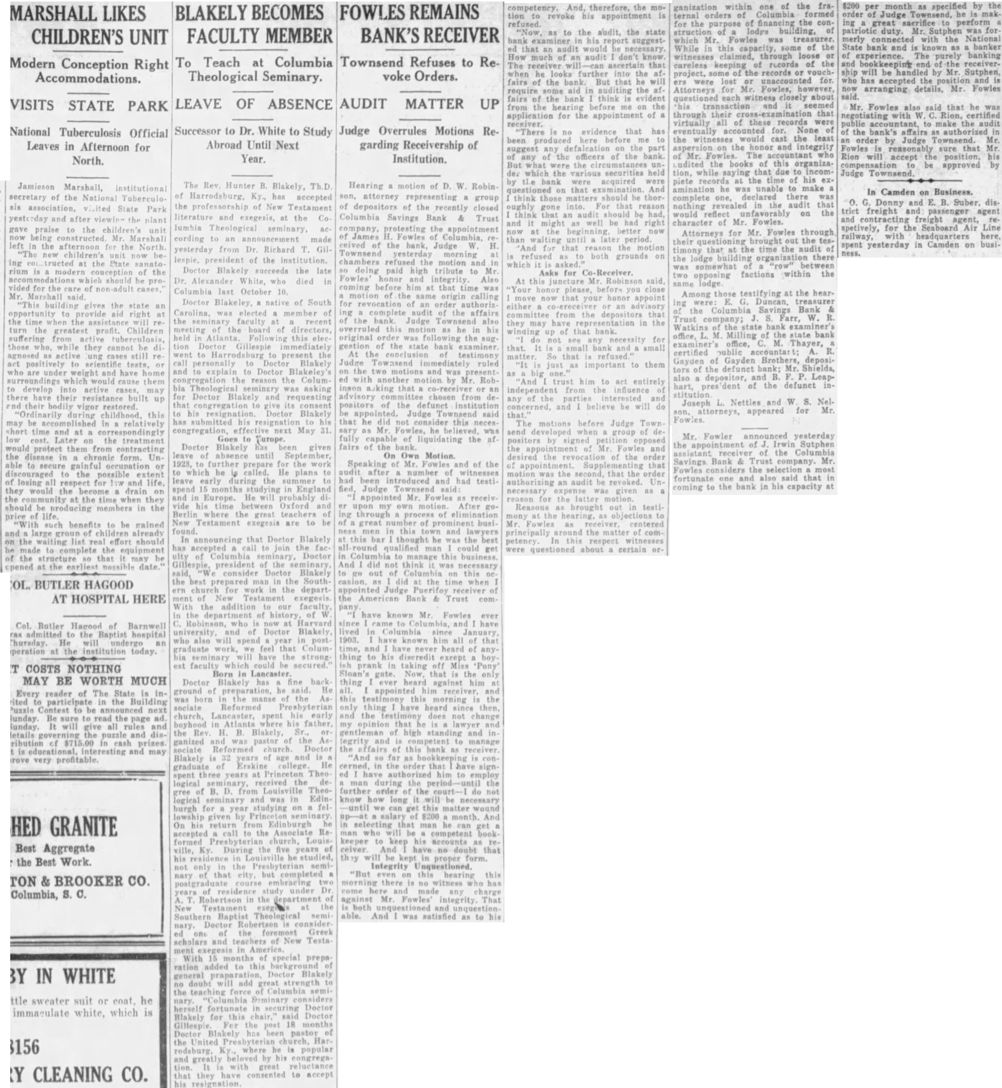 The Rev. Hunter B. Blakely, Th.D. of Harrodsburg, Ky. has accepted the of New Testament and exegesis, at the lumbia Theological seminary, cording an yesterday from Dr. Richard T. Gil of the Doctor Blakely succeeds the late Dr. Alexander White, who died in Columbia October 10. Doctor Blakeley, native of South Carolina, was elected a member the faculty meeting of the board of directors, held Atlanta. this elec tion Gillespie immediately went to present the call Blakely and to explain to Doctor Blakeley's congregation the reason the Columbia Theological seminary was asking Doctor Blakely and requesting that congregation to give its consent his resignation. Doctor Blakely has submitted his resignation his May 31. Goes to Doctor Blakely given leave absence until 1928, to further prepare for the work to which he is called. He plans to leave early during the summer to spend 15 in England and in Europe. He will probably divide his time between Oxford and Berlin the great teachers New Testament exegesis are to be found. In announcing that Doctor Blakely has accepted join the fac ulty of Columbia Doctor Gillespie, president the said, consider Blakely the best man in the South ern church for work in the department of Testament exegesis With the addition our faculty in the department of history, of W Robinson, who now at Harvard university and of Doctor Blakely who also will spend in post graduate we feel that Columbia seminary have the strong. est faculty which could be secured. Born in Lancaster. Doctor Blakely has fine back ground of preparation, he said. He was born the manse of the Associate Reformed church, Lancaster, spent his early boyhood in Atlanta his father the Rev. H. B. Blakely, Sr., ganized and was pastor of the Associate Reformed church. Doctor Blakely is 32 years of age and is graduate Erskine college He spent three at Theological received the degree of B. D. from Louisville Theological and was in Edinburgh for year studying on a fel. lowship given by Princeton On his return from Edinburgh accepted to the Associate Reformed Presbyterian church, During the five years of ville, his in studied, not only the Presbyterian seminary of that city, but completed postgraduate course embracing two years of residence study under Dr. Robertson in the department New Testament at the Southern Baptist Theological seminary. Doctor Robertson considerof the foremost Greek ed one scholars and of New Testament exegesis in America. With 15 of special preparation added to this general Doctor Blakely no doubt will add great strength to the teaching force Columbia seminary. "Columbia Deminary considers herself fortunate in securing Doctor Blakely for this chair," said Doctor Gillespie. For the post 18 months Doctor Blakely been the United Presbyterian church, Harrodsburg, where he is popular and greatly beloved by his congregation. It with great reluctance that they have consented to accept his