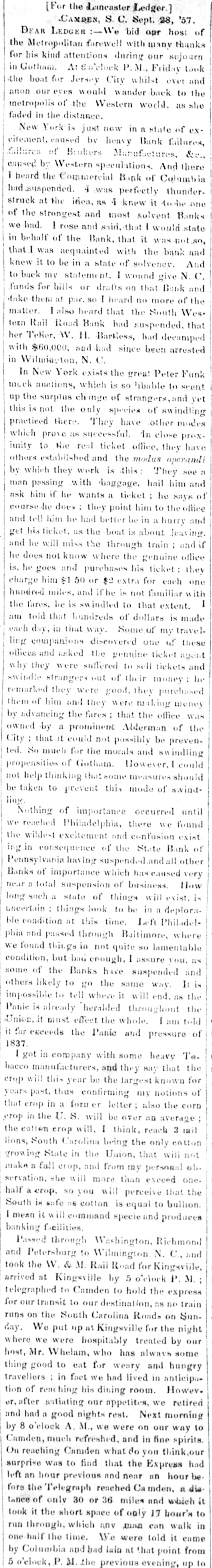 Manufactures, caused by Western speculations. And heard the Commercial Bank of Colu had suspended. 4 was perfectly thu struck at the idea, RS 4 knew it to i of the strongest and most solvent I had. I rose and said, that I would in behalf of the Bank, that it was n that I was acquainted with the ban knew it to be in a state of solvener. to back my statement. I wound give funds for bills or drafts on that Ban take them at par. 80 I heard no more ( matter. I also heard that the South term Rail Road Bank had suspended her TeNer. W. H. Bartless, had deen with $60,000, and had since been and in Wilmiaston, N. C. In New York exists the great Peter meek auctions, which is SO libable to the surplus change of strangers, an this is not the only species of swit practiced there. They have other which prove as successful. In close imity to the real ticket office, they others established and the modus ope by which they work is this: They passing with baggage, hail hit ask him if he wants a ticket : he si course he does they point him to the and tell him he had better be in a hurr his ticket. as the boat is about les and he will miss the through train he does not know where the genuine is, he goes and purchases his ticket charge him $1 50 or $2 extra for each hundred miles, and if he is not familiar the fares, he is swindled to that exter told that hundreds of dollars is each day, in that way. Some of my t ling companions diseovered one of offices and asked the genuine ticket why they were suffered to sell ticket swindle strangers out of their money remarked they were good, they purel them of him and they were making 11 by advancing the fares that the office owned by a prominent Alderman of City : that it could not possibly be pre So much for the morals and swin propensities of Gotham. However, I help thinking that some measures st taken to prevent this mode of sv Nothing of importance occurred reached Philadelphia, there we I the wildest excitement and confusion in consequence of the State Bar Pennsylvania having suspended,and all Banks of importance which has caused hear a total suspension of business. ong such a state of things will exis incertain things look to be in a dep condition at this time. Left Phil hia and passed through Baltimore, w found things in not quite 80 lamen condition, but bad enough, I assure vo of the Banks have suspended thers likely to go the same why. impossible to tell where it will end, no Panie is already heralded throughout Union. it must effect the whole. I am for exceeds the Panic and pressur 837. I got in company with some heavy neco manufacturers, and they say that rop will this year be the largest know ears past, thus confirming my notion hat crop in a form er letter: also the rop in the U. S. will be over an aver he eotten erop will, I think, reach 3 ions, South Carolina being the only ed growing State in the Union, that will nake n full crop, and from my persona ervation, she will more than exceed alf a crop, SO you will perceive tha South is safe as cotton is equal to but mean it will command specie and prod banking facilities. Passed through Washington, Richr Petersburg to Wilmington. N. C. the W. & M. Rail Road for Kings rrived at Kingsville by 5 o'elock P. elegraphed to Camden to hold the exp our transit to our destination, as no on the South Carolina Roads on We put "p as Kingsville for the : where we were hospitably treated by Mr. Whelam, who has always 8 good to eat for weary and hu ravellers in fact we had lived in anti