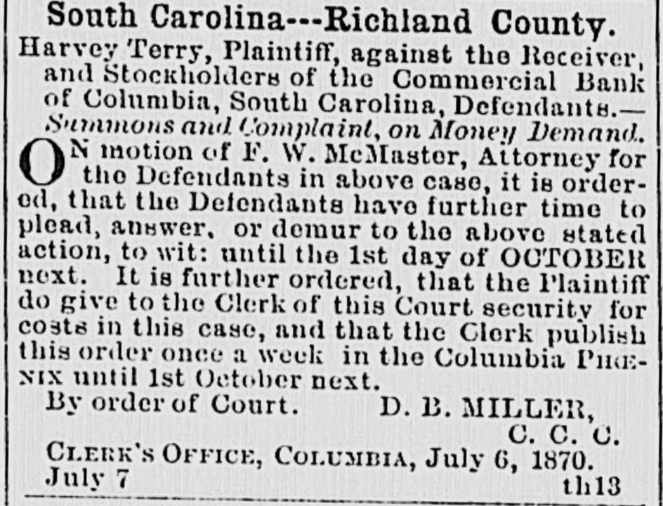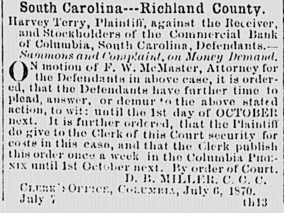 BANKS AND CAPITAL. - Statement No. 14 comprises abstracts of the returns of Banks of the State, filed in this office, under the provisions of the enabling Acts of March, 1869. In accordance therewith, the following named Banks have, during the last fiscal year, resumed business, with the amount of capital placed opposite their names, respectively, viz: Bank of Charleston, $850,000; People's Bank of South Carolina, $250,080; Planters' and Mechanics' Bank, $100,000. The Bank of Newberry and the South-western Railroad Bank are redeeming their bills, but have not resumed business. The following named are in the hands of receivers, &c., appointed under the provisions of the above named Act, or orders of the Courts prior to the passage thereof: Bank of Camden; Bank of Chester; Commercial Bank of Columbia; Exchange Bank of Columbia; Bank of Hamburg; Bank of Georgetown; Merchants' Bank of South Carolina, Cheraw; Planters' Bank of Fairfield; State Bank of Charleston, and Bank of South Carolina.