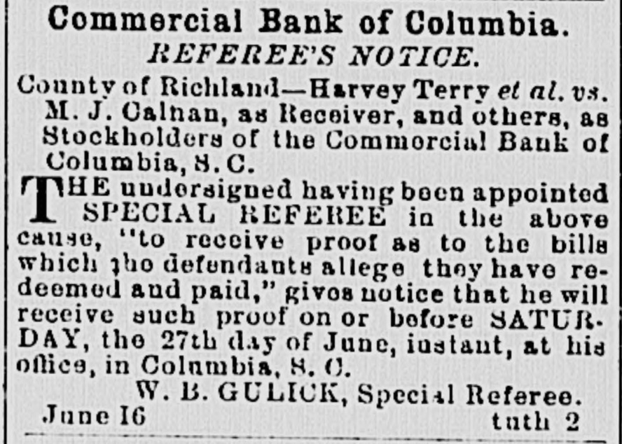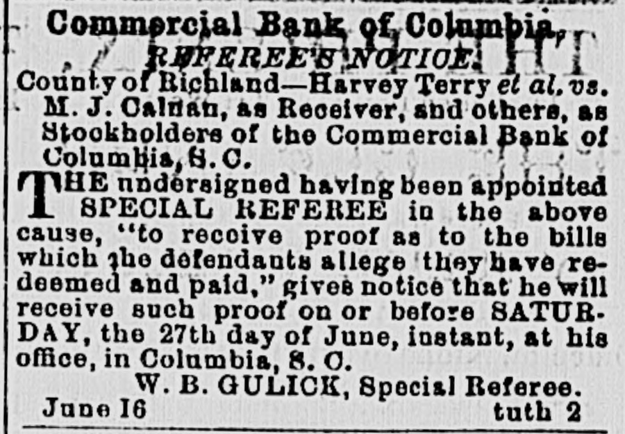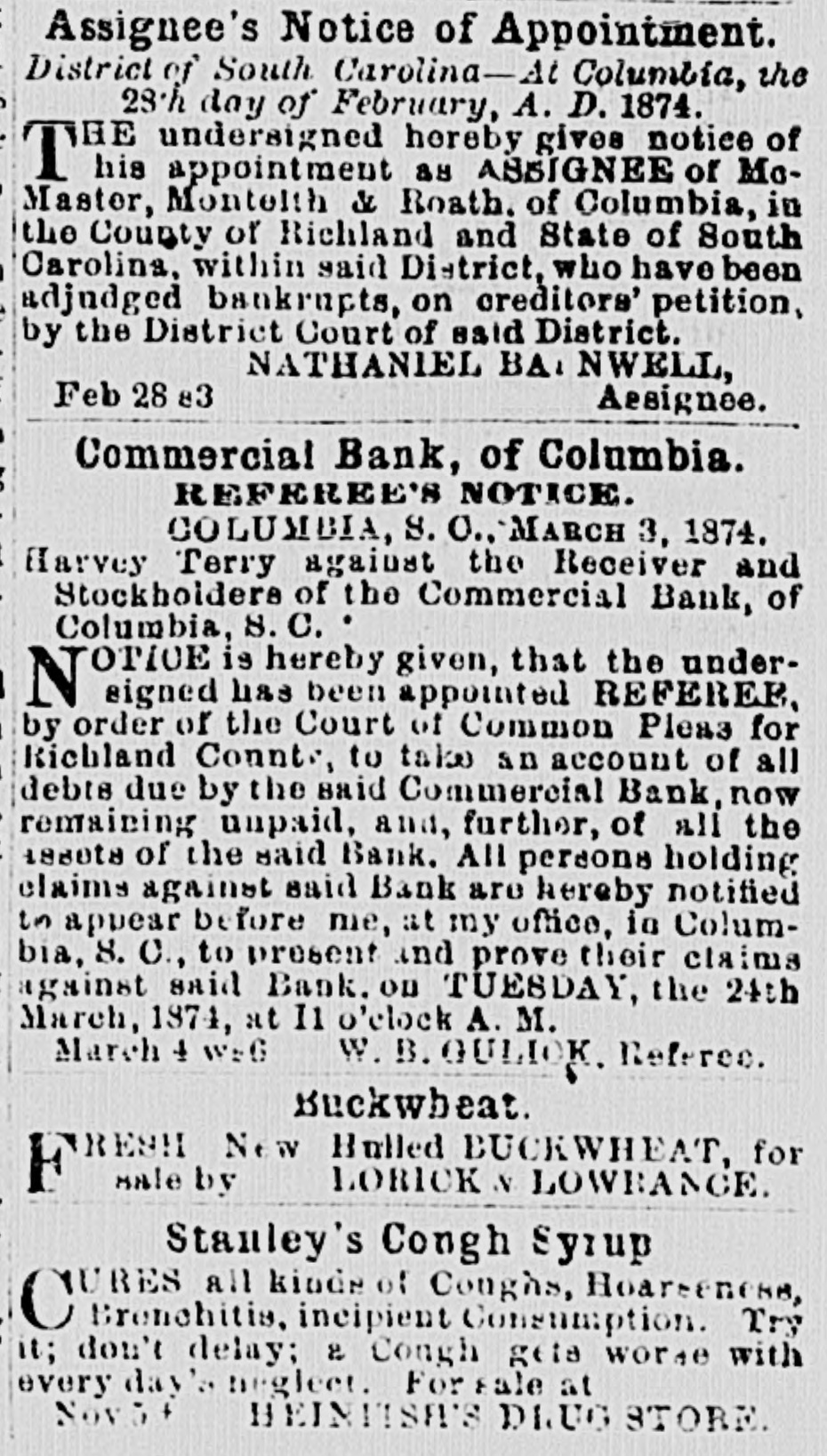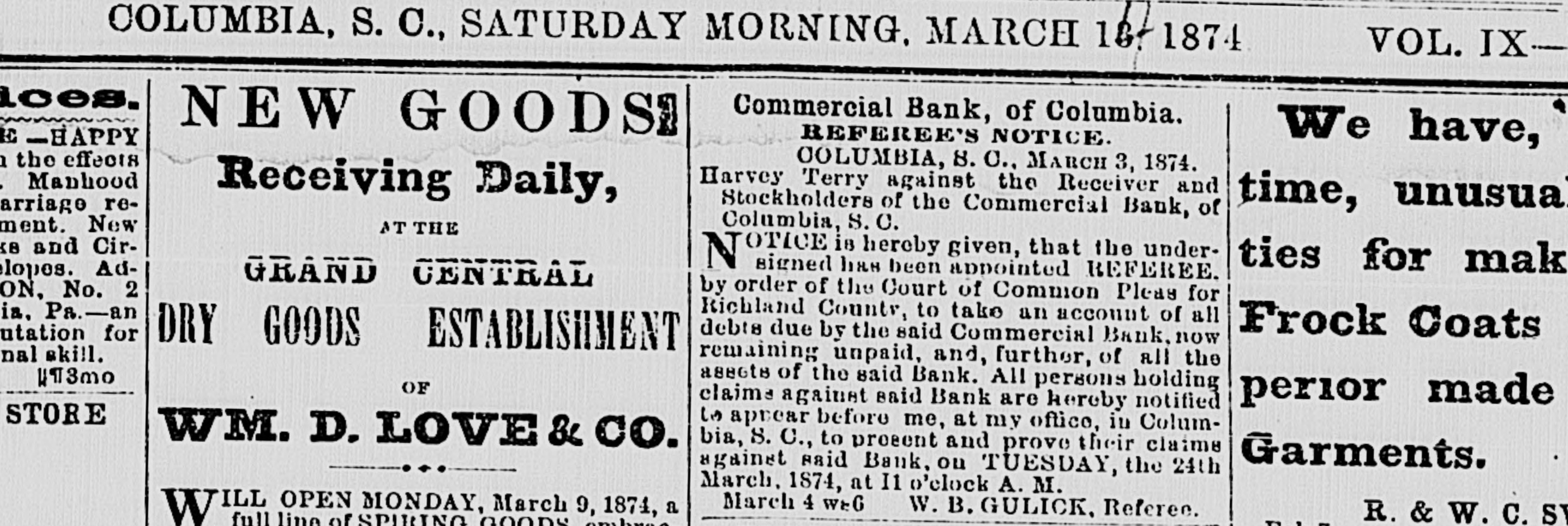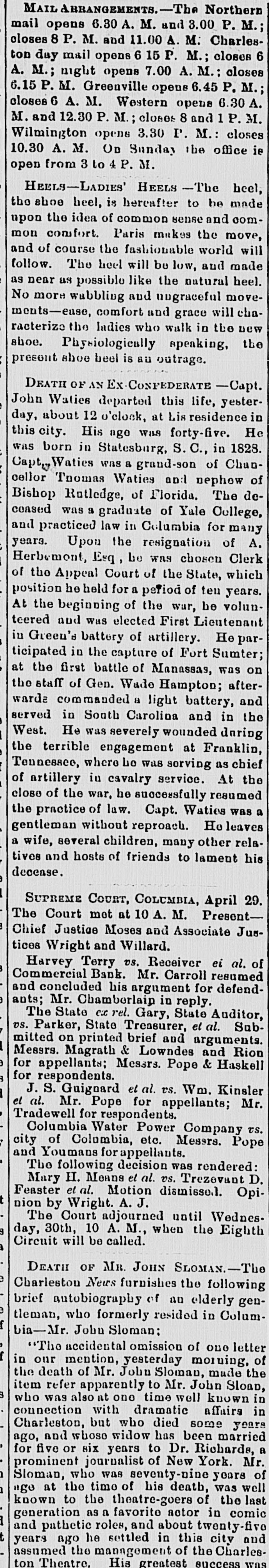 MAIL ABRANGEMENTS.-T Northern mail opens 6.30 A. M. and 3.00 P. M. closes 8 P. M. and 11.00 A. M. Charleston day mail opens 15 P. M.; closes 6 A. M.; night opens 7.00 A. M.: closes 6.15 P.M. Greenville opens 6.45 P. M. closes 6 A. M. Western opene 6.30 A M. and 12.30 P. M.; closes 8 and 1 P.M. Wilmington opens 3.30 I'. M.: closes 10.30 A. M. On Sunday the office ie open from 3 to 4 P. M. HEELS-LADIES' HEELS -The heel, the shoe heel, is hereafter to be made upon the idea of common sense and common comfort. Paris makes the move, and of course the fashionable world will follow. The heel will be low, and made as near as possible like the natural heel. No more wabbling and ungraceful movements-ease, comfort and grace will characterize the Indies who walk in the new shoe. Physiologically speaking, the present shoe beel is all outrage. DEATH OF AN CX COSPEDERATE -Capt. John Waties departed this life, yesterday, about 12 o'clock, at Lis residence this city. His age WILL forty-five. He was born in Statesburg, S. C., in 1828. Capt,,Waties was a grand-son of Chancellor Tnomas Waties and nephew of Bishop Rutledge, of Florida. The deceased was a graduate of Yale College, and practiced law in Columbia for many years. Upon the resignation of A. Herbemont, Esq, be was chosen Clerk of the Appeal Court of the State, which position he held for a period of ten years. At the beginning of the war, he volunteered and was elected First Lieutenant in Green's battery of artillery. Ie participated in the capture of Fort Sumter; at the first battle of Manassas, was on the staff of Gen. Wade Hampton; afterwarde commanded a light battery, and served in South Carolina and in the West. He was severely wounded during the terrible engagement at Franklin, Tennessee, where be was serving as chief of artillery in cavalry service. At the close of the war, he successfully resumed the practice of law. Capt. Waties was a gentleman without reproach. Heleaves a wife, several children, many other relatives and hosts of friends to lament his decease. SUPREME COURT, COLUMBIA, April 29. The Court mot at 10 A. M. PresentChief Justice Moses and Associate Justices Wright and Willard. Harvey Terry vs. Receiver ei al. of Commercial Bank. Mr. Carroll resumed and concluded his argument for defendants; Mr. Chamberlain in reply. The State c.c rel. Gary, State Auditor, vs. Parker, State Treasurer, et al. Submitted on printed brief and arguments. Messrs. Magrath & Lowndes and Rion for appellants; Mesars. Pope & Haskell for respondents. J. S. Guignard et al. vs. Wm. Kinsler el al. Mr. Pope for appellants; Mr. Tradewell for respondents. Columbia Water Power Company vs. city of Columbia, etc. Messrs. Pope and Youmans for appellants. The following decision was rendered: Mary II. Means et al. vs. Trezevant D. Feaster et al. Motion dismisse.l. Opinion by Wright. A. J. The Court adjourned until Wednesday, 30th, 10 A. M., when the Eighth Circuit will be called. DEATH OF MR. JOHN SLOMAN.-The Charleston News furnishes the following brief autobiography of an elderly gentleman, who formerly resided in Columbia-Mr. John Sloman: "The accidental omission of one letter in our mention, yesterday morning, of the death of Mr. John Sloman, made the item refer apparently to Mr. John Sloan, who was also at one time well known in connection with dramatic affairs in Charleston, but who died some years ago, and whose widow has been married for five or six years to Dr. Richards, a prominent journalist of New York. Mr. Sloman, who was seventy-nine years of "ge at the time of his death, was well known to the theatre-goers of the last generation as a favorito actor in comic I and pathetic roles, and about twenty-five years ago he settled in this city and assumed the management of the Charleeton Theatre. His greatest success