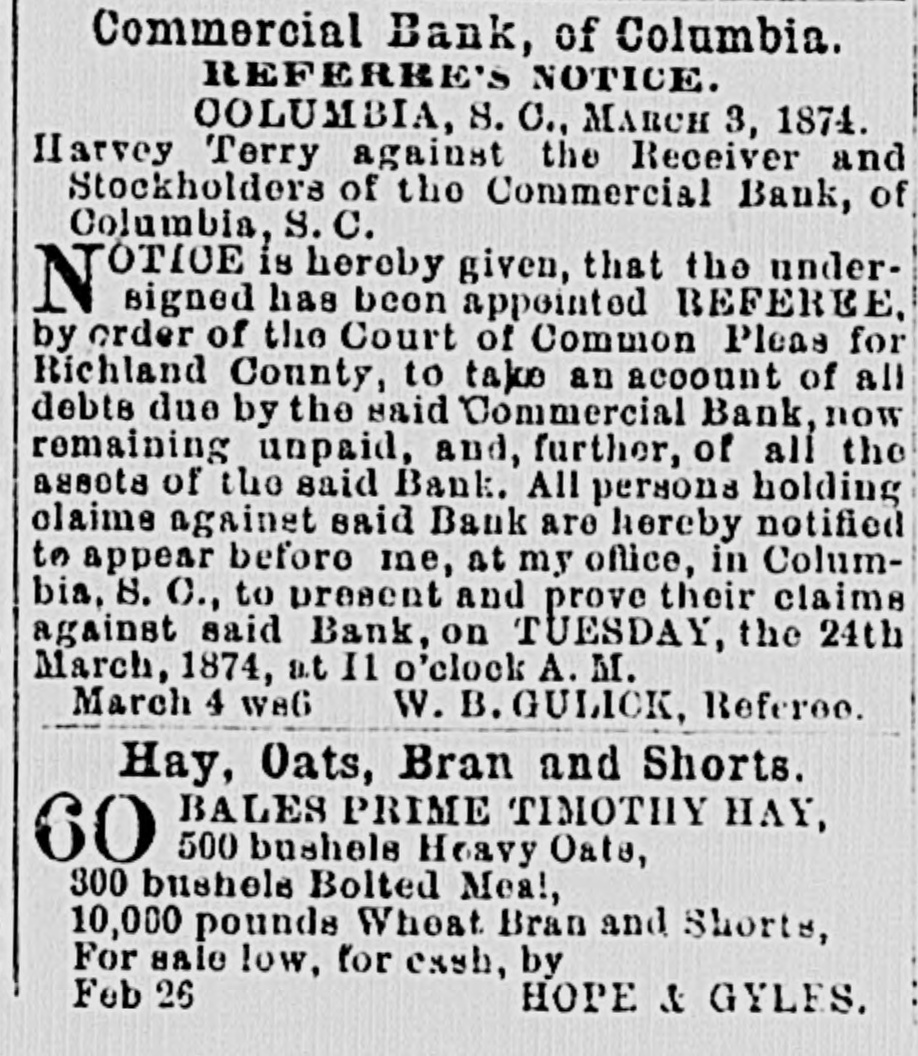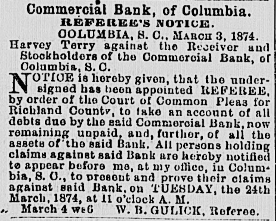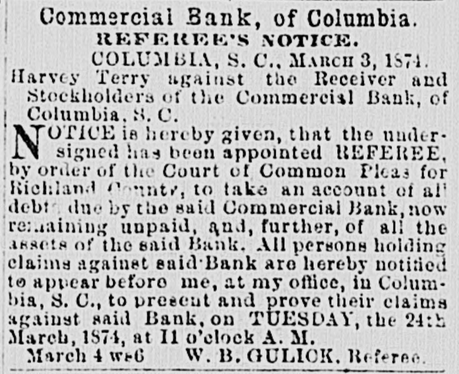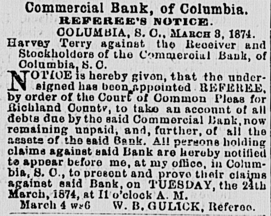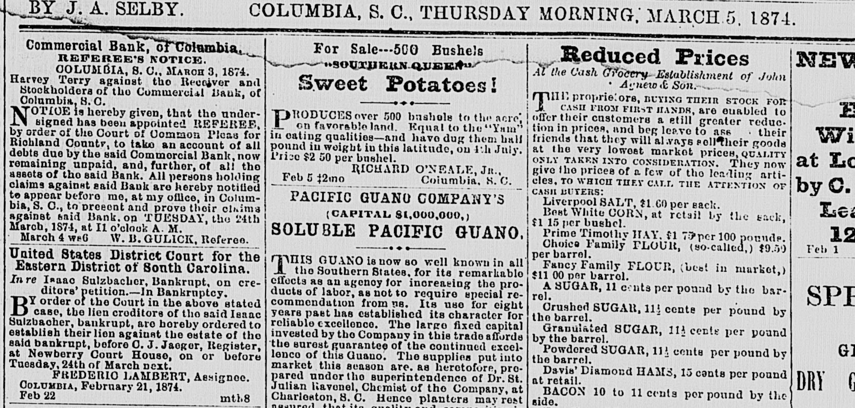 MAIL ABRANGEMENTS.-T Northern mail opens 6.30 A. M. and 3.00 P. M. closes 8 P. M. and 11.00 A. M. Charleston day mail opens 15 P. M.; closes 6 A. M.; night opens 7.00 A. M.: closes 6.15 P.M. Greenville opens 6.45 P. M. closes 6 A. M. Western opene 6.30 A M. and 12.30 P. M.; closes 8 and 1 P.M. Wilmington opens 3.30 I'. M.: closes 10.30 A. M. On Sunday the office ie open from 3 to 4 P. M. HEELS-LADIES' HEELS -The heel, the shoe heel, is hereafter to be made upon the idea of common sense and common comfort. Paris makes the move, and of course the fashionable world will follow. The heel will be low, and made as near as possible like the natural heel. No more wabbling and ungraceful movements-ease, comfort and grace will characterize the Indies who walk in the new shoe. Physiologically speaking, the present shoe beel is all outrage. DEATH OF AN CX COSPEDERATE -Capt. John Waties departed this life, yesterday, about 12 o'clock, at Lis residence this city. His age WILL forty-five. He was born in Statesburg, S. C., in 1828. Capt,,Waties was a grand-son of Chancellor Tnomas Waties and nephew of Bishop Rutledge, of Florida. The deceased was a graduate of Yale College, and practiced law in Columbia for many years. Upon the resignation of A. Herbemont, Esq, be was chosen Clerk of the Appeal Court of the State, which position he held for a period of ten years. At the beginning of the war, he volunteered and was elected First Lieutenant in Green's battery of artillery. Ie participated in the capture of Fort Sumter; at the first battle of Manassas, was on the staff of Gen. Wade Hampton; afterwarde commanded a light battery, and served in South Carolina and in the West. He was severely wounded during the terrible engagement at Franklin, Tennessee, where be was serving as chief of artillery in cavalry service. At the close of the war, he successfully resumed the practice of law. Capt. Waties was a gentleman without reproach. Heleaves a wife, several children, many other relatives and hosts of friends to lament his decease. SUPREME COURT, COLUMBIA, April 29. The Court mot at 10 A. M. PresentChief Justice Moses and Associate Justices Wright and Willard. Harvey Terry vs. Receiver ei al. of Commercial Bank. Mr. Carroll resumed and concluded his argument for defendants; Mr. Chamberlain in reply. The State c.c rel. Gary, State Auditor, vs. Parker, State Treasurer, et al. Submitted on printed brief and arguments. Messrs. Magrath & Lowndes and Rion for appellants; Mesars. Pope & Haskell for respondents. J. S. Guignard et al. vs. Wm. Kinsler el al. Mr. Pope for appellants; Mr. Tradewell for respondents. Columbia Water Power Company vs. city of Columbia, etc. Messrs. Pope and Youmans for appellants. The following decision was rendered: Mary II. Means et al. vs. Trezevant D. Feaster et al. Motion dismisse.l. Opinion by Wright. A. J. The Court adjourned until Wednesday, 30th, 10 A. M., when the Eighth Circuit will be called. DEATH OF MR. JOHN SLOMAN.-The Charleston News furnishes the following brief autobiography of an elderly gentleman, who formerly resided in Columbia-Mr. John Sloman: "The accidental omission of one letter in our mention, yesterday morning, of the death of Mr. John Sloman, made the item refer apparently to Mr. John Sloan, who was also at one time well known in connection with dramatic affairs in Charleston, but who died some years ago, and whose widow has been married for five or six years to Dr. Richards, a prominent journalist of New York. Mr. Sloman, who was seventy-nine years of "ge at the time of his death, was well known to the theatre-goers of the last generation as a favorito actor in comic I and pathetic roles, and about twenty-five years ago he settled in this city and assumed the management of the Charleeton Theatre. His greatest success