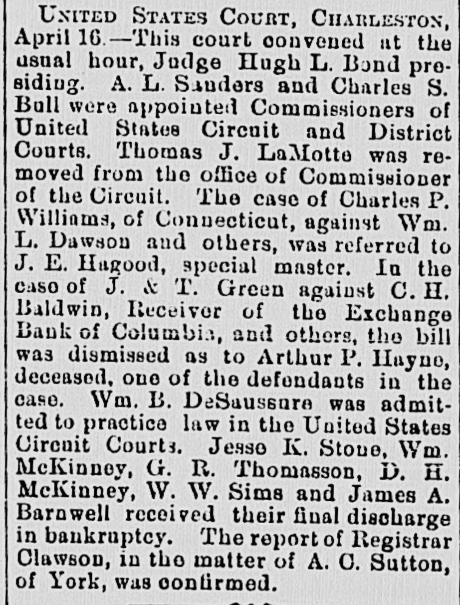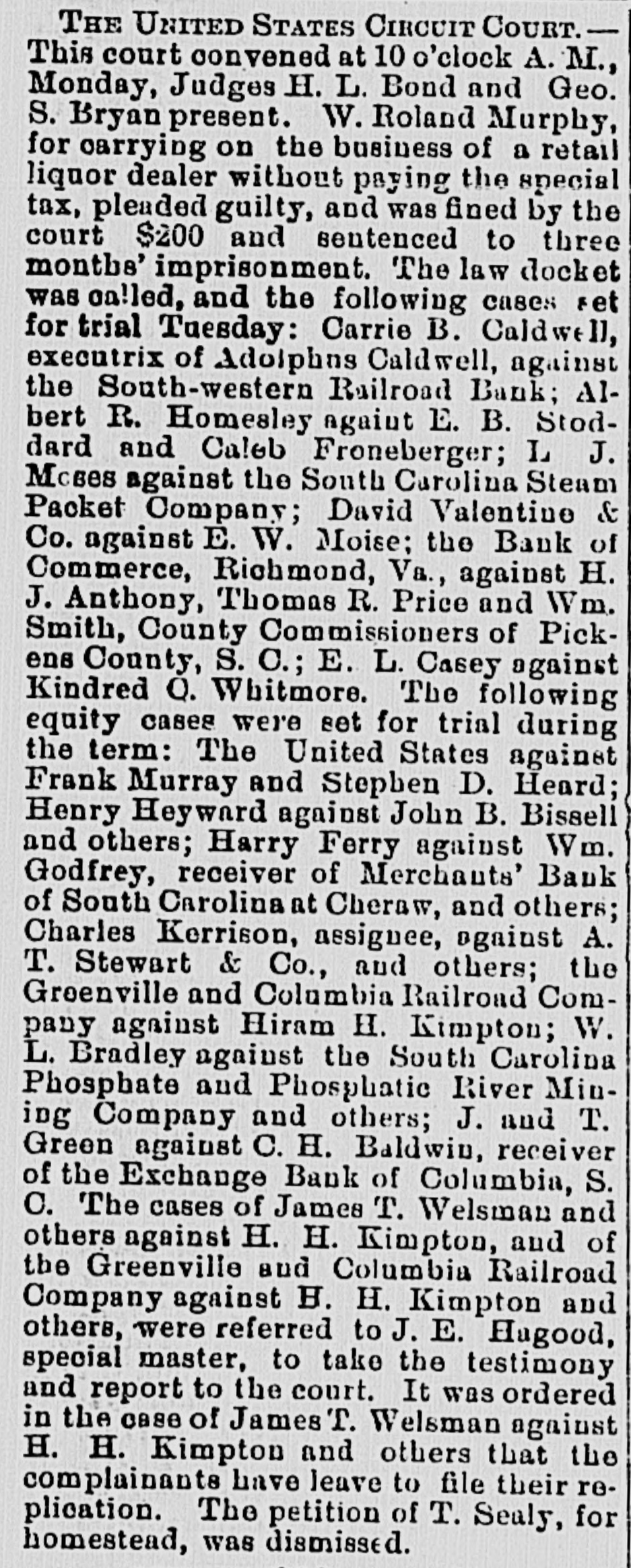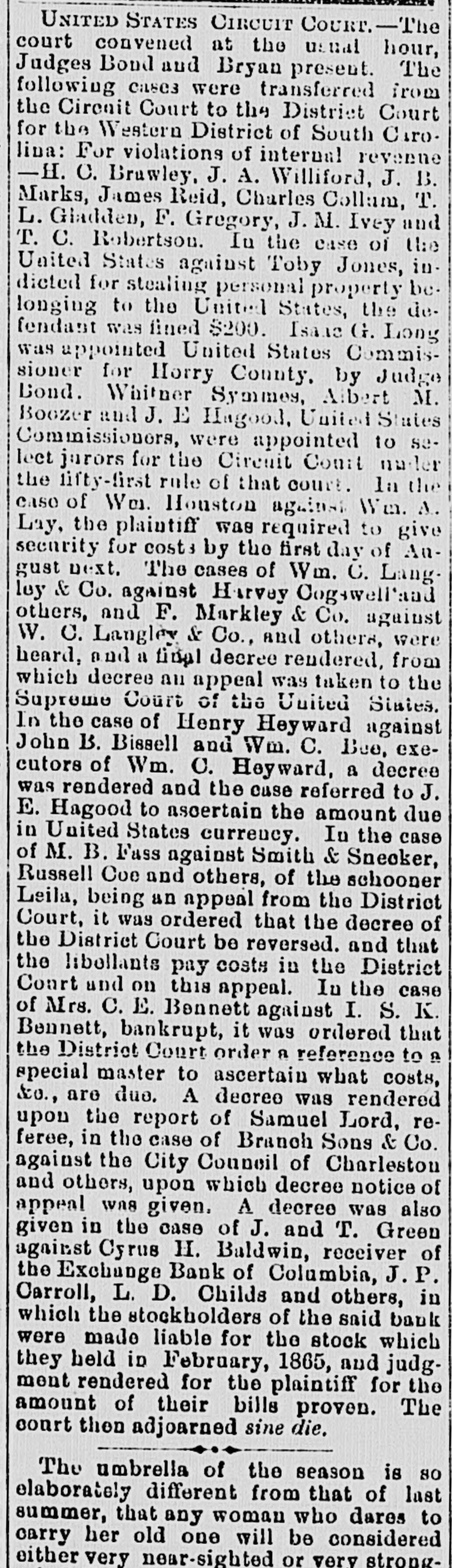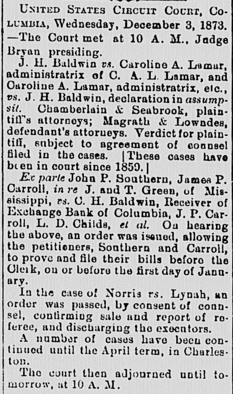 There were sensational reports on the streets, yesterday as to a serious acci dent on the Wilmington Columbia aud Augusta Railroad; but opon inquiry we learned that a broken rail caused B runoff of three freight card of the Columbia bound train, but, luckily, nobody was hurt. The accident occurred two miles this side of Maysville. The passenger trains were delayed several hours. The break near Sumter will be all right today-a temporary trestle having been built. UNITED STATES CIRCUIT COURT, CoLUMBIA, Thursday, December 4, 1873. -The Court met at 10 A. M., Judge Bryan presiding. The case of the United States US. Montgomery Moses, was continued until next term. Ex parte Joseph Crews and E. R. Stokes, in reJ. and T. Green, of Mississippi, vs. Cyrus H. Baldwin, Receiver of the Exchange Bank, of Columbia. Ordered that they have leave to file and prove their bills on or before the 1st day of Jannary. John J. Hempbill was, on motion, ad. mitted to practice in the United States Circuit and District Courts. The equity docket will be called tomorrow. The Court then adjourned till 10 morrow, at 10 A. M. PHONIXIANA Get what you can honestly, and use what you get frugally. A purse bearing scoundrel is sometimes honored; a moneyless one, never. Money in your purse will credit you; wisdom in your head will adorn you; both in your necessity will serve you. What is it you must keep after giving it to another? Your word. A wise man nims at nothing out of his reach. Things past may be repented, but not recalled. Which is the oldest, Miss Antiquity, old Aunty Diluvian, Miss Ann Terior, Miss Aun T. Mundane, Miss Ann T. Cedent or Miss Fortune? The mind is slow to unlearn anything it has been learning. Impressions firm'y fixed on the mind and long inculeated, are with difficulty erased from it. SUPREME COURT, THURSDAY, December 1, 1873.-The Court met at 10 A. M. Present-Chief Justice Moses and Associate Justices Wright and Willard. Exc parte John C. Sheppard-petition for admission to practice. Mr. Youmans pro pet. Upon production of the proper evidence, the petition was granted, and Mr. Sheppard was sworn and enrolled as an attorney, solicitor and counsellor of the Supreme Court. The State rs. Jerry Col man, appellant. On motion of Mr. Youmans, for Mr. Thomson, appellants' attorney, ordered, that the Sheriff of Abbeville County have the prisoner before the Sixpreme Court on the 9th of December, instant, at 10 A. M. Thomas W. Pope, respondent, rs. Phineas F. Frazee, et al appellants. Mr. Banskett was heard for respondent. Mr. Clark for appellant in reply. Niles G. Parker, appellant, vs. R. J. Donaldson, respondent. Submitted on printed argument. Messrs. Chamberlain & Melton for appellant. Messrs. Melton & Clark for respondent. Susan E. Horde, respondent, vs. Landrum, appellant. Mr. Addison was heard for appellant. Mr. Sheppard for respondent. At 3 P. M., the court adjourned until Friday, 5th, at 10 A. M. A CARD.-The Building Committee of the Washington Street M. E. Church South take pleasure in announcing that at an early day a grand vocal and instrumental concert will be given by Madame Brignoli, Professor Denck and Plate, assisted by several amateurs, to aid in re-building the church. Partionlars given hereafter. LIST OF NEW ADVERTISEMENTS Meeting Board of Trade.