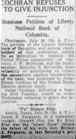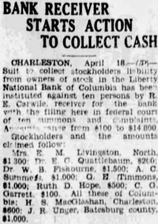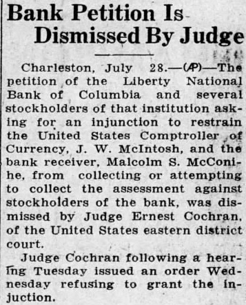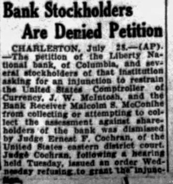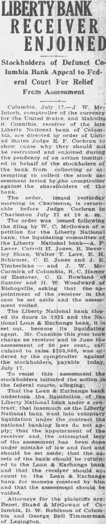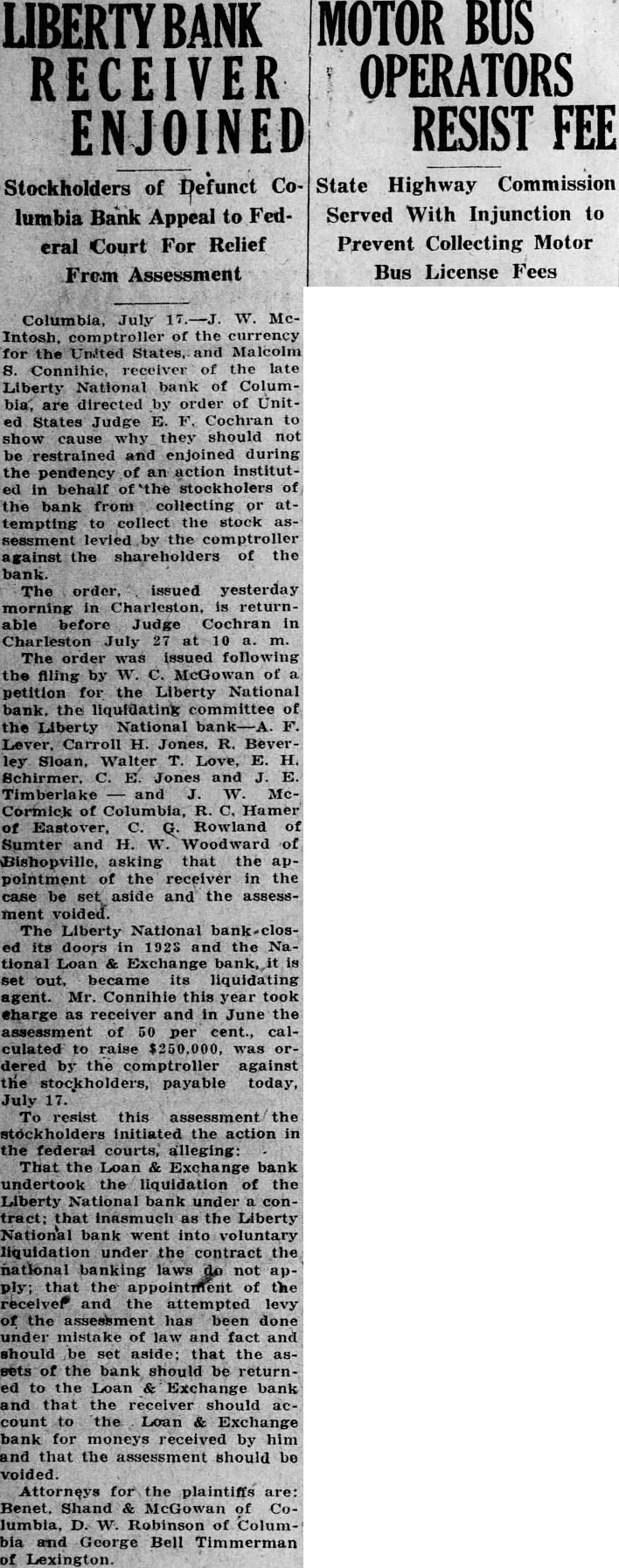 MOTOR BUS OPERATORS RESIST State Highway Commission Stockholders of Defunct to Fed- Served With Injunction to lumbia Bank Appeal eral Court For Relief Prevent Collecting Motor From Bus License Fees Assessment Columbia, McIntosh, comptroller of the of the late Liberty National bank of Columbia, directed by order of UnitStates Judge Cochran show cause why they should be restrained and enjoined during of action institutpendency in behalf stockholers of bank from collecting tempting collect stock levied the comptroller shareholders of the The issued yesterday morning returnJudge Cochran July order issued filing by McGowan petition the Liberty National bank. the liquidating committee the Liberty National Jones, ley Schirmer. Jones and Timberlake McCormick Columbia, Eastover, Rowland Sumter Woodward of Bishopville, asking that the pointment the in the aside and the ment voided. Liberty National its doors 1923 the tional Loan Exchange became liquidating agent. Mr. Connihie this took charge receiver and in June the assessment of 50 cent., calculated raise was dered by the comptroller against payable today, resist this assessment the stockholders initiated action federal courts, alleging: That Loan Exchange bank undertook the liquidation of the Liberty National under the Liberty National bank went voluntary liquidation under the contract the national not the the receiver and the attempted the assessment been done under mistake of law fact and should be aside; that the the bank should be the that the should count the Loan Exchange for by him that the assessment should be voided. Attorneys the plaintiffs Benet. Shand McGowan Columbia, Robinson Columand George Bell Timmerman Lexington.