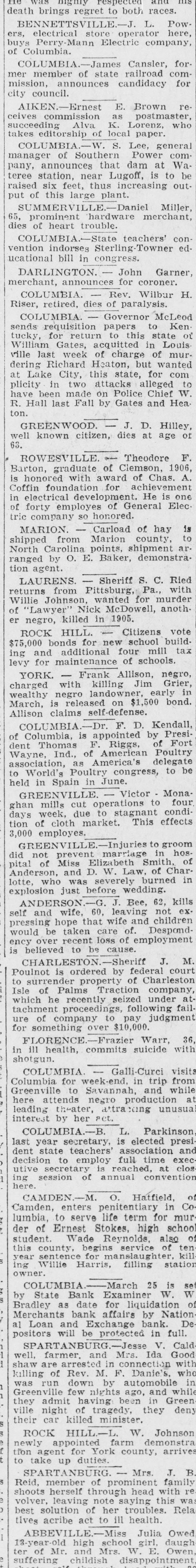 COLUMBIA. - Rev. Wilbur H Riser, retired, dies of paralysis. COLUMBIA. - Governor McLeo sends requisition papers to Ken tucky, for return to this state o William Gates, acquitted in Louis ville last week of charge of mur dering Richard Heaton, but wante at Lake City, this state, for com plicity in two attacks alleged t have been made on Police Chief W R. Hall last Fall by Gates and Hea ton. GREENWOOD. - J. D. Hilley well known citizen, dies at age o 63. ROWESVILLE. - Theodore F Barton, graduate of Clemson, 1906 is honored with award of Chas. A Coffin foundation for achievemen in electrical development. He is on of forty employes of General Elec tric company so honored. MARION. - Carload of hay 1 shipped from Marion county, to North Carolina points, shipment ar ranged by O. E. Baker, demonstra tion agent. LAURENS. - Sheriff S. C. Rie returns from Pittsburg, Pa., with Willie Johnson, wanted for murde of "Lawyer" Nick McDowell, anoth er negro, killed in 1905. ROCK HILL. - Citizens vote $75,000 bonds for new school build ing and additional four mill ta: levy for maintenance of schools. YORK. - Frank Allison, negro charged with killing Jim Grier wealthy negro landowner, early in March, is released on $1,500 bond Allison claims self-defense. COLUMBIA.-Dr. F. D. Kendall of Columbia, is appointed by Presi dent Thomas F. Riggs, of For Wayne, Ind., of American Poultr association, as America's delegat to World's Poultry congress, to b held in Spain in June. GREENVILLE. - Victor Mona ghan mills cut operations to fou days week, due to stagnant cond: tion of cloth market. This effect 3,000 employes. GREENVILLE.-Injuries to groon did not prevent marriage in hos pital of Miss Elizabeth Smith, o Anderson, and D. W. Law, of Char lotte, who was severely burned i: explosion just before wedding. ANDERSON.-G. J. Bee, 62, kill self and wife, 60, leaving not ex pressing hope that wife and childre would be taken care of. Despond ency over recent loss of employmen is believed to be cause. CHARLESTON.-Sheriff J. N Poulnot is ordered by federal cour to surrender property of Charlesto Isle of Palms Traction company which he recently seized under a tachment proceedings, following fai ure of company to pay judgmer for something over $10,000. FLORENCE.-Frazier Warr, 3 in ill health, commits suicide wit shotgun. COLUMBIA. - Galli-Curci visi Columbia for week-end, in trip fro Greenville to Savannah, and whi here attends negro production leading theater, attracong unusu interest by her act. COLUMBIA.-B. L. Parkinso last year secretary, is elected pres dent state teachers' association at decision to employ full time exe utive secretary is reached, at clc ing session of annual conventio here. CAMDEN.-M. O. Hatfield, Camden, enters penitentiary in C lumbia, to serve life term for mu der of Ernest Stokes, high scho student. Wade Reynolds, also this county, begins service of te year sentence for manslaughter, ki ing Willie Harris, filling stati owner. COLUMBIA.-March 25 is 8 by State Bank Examiner W. T Bradley as date for liquidation Merchants bank affairs by Natio al Loan and Exchange bank. D positors will be protected in full. SPARTANBURG.-Jesse V. Cal well, farmer. and Mrs. Ida Goc shaw are arrested in connection with killing of Rev. M. F. Danie's. wl was run down by automobile Greenville few nights ago, and whi they admit having been in Gree ville night of tragedy, they der their car killed minister. ROCK HILL.-L. W. Johnso newly appointed farm demonstr tion agent for York county, arriv to take up duties. SPARTANBURG. - Mrs. J. :