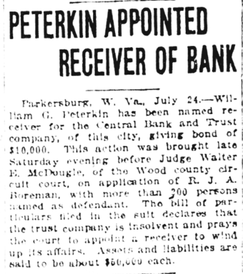 PETERKIN APPOINTED RECEIVER OF BANK Parkersburg, W. Va. July 24.-WIIliam G. Peterkin has been named receiver for the Central Bank and Trust company, of this city, giving bond of $10,000. This action was brought late Saturday evening before Judge Walter E. McDougle, of the Wood county circult court, on application of R. J. A. Boreman, with more than 300 persons named as defendant. The bill of parUculars filed in the suit declares that the trust company is Insolvent and prays the court to appoint a receiver to wind up its affairs. Assets and liabilities are said to be about $50,000 each.