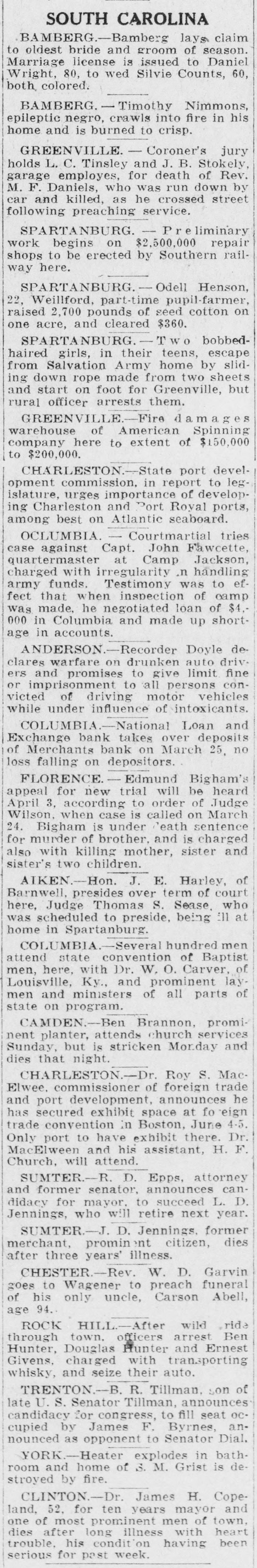 SOUTH CAROLINA BAMBERG.-Bamberg lays claim to oldest bride and groom of season. Marriage license is issued to Daniel Wright, 80, to wed Silvie Counts, 60, both colored. BAMBERG. Timothy Nimmons, epileptic negro, crawls into fire in his home and is burned to crisp. GREENVILLE. - Coroner's jury holds L. C. Tinsley and J. B. Stokely, garage employes, for death of Rev. M. F. Daniels, who was run down by car and killed, as he crossed street following preaching service. a .1 d work begins on $2,500,000 repair shops to be erected by Southern railway here. SPARTANBURG. Odell Henson, 22, Weillford, part-time pupil-farmer, raised 2,700 pounds of seed cotton on one acre, and cleared $360. SPARTANBURG. - Two bobbedhaired girls, in their teens, escape from Salvation Army home by sliding down rope made from two sheets and start on foot for Greenville, but rural officer arrests them. persons 30 warehouse of American Spinning company here to extent of $150,000 0000002$ 07 CHARLESTON.-State port development commission. in report to legislature. urges importance of developing Charleston and Port Royal ports, among best on Atlantic seaboard. OCLUMBIA. - Courtmartial tries case against Capt. John Fawcette, quartermaster at Camp Jackson, charged with irregularity n handling army funds. Testimony was to effeet that when inspection of camp was made. he negotiated loan of $4.000 in Columbia and made up shortage in accounts. ANDERSON.-Recorder Doyle declares warfare on drunken auto driv. ers and promises to give limit fine or imprisonment to all persons convicted of driving motor vehicles while under influence of intoxicants. COLUMBIA.-National Loan and Exchange bank takes over deposits ou 25. March uo bank Merchants JO loss falling on depositors. FLORENCE. Edmund Bigham's appeal for new trial will be heard April 3, according to order of Judge Wilson. when case is called on March 24. Bigham is under 'eath sentence for murder of brother. and is charged also with killing mother, sister and sister's two children. AIKEN.-Hon. J. E. Harley, of Barnwell, presides over term of court here, Judge Thomas S. Sease. who was scheduled to preside, being ill at home in Spartanburg. COLUMBIA.-Several hundred men attend state convention of Baptist men, here, with Dr. W. O. Carver, of Louisville, Ky., and prominent laymen and ministers of all parts of state on program. CAMDEN.-Ben Brannon, prominent planter, attends church services Sunday, but is stricken Monday and dies that night. CHARLESTON.-Dr Roy S. MacElwee. commissioner of foreign trade and port development, announces he has secured exhibit space at fo eign trade convention in Boston, June 4-5. Only port to have exhibit there. Dr. MacElween and his assistant, H. F. Church, will attend. SUMTER.-R. D. Epps, attorney and former senator, announces candidacy for mayor. to succeed L. D. Jennings, who will retire next year. SUMTER.-J. D. Jennings, former merchant, promin ent citizen, dies after three years' illness. CHESTER.-Rev. W. D. Garvin goes to Wagener to preach funeral of his only uncle, Carson Abell, 94 ROCK HILL-After wild ride through town. officers arrest Ben Hunter, Douglas Hunter and Ernest Givens. charged with transporting whisky, and seize their auto. TRENTON.-B. R. Tillman, son of late U. S. Senator Tillman, announces candidacy for congress, to fill seat OCcupied by James F. Byrnes, announced as opponent to Senator Dial. YORK.-Heater explodes in bath. room and home of 3. M. Grist is destroyed by fire. CLINTON.-Dr. James H. Copeland, 52, for ten years mayor and one of most prominent men of town, dies after long illness with heart trouble, his condit on having been