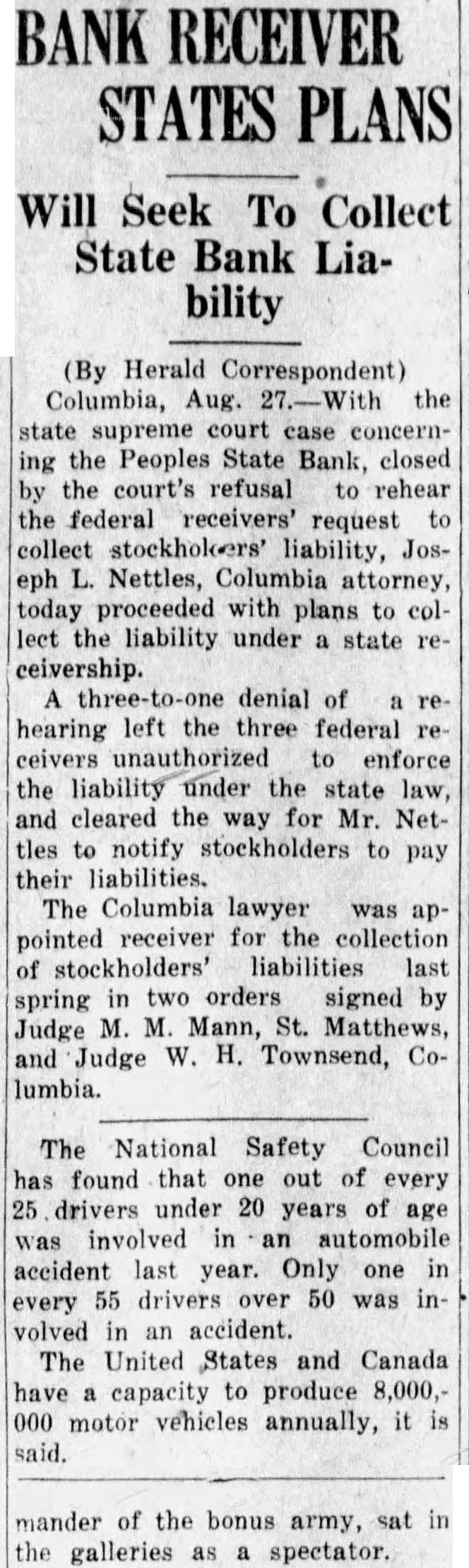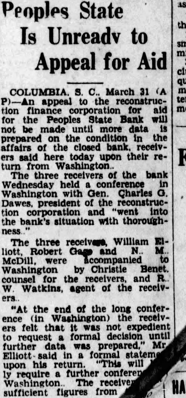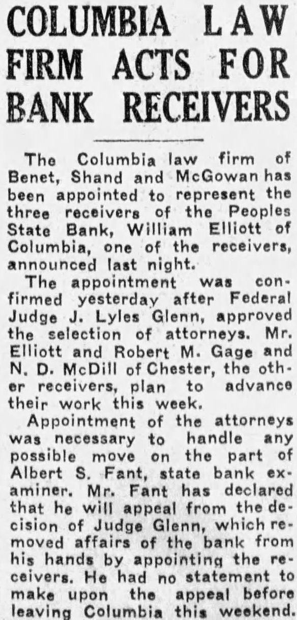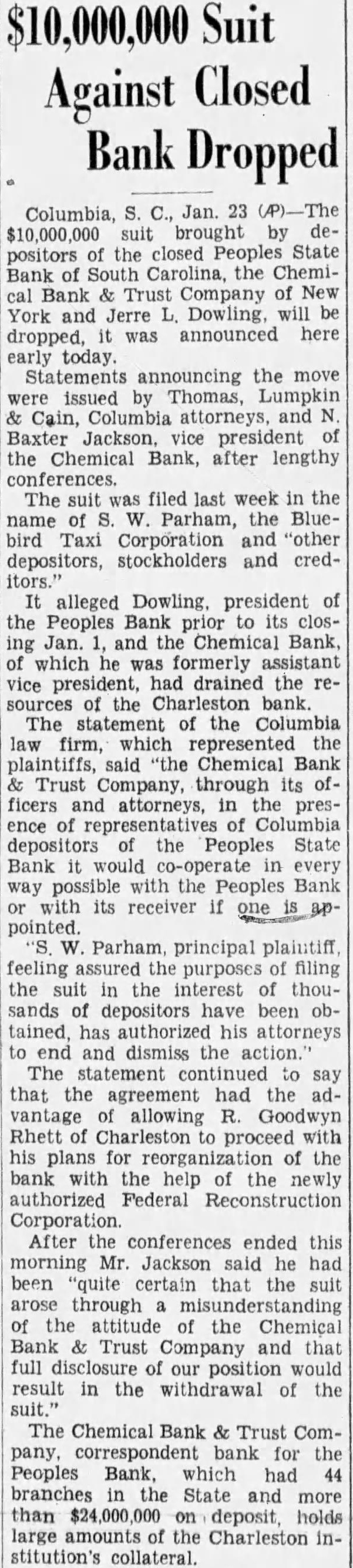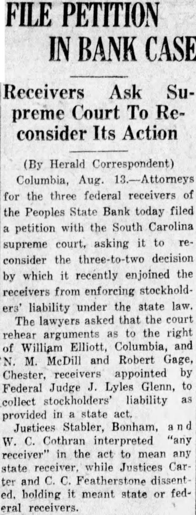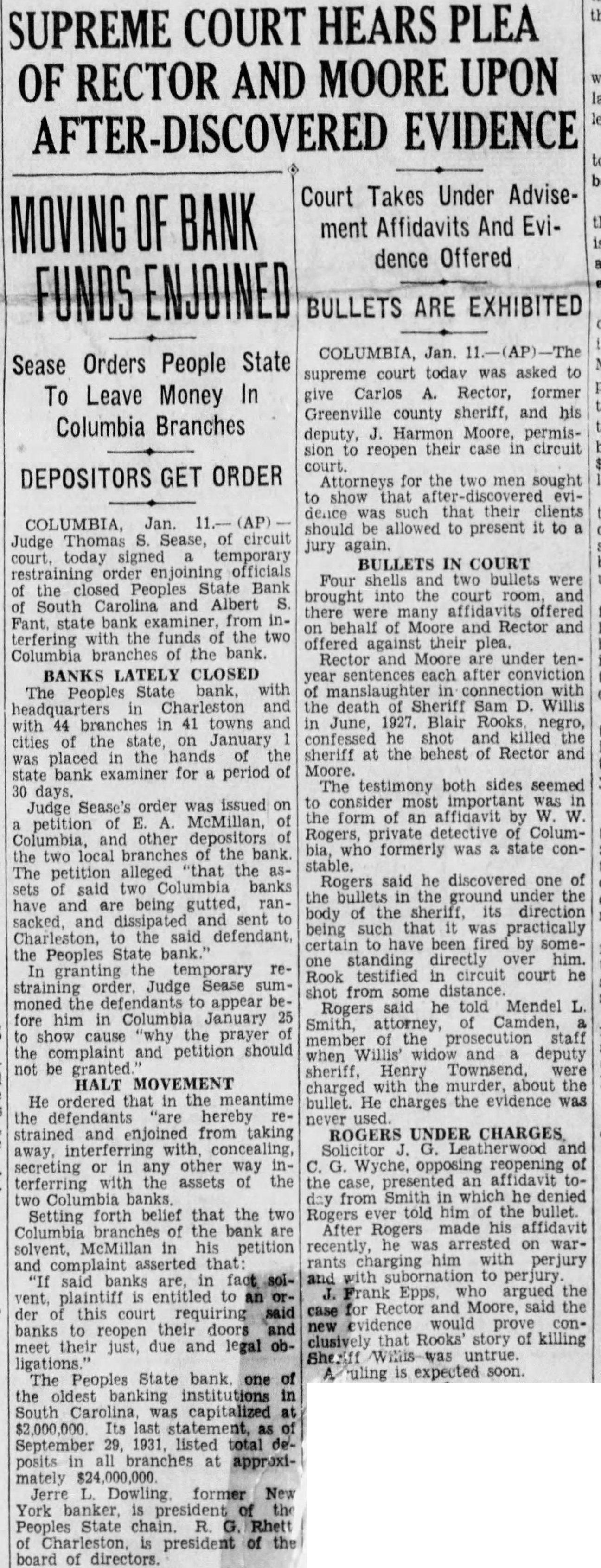 SUPREME COURT HEARS PLEA OF RECTOR AND MOORE UPON AFTER-DISCOVERED EVIDENCE Sease Orders People State To Leave Money In Columbia Branches DEPOSITORS GET ORDER COLUMBIA, Jan. Judge Thomas Sease, of circuit today signed temporary enjoining officials restraining order the closed Peoples State Bank South Carolina and Albert Fant. state bank examiner, from terfering the funds of the two Columbia the bank. BANKS LATELY CLOSED The Peoples State bank, with headquarters Charleston with 44 in towns cities the January placed the hands the bank examiner for period Judge Sease's order was issued on petition Columbia, other the two local branches the bank. petition alleged the said Columbia banks sets have and are being gutted, ransacked. and sent Charleston, the said the Peoples State temporary order Judge Sease moned the defendants appear fore Columbia January show "why the prayer the complaint and petition should be granted HALT MOVEMENT He ordered that the meantime the defendants "are hereby strained and enjoined from taking away, concealing, secreting any other way terferring the assets Setting forth belief that the two Columbia branches the bank solvent, McMillan his petition that said banks plaintiff to this court requiring banks to reopen their doors meet their just, due and ligations The Peoples State oldest banking was capitalized Its statement, September listed posits branches at mately Jerre Dowling former New York banker, Peoples State chain. Charleston, president of board of directors. Court Takes Under Advisement Affidavits And Evidence Offered BULLETS ARE EXHIBITED COLUMBIA, Jan. supreme court todav was asked to Carlos Rector, former give Greenville county sheriff, and his deputy, Harmon Moore, permission to reopen their case in circuit Attorneys for the two men sought show was such that their clients should allowed to present it to jury BULLETS IN COURT Four shells bullets brought the court room, there many offered on behalf Moore and Rector and offered their Rector and Moore are under tenyear sentences each after conviction manslaughter the death Sam D. Willis in June, 1927. Blair Rooks negro, confessed shot and killed the sheriff at the behest of Rector and Moore. The testimony both sides seemed consider most important was form of an affidavit by Rogers, private detective Columbia, formerly state constable. Rogers said he discovered one of the the ground under the body sheriff, its direction being such that was practically certain been fired somestanding directly him. Rook testified circuit court he shot from some distance. Rogers he told Mendel Smith, attorney, Camden, member staff when and deputy sheriff. Henry Townsend, were murder, about charged bullet. He charges the evidence never used. ROGERS UNDER CHARGES and Wyche, opposing reopening case, presented he denied Rogers told him bullet. After Rogers made affidavit was arrested warcharging with to perjury. argued the Rector and Moore, said the would Rooks' story killing untrue. expected soon.