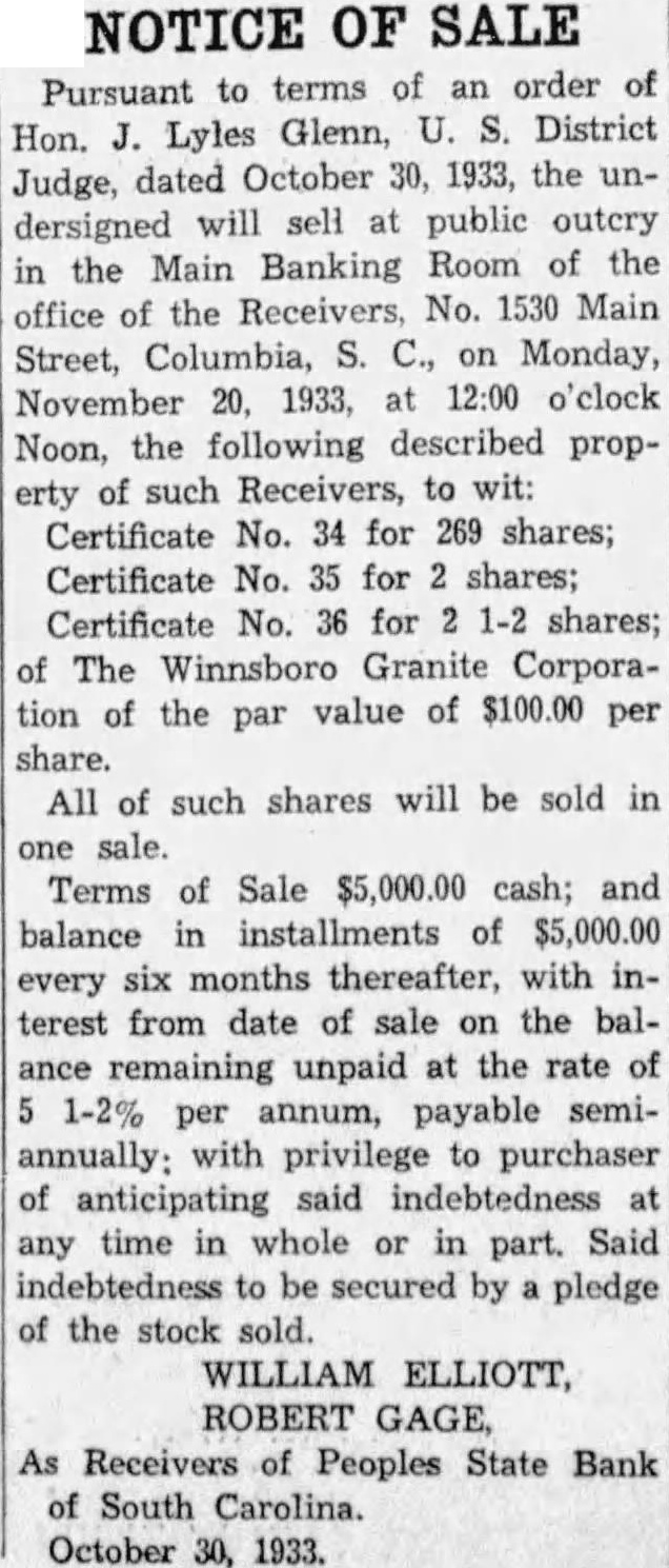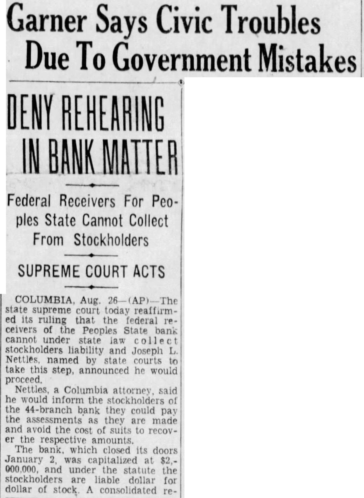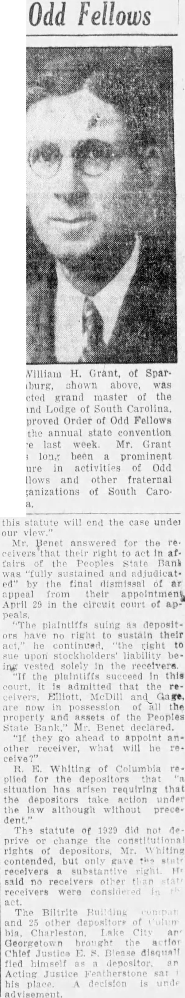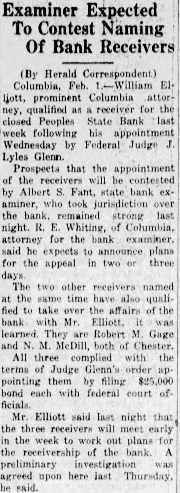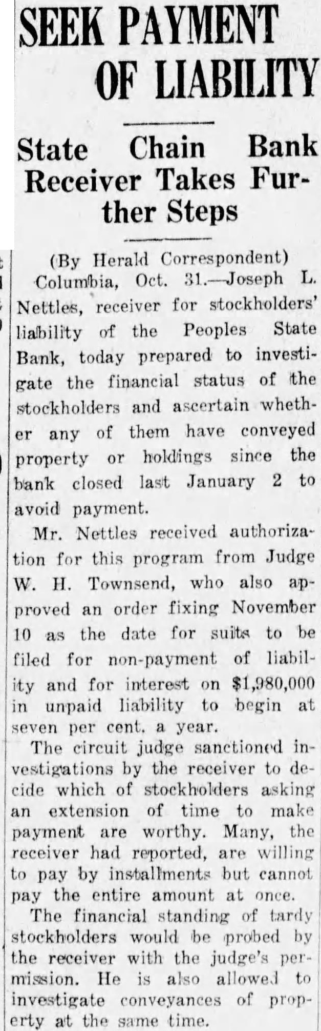 SUPREME COURT HEARS PLEA OF RECTOR AND MOORE UPON AFTER-DISCOVERED EVIDENCE Sease Orders People State To Leave Money In Columbia Branches DEPOSITORS GET ORDER COLUMBIA, Jan. Judge Thomas Sease, of circuit today signed temporary enjoining officials restraining order the closed Peoples State Bank South Carolina and Albert Fant. state bank examiner, from terfering the funds of the two Columbia the bank. BANKS LATELY CLOSED The Peoples State bank, with headquarters Charleston with 44 in towns cities the January placed the hands the bank examiner for period Judge Sease's order was issued on petition Columbia, other the two local branches the bank. petition alleged the said Columbia banks sets have and are being gutted, ransacked. and sent Charleston, the said the Peoples State temporary order Judge Sease moned the defendants appear fore Columbia January show "why the prayer the complaint and petition should be granted HALT MOVEMENT He ordered that the meantime the defendants "are hereby strained and enjoined from taking away, concealing, secreting any other way terferring the assets Setting forth belief that the two Columbia branches the bank solvent, McMillan his petition that said banks plaintiff to this court requiring banks to reopen their doors meet their just, due and ligations The Peoples State oldest banking was capitalized Its statement, September listed posits branches at mately Jerre Dowling former New York banker, Peoples State chain. Charleston, president of board of directors. Court Takes Under Advisement Affidavits And Evidence Offered BULLETS ARE EXHIBITED COLUMBIA, Jan. supreme court todav was asked to Carlos Rector, former give Greenville county sheriff, and his deputy, Harmon Moore, permission to reopen their case in circuit Attorneys for the two men sought show was such that their clients should allowed to present it to jury BULLETS IN COURT Four shells bullets brought the court room, there many offered on behalf Moore and Rector and offered their Rector and Moore are under tenyear sentences each after conviction manslaughter the death Sam D. Willis in June, 1927. Blair Rooks negro, confessed shot and killed the sheriff at the behest of Rector and Moore. The testimony both sides seemed consider most important was form of an affidavit by Rogers, private detective Columbia, formerly state constable. Rogers said he discovered one of the the ground under the body sheriff, its direction being such that was practically certain been fired somestanding directly him. Rook testified circuit court he shot from some distance. Rogers he told Mendel Smith, attorney, Camden, member staff when and deputy sheriff. Henry Townsend, were murder, about charged bullet. He charges the evidence never used. ROGERS UNDER CHARGES and Wyche, opposing reopening case, presented he denied Rogers told him bullet. After Rogers made affidavit was arrested warcharging with to perjury. argued the Rector and Moore, said the would Rooks' story killing untrue. expected soon.