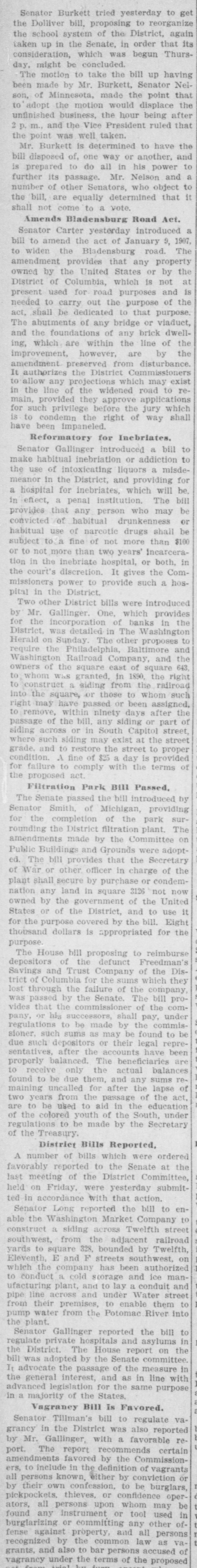 Senator Burkett tried yesterday to get the Dolliver bill, proposing to reorganize the school system of the District, again taken up in the Senate, in order that its consideration, which was begun Thursday, might be concluded. The motion to take the bill up having been made by Mr. Burkett, Senator Nelson, of Minnesota, made the point that to adopt the motion would displace the unfinished business, the hour being after and the Vice President ruled that the point was well taken. Mr. Burkett is determined to have the bill disposed of. one way or another, and is prepared to do all in his power to further its passage. Mr. Nelson and a number of other Senators, who object to the bill. are equally determined that it shall not come to a vote. Amends Bladensburg Road Act. Senator Carter yesterday introduced a bill to amend the act of January 9. 1907, to widen the Bladensburg road. The amendment provides that any property owned by the United States or by the District of Columbia, which is not at present used for road purposes and is needed to carry out the purpose of the act, shall be dedicated to that purpose. The abutments of any bridge or viaduct, and the foundations of any brick dwelling, which are within the line of the improvement, however, are by the amendment preserved from disturbance. It authorizes the District Commissioners to allow any projections which may exist in the line of the widened road to remain, provided they approve applications for such privilege before the jury which is to condemn the right of way shall have been impaneled. Reformatory for Inebriates, Senator Gallinger introduced a bill to make habitual inebriation or addiction to the use of intoxicating liquors a misdemeanor in the District, and providing for a hospital for inebriates, which will be, in effect, a penal institution. The bill provides that any person who may be convicted of habitual drunkenness or habitual use of narcotic drugs shall be subject to a fine of not more than $100 or to not more than two years' incarceration in the inebriate hospital, or both, in the court's discretion, It gives the Commissioners power to provide such a hospital in the District Two other District bills were introduced by Mr. Gallinger. One, which provides for the incorporation of banks in the District, was detailed in The Washington Herald on Sunday The other proposes to require the Philadelphia, Baltimore and Washington Railroad Company, and the owners of the square east of square 643 to whom Was granted, in 1890. the right to construct a siding from the railroad into the square, or those to whom such right may have passed or been assigned, to remove, within ninety days after the passage of the bill. any siding or part of siding across or in South Capitol street, where such siding may exist at the street grade. and to restore the street to proper condition. A fine of $25 day is provided for failure to comply with the terms of the proposed act Filtration Park Bill Passed, The Senate passed the bill introduced by Senator Smith, of Michigan, providing for the completion of the park surrounding the District filtration plant. The amendments made by the Committee on Public Buildings and Grounds were adopted. The bill provides that the Secretary of War or other officer in charge of the plant shall secure by purchase or condemnation any land in square 3126 not now owned by the government of the United States or of the District, and to use it for the purpose covered by the bill. Eight thousand dollars is appropriated for the purpose. The House bill proposing to reimburse depositors of the defunct Freedman's Savings and Trust Company of the District of Columbia for the sums which they lost through the failure of the company was passed by the Senate. The bill provides that the commissioner of the company, or his successors, shall pay, under regulations to be made by the commissioner. such sums as may be found to be due such depositors or their legal representatives, after the accounts have been properly balanced. The beneficiaries are to receive only the actual balances found to be due them, and any sums remaining uncalled for after the lapse of two years from the passage of the act, are to be used to aid in the education of the colored youth of the South, under regulations to be made by the Secretary of the Treasury District Bills Reported, A number of bills which were ordered favorably reported to the Senate at the last meeting of the District Committee, held on Friday, were yesterday submitted in accordance with that action. Senator Long reported the bill to enable the Washington Market Company to construct a siding across Twelfth street southwest, from the adjacent railroad yards to square 328, bounded by Twelfth. Eleventh, E and F streets southwest. on which the company has been authorized to conduct a cold storage and ice manufacturing plant, and to lay a conduit and pipe line across and under Water street from their premises, to enable them to pump water from the Potomac River into the plant. Senator Gallinger reported the bill to regulate private hospitals and asylums in the District. The House report on the bill was adopted by the Senate committee. It advocate the passage of the measure in the general interest. and as in line with advanced legislation for the same purpose in a majority of the States. Vagrancy Bill is Favored. Senator Tillman's bill to regulate vagrancy in the District was also reported by Mr. Gallinger. with a favorable report. The report recommends certain amendments favored by the Commissioners, to include in the definition of vagrants all persons known either by conviction or by their own confession. to be burglars, pickpockets, thieves, or confidence operators, all persons upon whom may be found any instrument or tool used in burglarizing OF committing any other offense against property, and all persons recognized by the common law as vagrants. and also to bar persons accused of vagrancy under the terms of the