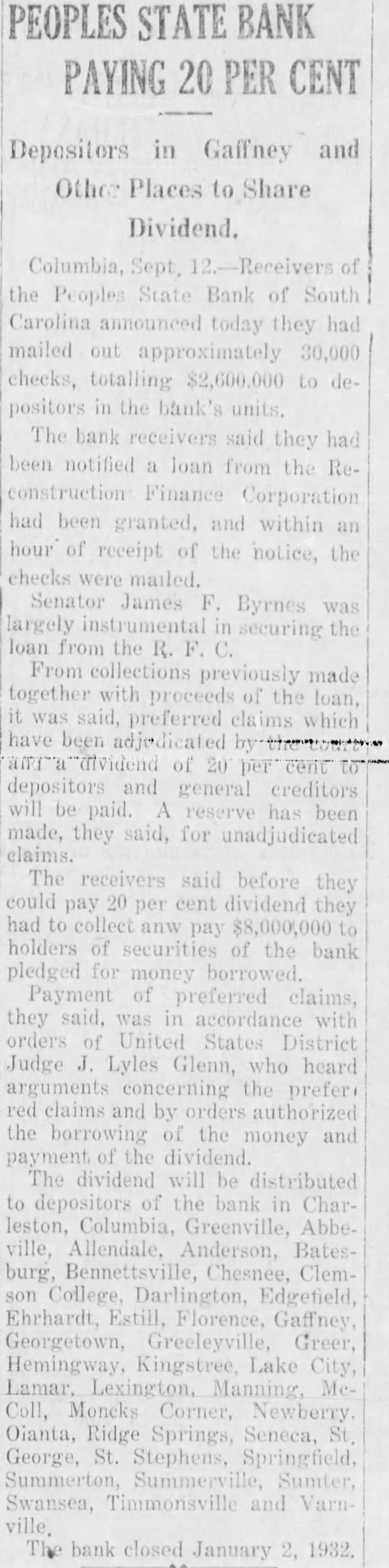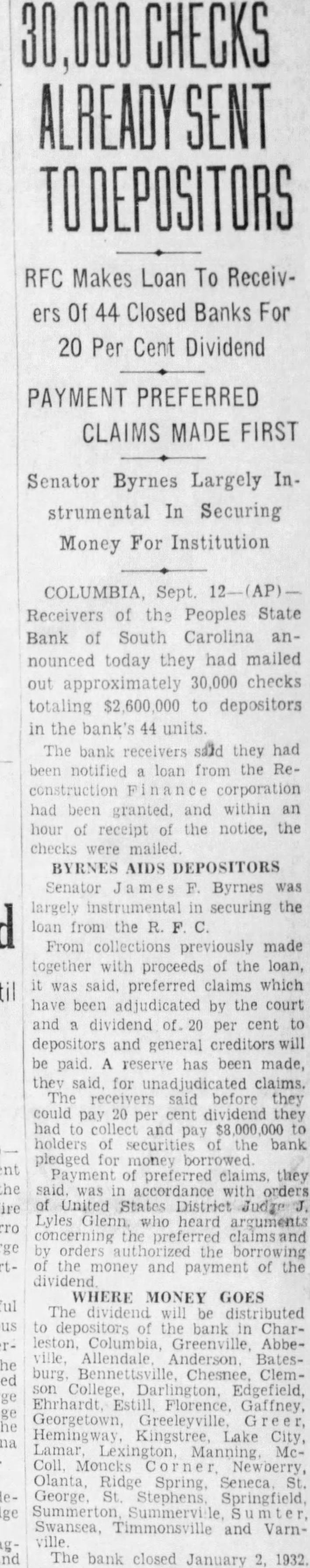 ALREADY SENT RFC Makes Loan To Receivers Of 44 Closed Banks For 20 Per Cent Dividend PAYMENT PREFERRED CLAIMS MADE FIRST Senator Byrnes Largely Instrumental In Securing Money For Institution COLUMBIA, Sept. 12-(AP)Receivers of the Peoples State Bank of South Carolina announced today they had mailed out approximately 30,000 checks totaling $2,600,000 to depositors in the bank's 44 units. The bank receivers sald they had notified loan from the Reconstruction corporation had been granted, and within an hour of receipt of the notice, the checks were mailed BYRNES AIDS DEPOSITORS Senator James F. Byrnes was largely instrumental in securing the loan from the R. From collections previously made together with proceeds of the loan, it was said preferred claims which have been adjudicated by the court and of 20 per cent to depositors and general creditors will be paid. A reserve has been made, they said, for claims. The said they pay 20 dividend they had and pay to holders of securities the bank pledged for money Payment of preferred claims, they said. was accordance with orders United States District Judge Lyles Glenn, heard arguments the claimsand orders the the money and payment of the dividend WHERE MONEY GOES The dividend distributed depositors the bank in CharColumbia, Greenville Abbeville. Allendale Anderson, Batesburg Bennettsville, Chesnee, Clemson College Darlington, Edgefield, Georgetown, Greeleyville Hemingway Kingstree Lake City, Manning Olanta, Ridge Spring, Seneca George Stephens Springfield, Summerton Summervi Swansea, Timmonsville and VarnThe bank closed January 2, 1932.