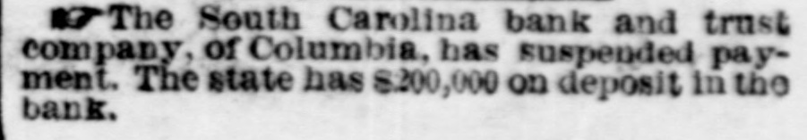 The South Carolina bank and trust company, of Columbia, has suspended payment. The state has $200,000 on deposit in the bank.