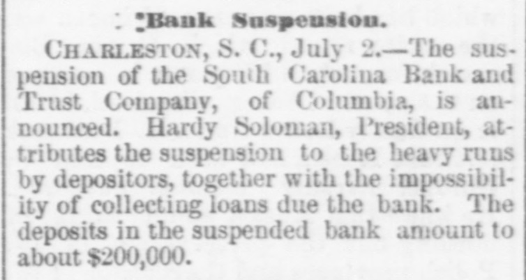 : "Bank Suspension. CHARLESTON, S. €., July 2.-The suspension of the South Carolina Bank and Trust Company, of Columbia, is announced. Hardy Soloman, President, attributes the suspension to the heavy runs by depositors, together with the impossibility of collecting loans due the bank. The deposits in the suspended bank amount to about $200,000.