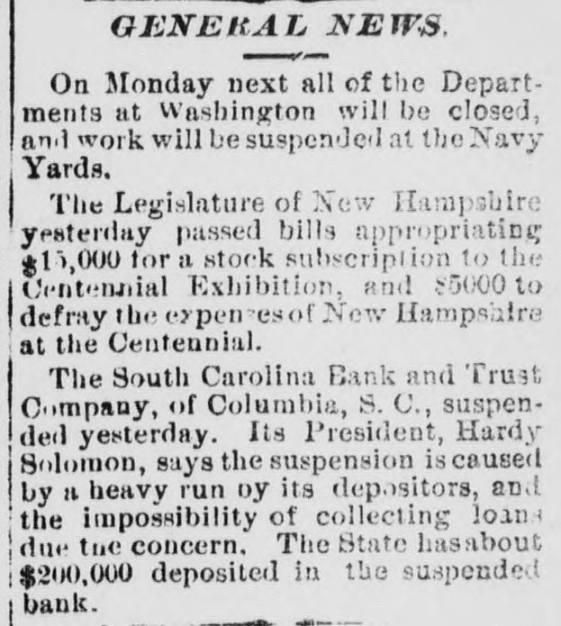 GENERAL NEWS. On Monday next all of the Departments at Washington will be closed, and work will be suspended at the Navy Yards. The Legislature of New Hampshire yesterday passed bills appropriating $15,000 for a stock subscription to the Centennial Exhibition, and 85000 to defray the expenses of New Hampshire at the Centennial. The South Carolina Bank and Trust Company, of Columbia, S. C., suspended yesterday. Its President, Hardy Solomon, says the suspension is caused by 11 heavy run by its depositors, and the impossibility of collecting loans due the concern. The State hasabout $200,000 deposited in the suspended bank.