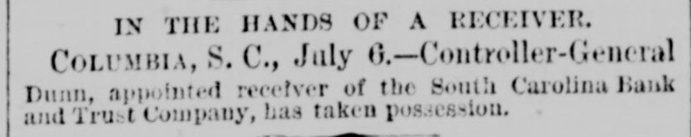 IN THE HANDS OF A RECEIVER. COLUMBIA, S. C., July 6.-Controller-General Dunn, appointed receiver of the South Carolina Bank and Trust Company, has taken possession.