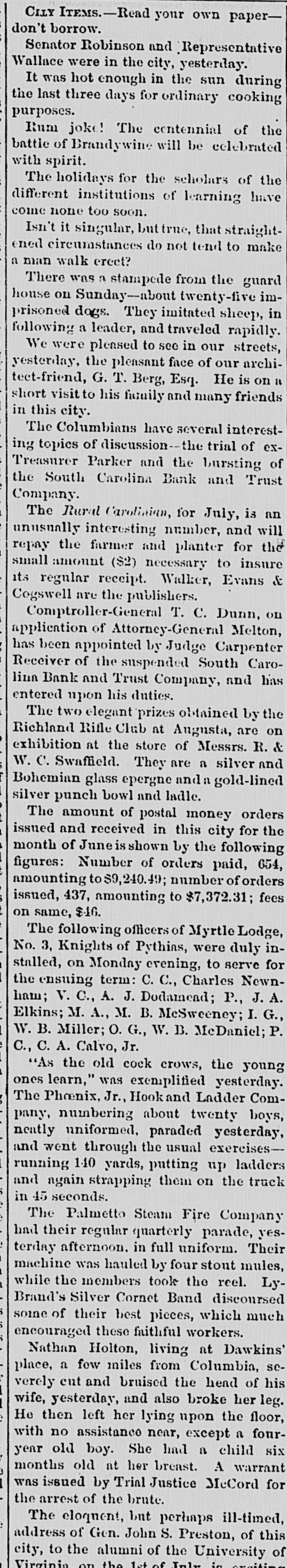 CILY ITEMS.-Read your own paperdon't borrow. Senator Robinson and Representative Wallace were in the city, yesterday. It was hot enough in the sun during the last three days for ordinary cooking purposes. Rum joke! The contennial of the battle of Brandywine will be celebrated with spirit. The holidays for the scholars of the different institutions of learning have come none too soon. Isn't it singular, but true, that straightened circumstances do not tend to make a man walk crect? There was a stampede from the guard house on Sunday-about twenty-five imprisoned dogs. They imitated sheep, in following a leader, and traveled rapidly. We were pleased to see in our streets, yesterday, the pleasant face of our architect-friend, G. T. Berg, Esq. He is on a short visit to his family and many friends in this city. The Columbians have several interesting topics of discussion-the trial of exTreasurer Parker and the bursting of the South Carolina Bank and Trust Company. The Rural Carolinian, for July, is an unusually interesting number, and will repay the farmer and planter for the small amount ($2) necessary to insure its regular receipt. Walker, Evans & Cogswell are the publishers. Comptroller-General T. C. Dunn, on application of Attorney-General Melton, has been appointed by Judge Carpenter Receiver of the suspended South Carolina Bank and Trust Company, and has entered upon his duties. The two elegant prizes obtained by the Richland Rifle Club nt Augusta, are on exhibition at the store of Messrs. R. & W. C. Swaffield. They are a silver and Bohemian glass epergne and a gold-lined silver punch bowl and ladle. The amount of postal money orders issued and received in this city for the month of Juneisshown by the following figures: Number of orders paid, 654, amounting to $9,240.49; number of orders issued, 437, amounting to $7,372.31; fees on same, $16. The following officers of Myrtle Lodge, No. 3, Knights of Pythias, were duly installed, on Monday evening, to serve for the ensuing term: C. C., Charles Newnham; V. C., A. J. Dodamend; P., J. A. Elkins; M. A., M. B. McSweeney; I. G., W. B. Miller; O. G., W. B. McDaniel; P. C., C. A. Calvo, Jr. "As the old cock crows, the young ones learn," was exemplified yesterday. The Phoenix, Jr., Hookand Ladder Company, numbering about twenty boys, neatly uniformed, paraded yesterday, and went through the usual exercisesrunning 140 yards, putting up ladders and again strapping them on the truck in 45 seconds. The Palmetto Steam Fire Company had their regular quarterly parade, yesterday afternoon. in full uniform. Their machine was hauled by four stout mules, while the members took the reel. LyBrand's Silver Cornet Band discoursed some of their best pieces, which much encouraged these faithful workers. Nathan Holton, living at Dawkins' place, a few miles from Columbia, severely cut and bruised the head of his wife, yesterday, and also broke her leg. He then left her lying upon the floor, with no assistance near, except a fouryear old boy. She had a child six months old at her breast. A warrant was issued by Trial Justice McCord for the arrost of the brute