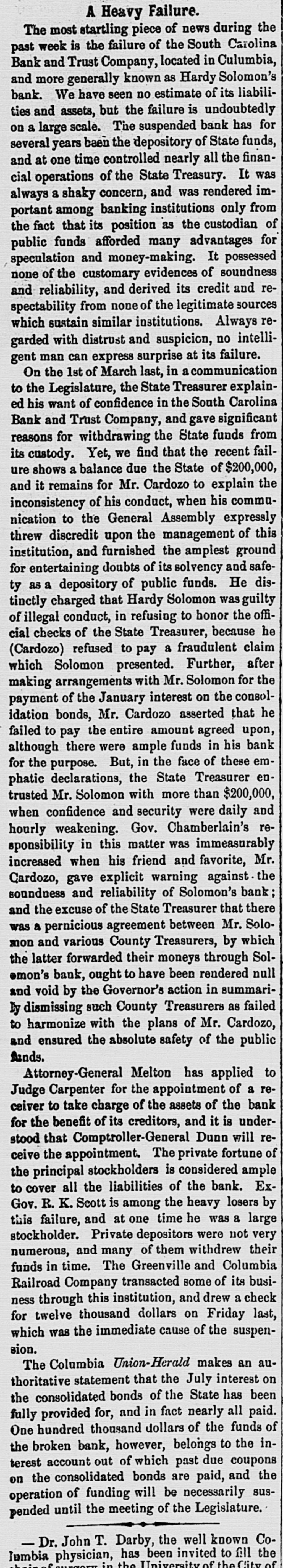 A Heavy Failure. The most startling piece of news during the past week is the failure of the South Carolina Bank and Trust Company, located in Culumbia, and more generally known as Hardy Solomon's bank. We have seen no estimate of its liabilities and assets, but the failure is undoubtedly on a large scale. The suspended bank has for several years been the depository of State funds, and at one time controlled nearly all the financial operations of the State Treasury. It was always a shaky concern, and was rendered important among banking institutions only from the fact that its position as the custodian of public funds afforded many advantages for speculation and money-making. It possessed none of the customary evidences of soundness and reliability, and derived its credit and respectability from none of the legitimate sources which sustain similar institutions. Always regarded with distrust and suspicion, no intelligent man can express surprise at its failure. On the 1st of March last, in a communication to the Legislature, the State Treasurer explained his want of confidence in the South Carolina Bank and Trust Company, and gave significant reasons for withdrawing the State funds from its custody. Yet, we find that the recent failure shows a balance due the State of $200,000, and it remains for Mr. Cardozo to explain the inconsistency of his conduct, when his communication to the General Assembly expressly threw discredit upon the management of this institution, and furnished the amplest ground for entertaining doubts of its solvency and safety as a depository of public funds. He distinctly charged that Hardy Solomon was guilty of illegal conduct, in refusing to honor the official checks of the State Treasurer, because he (Cardozo) refused to pay a fraudulent claim which Solomon presented. Further, after making arrangements with Mr. Solomon for the payment of the January interest on the consolidation bonds, Mr. Cardozo asserted that he failed to pay the entire amount agreed upon, although there were ample funds in his bank for the purpose. But, in the face of these emphatic declarations, the State Treasurer entrusted Mr. Solomon with more than $200,000, when confidence and security were daily and hourly weakening. Gov. Chamberlain's responsibility in this matter was immeasurably increased when his friend and favorite, Mr. Cardozo, gave explicit warning against the soundness and reliability of Solomon's bank and the excuse of the State Treasurer that there was a pernicious agreement between Mr. Solomon and various County Treasurers, by which the latter forwarded their moneys through Solemon's bank, ought to have been rendered null and void by the Governor's action in summarily dismissing such County Treasurers as failed to harmonize with the plans of Mr. Cardozo, and ensured the absolute safety of the public funds. Attorney-General Melton has applied to Judge Carpenter for the appointment of a receiver to take charge of the assets of the bank for the benefit of its creditors, and it is understood that Comptroller-General Dunn will receive the appointment. The private fortune of the principal stockholders is considered ample to cover all the liabilities of the bank. ExGov. R. K. Scott is among the heavy losers by this failure, and at one time he was a large stockholder. Private depositors were not very numerous, and many of them withdrew their funds in time. The Greenville and Columbia Railroad Company transacted some of its business through this institution, and drew a check for twelve thousand dollars on Friday last, which was the immediate cause of the suspension. The Columbia Union-Herald makes an authoritative statement that the July interest on the consolidated bonds of the State has been fully provided for, and in fact nearly all paid. One hundred thousand dollars of the funds of the broken bank, however, belongs to the interest account out of which past due coupons on the consolidated bonds are paid, and the operation of funding will be necessarily suspended until the meeting of the Legislature. - Dr. John T. Darby, the well known Columbia physician, has been invited to fill the in the University of the City of