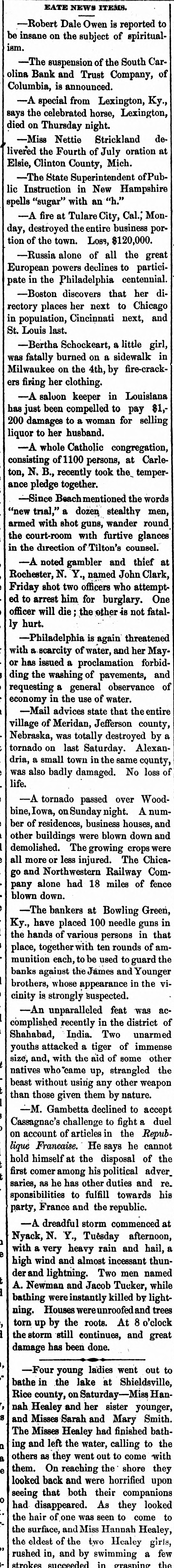 EATE NEWS ITEMS. -Robert Dale Owen is reported to be insane on the subject of spiritualism. -The suspension of the South Carolina Bank and Trust Company, of Columbia, is announced. -A special from Lexington, Ky., says the celebrated horse, Lexington, died on Thursday night. -Miss Nettie Strickland delivered the Fourth of July oration at Elsie, Clinton County, Mich. -The State Superintendent of Public Instruction in New Hampshire spells "sugar" with an "h." -A fire at Tulare City, Cal.; Monday, destroyed the entire business portion of the town. Loss, $120,000. -Russia alone of all the great European powers declines to participate in the Philadelphia centennial. -Boston discovers that her directory places her next to Chicago in population, Cincinnati next, and St. Louis last. -Bertha Schockeart, a little girl, was fatally burned on a sidewalk in Milwaukee on the 4th, by fire-crackers firing her clothing. -A saloon keeper in Louisiana has just been compelled to pay $1,200 damages to a woman for selling liquor to her husband. -A whole Catholic congregation, consisting of 1100 persons, at Carleton, N. B., recently took the temperance pledge together. -Since Beachmentioned the words "new trial," a dozen stealthy men, armed with shot guns, wander round the court-room with furtive glances in the direction of Tilton's counsel. -A noted gambler and thief at Rochester, N. Y., named John Clark, Friday shot two officers who attempted to arrest him for burglary. One officer will die; the other is not fatally hurt. -Philadelphia is again threatened with a scarcity of water, and her Mayor has issued a proclamation forbidding the washing of pavements, and requesting a general observance of economy in the use of water. -Mail advices state that the entire village of Meridan, Jefferson county, Nebraska, was totally destroyed by a tornado on last Saturday. Alexandria, a small town in the same county, was also badly damaged. No loss of life. -A tornado passed over Woodbine,Iowa, Sunday night. A number of residences, business houses, and other buildings were blown down and demolished. The growing crops were all more or less injured. The Chicago and Northwestern Railway Company alone had 18 miles of fence blown down. -The bankers at Bowling Green, Ky., have placed 100 needle guns in the hands of various persons in that place, together with ten rounds of ammunition each, to be used to guard the banks against the James and Younger brothers, whose appearance in the vicinity is strongly suspected. -An unparalleled feat was accomplished recently in the district of Shahabad, India. Two unarmed youths attacked a tiger of immense size, and, with the aid of some other natives who came up, strangled the beast without using any other weapon than those given them by nature. -M. Gambetta declined to accept Cassagnac's challenge to fight a duel on account of articles in the Republique Francaise. He says he cannot hold himself at the disposal of the first comer among his political adver saries, as he has other duties and re. sponsibilities to fulfill towards his party, France and the republic. -A dreadful storm commenced at Nyack, N. Y., Tuesday afternoon, with a very heavy rain and hail, a high wind and almost incessant thunder and lightning. Two men named A. Newman and Jacob Tucker, while bathing were instantly killed by lightning. Houses were unroofed and trees torn up by the roots. At 8 o'clock the storm still continues, and great damage has been done. -Four young ladies went out to bathe in the lake at Shieldsville, Rice county, on Saturday-Miss Hannah Healey and her sister younger, and Misses Sarah and Mary Smith. The Misses Healey had finished bathing and left the water, calling to the others as they went out to come with them. On reaching the shore they looked back and were horrified upon seeing that both their companions had disappeared. As they looked the hair of one was seen to come to the surface, and Miss Hannah Healey, the eldest of the two Healey girls, rushed in, and by swimming a few strokes succeeded in grasping the