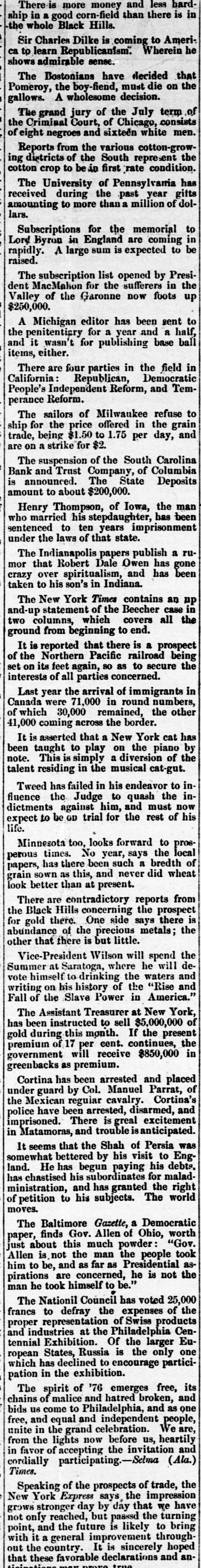There is more money and less hardship in a good corn-field than there is in the whole Black Hills. Sir Charles Dilke is coming to America to learn Republicanfsm. Wherein he shows admirable sense. The Bostonians have decided that Pomeroy, the boy-fiend, must die on the gallows. A wholesome decision. The grand jury of the July term of the Criminal Court, of Chicago, consists of eight negroes and sixteen white men. Reports from the various cotton-growing districts of the South represent the cotton crop to be in first (rate condition. The University of Pennsylvarria has received during the past year gifts amounting to more than a million of dollars. Subscriptions for the memorial to Lord Byron in England are coming in rapidly. A large sum is expected to be raised. The subscription list opened by President MacMahon for the sufferers in the Valley of the Garonne now foots up $250,000. A Michigan editor has been sent to the penitentiary for a year and a half, and it wasn't for publishing base ball items, either. There are four parties in the field in California: Republican, Democratic People's Independent Reform, and Temperance Reform. The sailors of Milwaukee refuse to ship for the price offered in the grain trade, being $1.50 to 1.75 per day, and are on a strike for $2. The suspension of the South Carolina Bank and Trust Company, of Columbia is announced. The State Deposits amount to about $200,000. Henry Thompson, of Iowa, the man who married his stepdaughter, has been sentenced to ten years imprisonment under the laws of that state. The Indianapolis papers publish a rumor that Robert Dale Owen has gone crazy over spiritualism, and has been taken to his son's in Indiana. The New York Times contains an up and-up statement of the Beecher case in two columns, which covers all the ground from beginning to end. It is reported that there is a prospect of the Northern Pacific railroad being set on its feet again, 80 as to secure the interests of all parties concerned. Last year the arrival of immigrants in Canada were 71,000 in round numbers, of which 30,000 remained, the other 41,000 coming across the border. It is asserted that a New York cat has been taught to play on the piano by note. This is simply a diversion of the talent residing in the musical cat-gut. Tweed has failed in his endeavor to influence the Judge to quash the indictments against him, and must now expect to be GD trial for the rest of his life. Minnesota too, looks forward to prosperous times. No year, says the local papers, has there been such a bredth of grain sown as this, and never did wheat look better than at present. There are contradictory reports from the Black Hills concerning the prospect for gold there. One side says there is abundance of the precious metals; the other that there is but little. Vice-President Wilson will spend the Summer at Saratoga, where he will devote himself to drinking the waters and writing on his history of the "Rise and Fall of the Slave Power in America." The Assistant Treasurer at New York, has been instructed to sell $5,000,000 of gold during this month. If the present premium of 17 per cent. continues, the government will receive $850,000 in greenbacks as premium. Cortina has been arrested and placed under guard by Col. Manuel Parrat, of the Mexican regular cavalry. Cortina's police have been arrested, disarmed, and imprisoned. There is greal excitement in Matamoras, and trouble is anticipated. It seems that the Shah of Persia was somewhat bettered by his visit to England. He has begun paying his debts. has chastised his subordinates for maladministration, and has granted the right of petition to his subjects. The world moves. The Baltimore Gazette, a Democratic paper, finds Gov. Allen of Ohio, worth just about this much powder "Gov. Allen is not the man the people took him to be, and as far as Presidential aspirations are concerned, he is not the man he took himself to be." The Nationil Council has voted 25,000 francs to defray the expenses of the proper representation of Swiss products and industries at the Philadelphia Centennial Exhibition. Of the larger European States, Russia is the only one which has declined to encourage participation in the exhibition. The spirit of '76 emerges free, its chains of malice and hatred broken, and bids us come to Philadelphia, and as one free, and equal and independent people, unite in the grand celebration. We are, from the lights now before us, heartily in favor of accepting the invitation and cordially participating.-Selma (Ala.) Times. Speaking of the prospects of trade, the