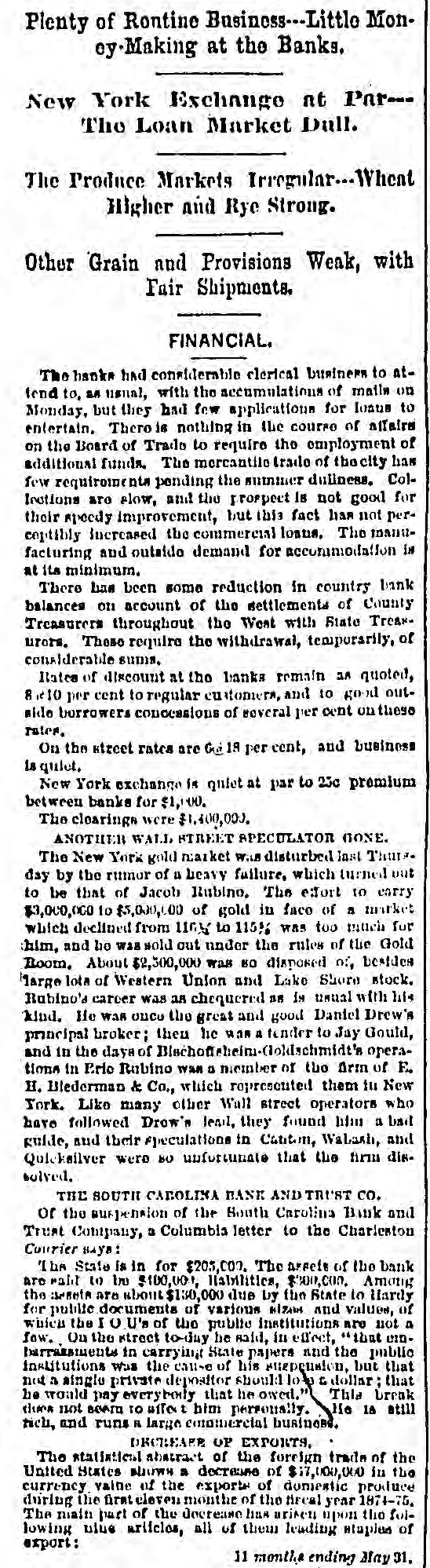 Plenty of Rontine Business---Little Money-Making at the Banks. New York Exchange nt Par--The Loan Market Dull. The Produce Markets Irregular.--Wheat Higher and Rye Strong. Other Grain and Provisions Weak, with Fair Shipments. FINANCIAL. The hanks had considerable clerical business to attend to, as usual, with the accumulations of mails on Monday, but they had few applications for loans to entertain. There is nothing in the course of affairs on the Board of Trade to require the employment of additional funds. The mercantile trade of the city has few requirements pending the summer dullness. ColInctions are slow, and the prospect Is not good for their speedy improvement, but this fact has not perceptibly increased the commercial loans, The manufacturing and outside demand for accommodation in at its minimum. There has been some reduction in country bank balances on account of the settlements of County Treasurers throughout the West with State Treasurors. These require the withdrawal, temporarily, of considerable sums, Rates of discount at the banks remain 3A quoted, 8 10 per cent to regular customers, and to good outside borrowers concessions of several per cent these rates, On the street rates are Gg 18 per cent, and business is quiet, New York exchange is quiet at par to 25c premium between banks for $1,000. The clearings were $1,400,000. ANOTHER WALL STREET SPECULATOR GONE. The New York gold market Was disturbed last There day by the rumor of a beavy failure, which turned out to be that of Jacob Rubino, The edort to carry $3,000,000 to $5,000,000 of gold in face of a market which declined from usy to 115% was too much for thim, and be was sold out under the rules of the Gold Room. About $2,300,000 was BO disposed of, besides large lota of Western Union and Lake Shore stock. Rubino's career was as chequered as is usual with his kind. He was onco the great and good Daniel Drew's principal broker; then he was a tender to Jay Gould, and in the days of Blschofisheim-Coklschmidt's operations in Eric Rubino was a member of the Arm of E. H. Blederman & Co., which represented them to New York. Like many other Wall street operators who have followed Drow's lead, they found him a bad guide, and their speculations in Catiton, Wabash, and Quicksilver were 80 unfortunate that the firm dissolved. THE SOUTH CAROLINA BANK AND TRUST co. or the suspension of the South Carolina Bank and Trust Contpany, a Columbia letter to the Charleston Courier BAYS: The State is in for $205,000. The assets of the bank are mail to be $100,001, Habilities, $300,000. Among the are about $130,000 due by the State to Hardy for public documents of various sizen and values, of which the I o U's of the public institutions are not a few. On the street to-day he said, in effect, "that embarrassments in carrying State papers and the public institutions Was the cause of his suspension, but that not a single private depositor should 10-p L dollar that he would pay everybody that he owed." This break these not BOARD TO affer t him personally. He 18 still rich, and runs R large commercial business. DECREASE OP EXPORTS, The statistical abstract of the foreign trade of the United States shows a decrease of $17,000,000 in the currency value of the exports of domestic produce during the first cleven months of the fircal year 1874-75, The main part of the docrease has Brisen upon the following ulue articles, all of them leading staples of export: 11 months ending May 31,
