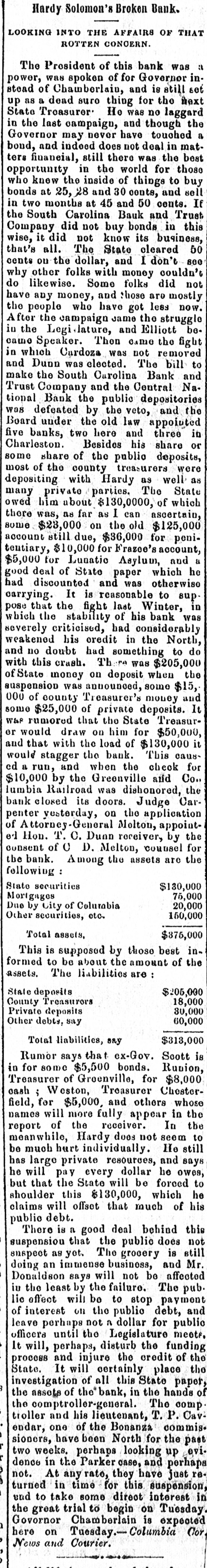 Hardy Solomon o LOOKING INTO THE AFFAIRS OF THAT ROTTEN CONOERN. The President of this bank was was spoken of for Governor instead of and set a dead suro thing for power, up as Chamberlain, is the still laggard next State Treasurer He was no in last Governor never a the may campaign, have and deal though touched in the and indeed does not matters still there was in the opportunity bond, financial, world things for the those best who know the inside of to buy bonds at 25, 28 and 30 conts, and sell in two months at 45 and 50 cents. If the South Carolina Bauk and Trust Company did not buy bonds in this wise, it did not know its business, The State the and see cents that's ou all. dollar, cleared I don't couldn't 50 why other folks with money do likewise. Some have and are any money, those folks less did mostly now. not who have got the Jame struggle in and be. the After the people Legislature, campaign the Elliott the came Thon came in was not which Speaker. Cardoza The removed bill fight to and Dunn was elected. make South Carolina and Trust and the tional Bank the the Company public Central depositories Bank Nawas defeated by the veto, and the Board under the old law appointed five banks, two here and three in Charleston. Besides his share or some share of the public deposits, most of the county treasurers were depositing with Hardy as well as many private parties. The State owed him about $130,0000, of which there was, as far as I can ascertain, some $23,000 on the old $125,000 account still due, $36,000 for penitentiary, $10,000 for Frazee's account, for Lunatic a of State paper discounted and was had good $5,000 deal Asylum, which otherwise and he It is supthat the fight last in carrying. pose stability reasonable his Winter, bank to which the of was severely criticised, had considerably weakened his oredit in the North, and no doubt had something to do with this crash. Th PA was $205,000 of State money on deposit when the suspension was announced, some $15, 000 of county Treasurer's money and some $25,000 of private deposits. It W&P rumored that the State Treasure or would draw on him for $50,000, and that with the load of $130,000 would stagger the bank. This caused a run, and when the check for $10,000 by the Greenville and Co.. lumbia Railroad was dishonored, the bank closed its doors. Judge Carpenter yesterday, on the application of Attorney General Molton, appointed Hon. T. C. Dunn receiver, by the consent of C D. Melton, counsel for the bank. Among the assets are the fellowing : State securities $130,000 75,000 Mortgages 20,000 Due by City of Columbia 150,000 Other securities, etc. Total assets, $375,000 This is supposed by those best informed to be about the amount of the assets. The liabilities are : $205,000 State deposits 18,000 County Treasurors 30,000 Private deposits 60,000 Other debts, say $313,000 Total liabilities, say Rumor says that ex-Gov. Scott is in for some $5,500 bonds. Runion, Treasurer of Greenville, for $8,000 cash ; Weston, Treasurer Chesterfield, for $5,000, and others whose names will more fully appear in the the report of the receiver. In meanwhile, Hardy does not seem to be much hurt individually. He still has large private resources, and says he will pay every dollar he owes, but that the State will be forced to shoulder this $130,000, which he claims will offset that much of his public debt. There is a good deal behind this that the public does not yet. The grocery an immense business, suspension suspect doing be and affected is still Mr. Donaldson says will not in the least by the failure. The pub. lic effect will be to stop payment of interest on the public debt, and leave perhaps not n dollar for public officers until the Legislature meets. It will, perhaps, disturb the funding process and injure the credit of the State. It will certainly place the investigation of all this State paper, the assets of the bank, in the hands of the comptroller-general. The comp troller and his lieutenant, T. P. Cav endar, one of the Bonanza commis. sioners, have been North for the past two weeks. perhaps looking up evidence in the Parker case, and perhaps not. At any rate, they have just returned in time for this suspension, und to take some direct interest in the great trial to begin on Tuesday. Governor Chamberlain is expected here on Tuesday.-Columbia Cor News and Courier.