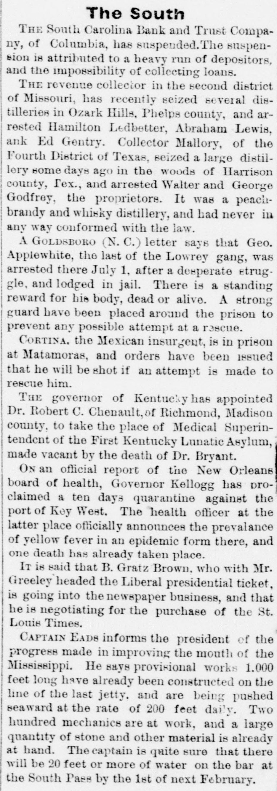 The South THE South Carolina Bank and Trust Company, of Columbia, has suspended. The suspension is attributed to a heavy run of depositors, and the impossibility of collecting loans. THE revenue collector in the second district of Missouri, has recently seized several distilleries in Ozark Hills, Phelps county, and arrested Hamilton Ledbetter, Abraham Lewis, ank Ed Gentry. Collector Mallory, of the Fourth District of Texas, seized a large distillery some days ago in the woods of Harrison county, Tex., and arrested Walter and George Godfrey, the proprietors. It was a peachbrandy and whisky distillery, and had never in any way conformed with the law. A GOLDSBORO (N. C.) letter says that Geo. Applewhite, the last of the Lowrey gang, was arrested there July 1, after a desperate struggle, and lodged in jail. There is a standing reward for his body, dead or alive. A strong guard have been placed around the prison to prevent any possible attempt at a rescue. CORTINA. the Mexican insurgent, is in prison at Matamoras, and orders have been issued that he will be shot if an attempt is made to rescue him. THE governor of Kentucky has appointed Dr. Robert C. Chenault, of Richmond, Madison county, to take the place of Medical Superintendent of the First Kentucky Lunatic Asylum, made vacant by the death of Dr. Bryant. ON an official report of the New Orleans board of health, Governor Kellogg has proclaimed a ten days quarantine against the port of Key West. The health officer at the latter place officially announces the prevalance of yellow fever in an epidemic form there, and one death has already taken place. IT is said that B. Gratz Brown. who with Mr. Greeley headed the Liberal presidential ticket, is going into the newspaper business, and that he is negotiating for the purchase of the St. Louis Times. CAPTAIN EADS informs the president of the progress made in improving the mouth of the Mississippi. He says provisional works 1.000 feet long have already been constructed on the line of the last jetty, and are being pushed seaward at the rate of 200 feet daily. Two hundred mechanics are at work, and a large quantity of stone and other material is already at hand. The captain is quite sure that there will be 20 feet or more of water on the bar at the South Pass by the 1st of next February.