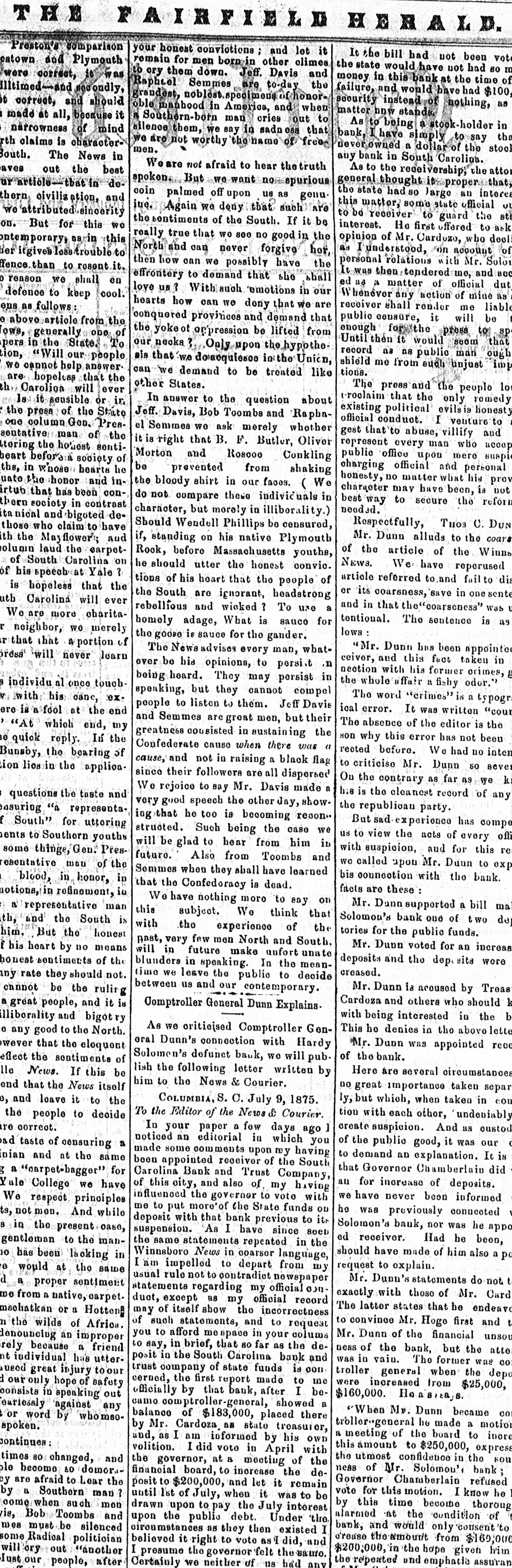 We are not afraid to hear the truth But we want no spurious n palmed off upon us as genu Again we deny that such are sentiments of the South. If it be true that WO 800 no good in the and can never forgive hor how can we possibly have th contery to demand that she shal us ? With such emotions in ou how can we deny that we ar quered provinces and demand tha yokeot orpression be lifted from necks Only upon the hypothe that w.e do in the Union we demand to be treated lik States. In answer to the question abou Davis, Bob Toombs and Rapha Semmes we ask merely whethe right that B. F. Butler, Olive and Roscoe Conklin prevented from shaking bloody shirt in our faces. ( W not compare these individuals i aracter, but morely in illiborality. ould Wendell Phillips be censured standing on his native Plymout before Massachusetts youth should utter the honest convic of his heart that the people o South are ignorant, headstron bellious and winked ? To use mely adage, What is sauce fo goose is sauce for the gander. The News advises every man, what be bis opinions, to persi.t heard. They may persist i eaking, but they cannot compe ople to listen to them. Jeff Davi Semmes are great men, but thei eatness consisted in sustaining th ufederate cause when there was and not in raising a black fla their followers are all disperse 0 rejoice to say Mr. Davis made good speech the other day, show that he too is becoming recon cuoted. Such being the case W be glad to hear from him i Also from Toombs and mmes when they shall have learned the Confederacy is dead. We have nothing more to say of subject. We think tha the experience of th very few men North and South in future make unfort unat unders in speaking. In the mean we leave the public to decid tween us and our contemporary. Jomptroller General Dunn Explains. As we oriticised Comptroller Gen Dunn's connection with Hard lomen's defunct bank, we will pub the following letter written b) to the News & Courier. COLUMBIA, S. C. July 9, 1875. the Editor of the News & Courier. In your paper a few days ago an editorial in which you some comments upon my having appointed receiver of the South rolina Bank and Trust Company this city, and also of my having luenoed the governor to vote with to put more'of the State funds 01 posit with that bank previous to it spension. As I have since seet same statements repeated in the innsboro News in coarser language in impelled to depart from my rule not to contradict newspaper tements regarding my official on except as my official record of itself show the incorrectness such statements, and to request to afford me space in your colums in brief, that 80 far as the dein the South Carolina bank and company of state funds is con the first report made to me cially by that bank, after I be comptroller-general, showed a of $183,000, placed there Mr. Cardoza as state treasurer, as I am informed by his own did vote in with