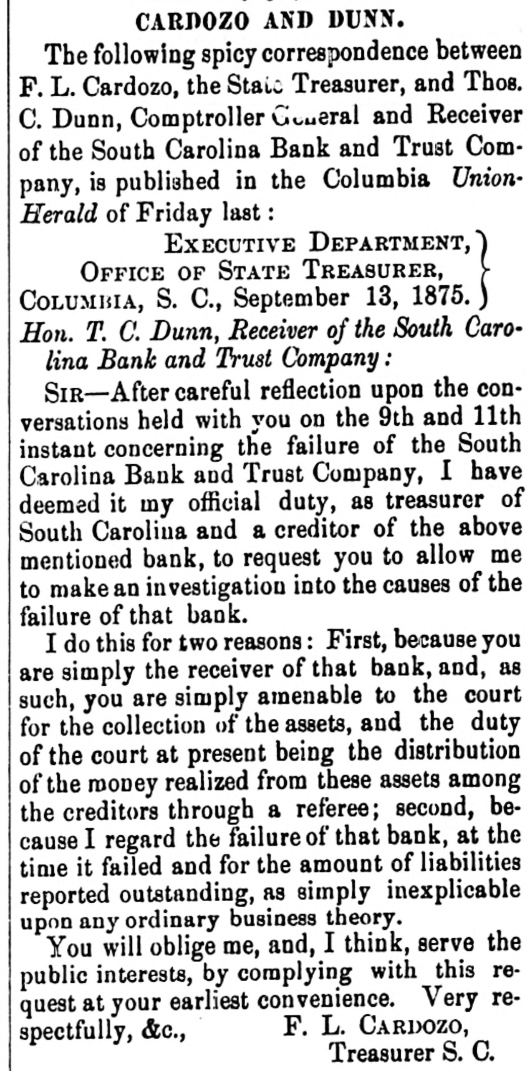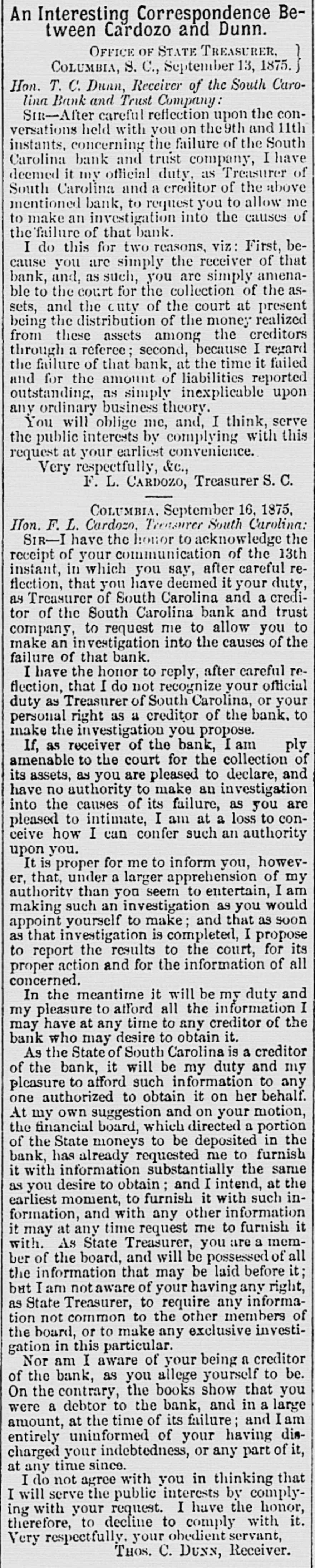 CARDOZO AND DUNN. The following spicy correspondence between F. L. Cardozo, the State Treasurer, and Thos. C. Dunn, Comptroller General and Receiver of the South Carolina Bank and Trust Company, is published in the Columbia UnionHerald of Friday last: EXECUTIVE DEPARTMENT, OFFICE OF STATE TREASURER, ~~~ COLUMBIA, S. C., September 13, 1875. Hon. T. C. Dunn, Receiver of the South Carolina Bank and Trust Company: SIR-After careful reflection upon the conversations held with you on the 9th and 11th instant concerning the failure of the South Carolina Bank and Trust Company, I have deemed it my official duty, as treasurer of South Carolina and a creditor of the above mentioned bank, to request you to allow me to make an investigation into the causes of the failure of that bank. I do this for two reasons: First, because you are simply the receiver of that bank, and, as such, you are simply amenable to the court for the collection of the assets, and the duty of the court at present being the distribution of the money realized from these assets among the creditors through a referee; second, because I regard the failure of that bank, at the time it failed and for the amount of liabilities reported outstanding, as simply inexplicable upon any ordinary business theory. You will oblige me, and, I think, serve the public interests, by complying with this request at your earliest convenience. Very reF. L. CARDOZO, spectfully, &c., Treasurer S. C.