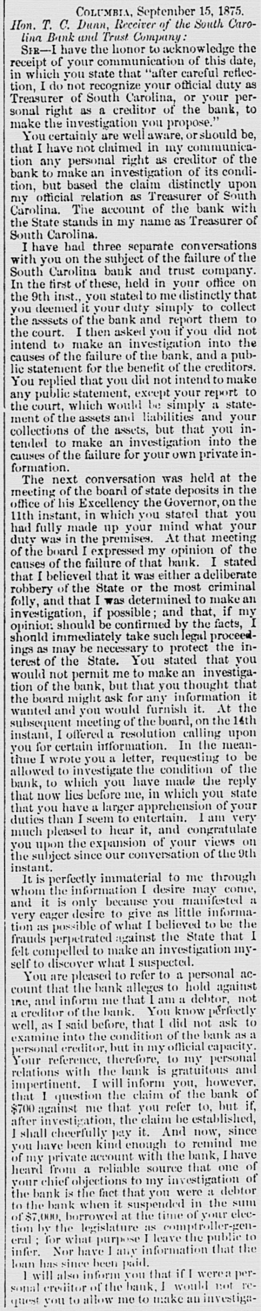 COLUMBIA, September 15, 18 Hon. T. C. Dunn, Receiver of the South ( lina Bank and Trust Company: SIR-I have the honor to acknowledge receipt of your communication of this i in which you state that "after careful re tion, I do not recognize your official du Treasurer of South Carolina, or your sonal right as a creditor of the banl make the investigation you propose." You certainly are well aware, or should that I have not claimed in my commut tion any personal right as creditor of bank to make an investigation of its e tion, but based the claim distinctly 1 my official relation as Treasurer of S Carolina. The account of the bank the State stands in my name as Treasur South Carolina. I have had three separate conversation with you on the subject of the failure 0 South Carolina bank and trust comp In the first of these, held in your office the 9th inst., you stated to me distinctly you deemed it your duty simply to eo the asssets of the bank and report ther the court. I then asked you if you did intend to make an investigation into causes of the failure of the bank, and a lic statement for the benefit of the credi You replied that you did not intend to I any public statement, except your repor the court, which would be simply a S ment of the assets and liabilities and collections of the assets, but that you tended to make an investigation into causes of the failure for your own privat formation. The next conversation was held at meeting of the board of state deposits in office of his Excellency the Governor, or 11th instant, in which you stated that had fully made up your mind what duty was in the premises. At that med of the board I expressed my opinion of causes of the failure of that bank. I st that I believed that it was either a delib robbery of the State or the most crim folly, and that I was determined to make investigation, if possible; and that, if opinion: should be confirmed by the fact should immediately take such legal pro ings as may be necessary to protect the terest of the State. You stated that would not permit me to make an inves tion of the bank, but that you thought the board might ask for any informatic wanted and you would furnish it. At subsequent meeting of the board, on the instant, I offered a resolution calling i you for certain information. In the ni time I wrote you a letter, requesting t allowed to investigate the condition of bank, to which you have made the I that now lies before me, in which you that you have a larger apprehension of duties than I seem to entertain. 1 am much pleased to hear it, and congrati you upon the expansion of your views the subject since our conversation of th instant. It is perfectly immaterial to me thre whom the information I desire may c and it is only because you manifest very eager desire to give as little info