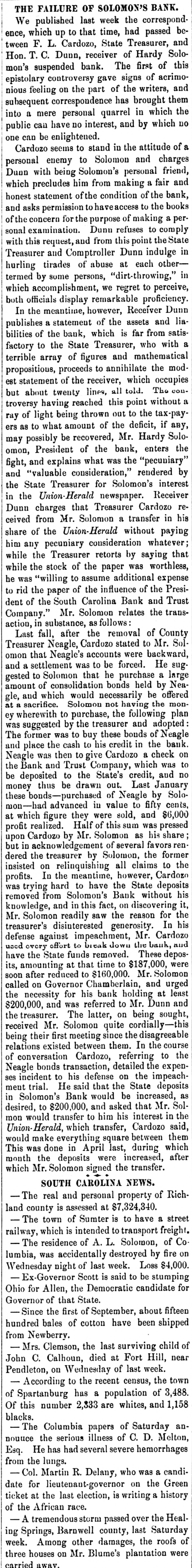 epistolary controversy gave signs of acrimonious feeling on the part of the writers, and subsequent correspondence has brought them into a mere personal quarrel in which the public can have no interest, and by which no one can be enlightened. Cardozo seems to stand in the attitude of a personal enemy to Solomon and charges Duon with being Solomon's personal friend, which precludes him from making a fair and honest statement of the condition of the bank, and asks permission to haveaccess to the books of the concern for the purpose of making a personal examination. Dunn refuses to comply with this request, and from this point the State Treasurer and Comptroller Dunn indulge in hurling tirades of abuse at each othertermed by some persons, "dirt-throwing," in which accomplishment, we regret to perceive, both officials display remarkable proficiency. In the meantime, however, Receiver Dunn publishes a statement of the assets and liabilities of the bank, which is far from satisfactory to the State Treasurer, who with a terrible array of figures and mathematical propositious, proceeds to annihilate the modest statement of the receiver, which occupies but about twenty lines, all told. The controversy having reached this point without a ray of light being thrown out to the tax-payers as to what amount of the deficit, if any, may possibly be recovered, Mr. Hardy Soloomon, President of the bank, enters the fight, and explains what was the "pecuniary" and "valuable consideration," rendered by the State Treasurer for Solomon's interest in the Union Herald newspaper. Receiver Dunn charges that Treasurer Cardozo received from Mr. Solomon a transfer in his share of the Union-Herald without paying him any pecuniary consideration whatever while the Treasurer retorts by saying that while the stock of the paper was worthless, he was "willing to assume additional expense to rid the paper of the influence of the President of the South Carolina Bank and Trust Company." Mr. Solomon relates the transaction, in substance, as follows: Last fall, after the removal of County Treasurer Neagle, Cardozo stated to Mr. Solomon that Neagle's accounts were backward, and a settlement was to be forced. He suggested to Solomon that he purchase a large amount of consolidation bonds held by Neagle, and which would necessarily be offered at a sacrifice. Solomon not having the money wherewith to purchase, the following plan was suggested by the treasurer and adopted The former was to buy these bonds of Neagle and place the cash to his credit in the bank. Neagle was then to give Cardozo a check on the Bank and Trust Company, which was to be deposited to the State's credit, and no money thus be drawn out. Last January these bonds-purchased of Neagle by Solomon-had advanced in value to fifty cents, at which figure they were sold, and $6,000 profit realized. Half of this sum was pressed upon Cardozo by Mr. Solomon as his share but in acknowledgement of several favors ren dered the treasurer by Solomon, the former insisted on relinquishing all claims to the profits. In the meantime, however, Cardozo was trying hard to have the State deposits removed from Solomon's Bank without his knowledge, and in this fact, on discovering it, Mr. Solomon readily saw the reason for the treasurer's disinterested generosity. In his defense against impeachment, Mr. Cardozo used overy offort to break down the bank, and have the State funds removed. These deposits, amounting at that time to $187,000, were soon after reduced to $160,000. Mr. Solomon called on Governor Chamberlain, and urged the necessity for his bank holding at least $200,000, and was referred to Mr. Dunn and the treasurer. The latter, on being sought, received Mr. Solomon quite cordially-this being their first meeting since the disagreeable relations existed between them. In the course of conversation Cardozo, referring to the Neagle bonds transaction, detailed the expenses incident to his defense on the impeachment trial. He said that the State deposits in Solomon's Bank would be increased, as desired, to $200,000, and asked that Mr. Solmon would transfer to him his interest in the Union-Herald, which transfer, Cardozo said, would make everything square between them This was done in April last, during which month the deposits were increased, after which Mr. Solomon signed the transfer. SOUTH CAROLINA NEWS. - The real and personal property of Richland county is assessed at $7,324,340. - The town of Sumter is to have a street railway, which is intended to transport freight. - The residence of A. L. Solomon, of Co lumbia, was accidentally destroyed by fire on Wednesday night of last week. Loss $4,000. - Ex-Governor Scott is said to be stumping Ohio for Allen, the Democratic candidate for Governor of that State. Since the first of September, about fifteen hundred bales of cotton have been shipped from Newberry. - Mrs. Clemson, the last surviving child of John C. Calhoun, died at Fort Hill, near Pendleton, on Wednesday of last week. - According to the recent census, the town of Spartanburg has a population of 3,488. Of this number 2,333 are whites, and 1,158 blacks. - The Columbia papers of Saturday announce the serious illness of C. D. Melton, Esq. He has had several severe hemorrhages from the lungs. - Col. Martin R. Delany, who was a candidate for lieutenant-governor on the Green ticket at the last election, is writing a history of the African race.