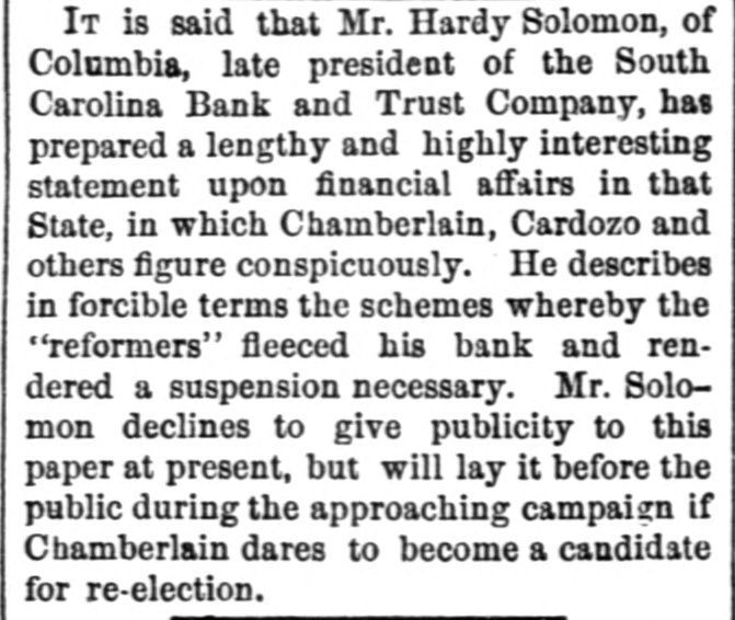 It is said that Mr. Hardy Solomon, of Columbia, late president of the South Carolina Bank and Trust Company, has prepared a lengthy and highly interesting statement upon financial affairs in that State, in which Chamberlain, Cardozo and others figure conspicuously. He describes in forcible terms the schemes whereby the "reformers" fleeced his bank and rendered a suspension necessary. Mr. Solomon declines to give publicity to this paper at present, but will lay it before the public during the approaching campaign if Chamberlain dares to become a candidate for re-election.