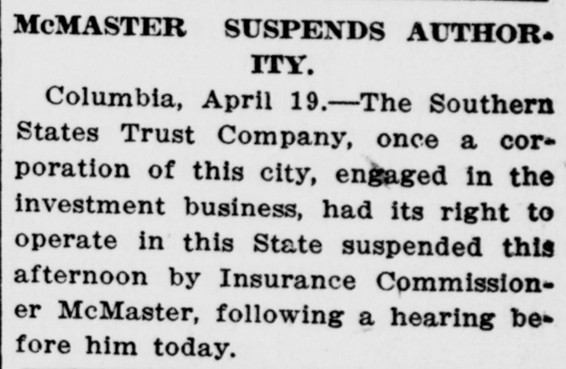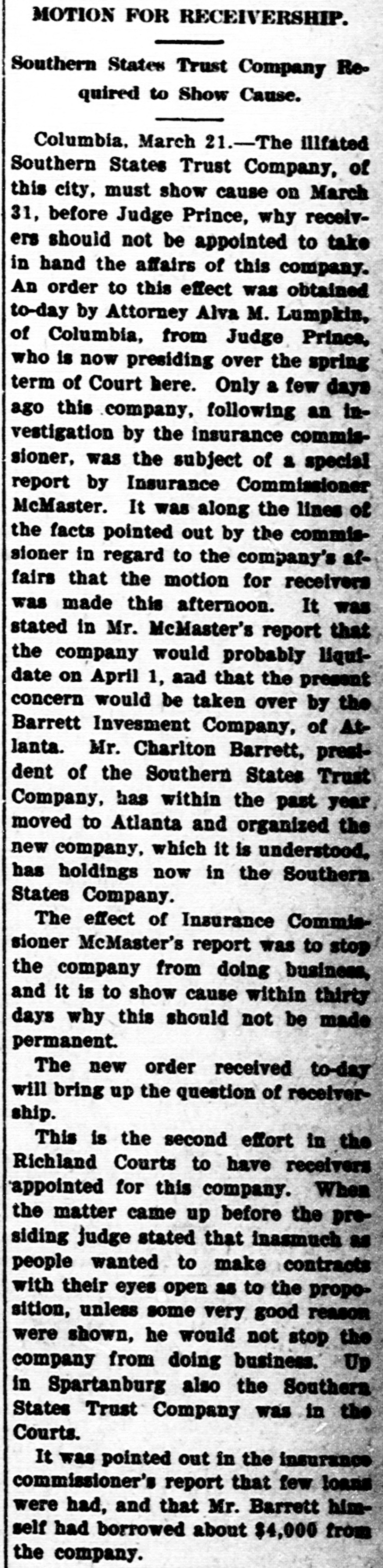 MOTION FOR RECEIVERSHIP. Southern States Trust Company Re. quired to Show Cause. Columbia. March 21.-The illfated Southern States Trust Company, of this city, must show cause on March 31, before Judge Prince, why receivers should not be appointed to take in hand the affairs of this company. An order to this effect was obtained to-day by Attorney Alva M. Lumpkin, of Columbia, from Judge Prince, who is now presiding over the spring term of Court here. Only a few days ago this company, following an investigation by the insurance commissioner, was the subject of a special report by Insurance Commissioner McMaster. It was along the lines of the facts pointed out by the commissioner in regard to the company's atfairs that the motion for receivers was made this afternoon. It was stated in Mr. McMaster's report that the company would probably liquidate on April 1, and that the present concern would be taken over by the Barrett Invesment Company, of Atlanta. Mr. Chariton Barrett, prestdent of the Southern States Trust Company, has within the past year moved to Atlanta and organized the new company, which it is understood. has holdings now in the Southern States Company. The effect of Insurance Commissioner McMaster's report was to stop the company from doing business, and it is to show cause within thirty days why this should not be made permanent. The new order received to-day will bring up the question of receiver ship. This is the second effort in the Richland Courts to have receivers appointed for this company. When the matter came up before the prosiding judge stated that inasmuch as people wanted to make contracts with their eyes open as to the proposition, unless some very good reason were shown, he would not stop the company from doing business. Up in Spartanburg also the Southern States Trust Company was in the Courts. It was pointed out in the insurance commissioner's report that few loans were had, and that Mr. Barrett himself had borrowed about $4,000 from the company.
